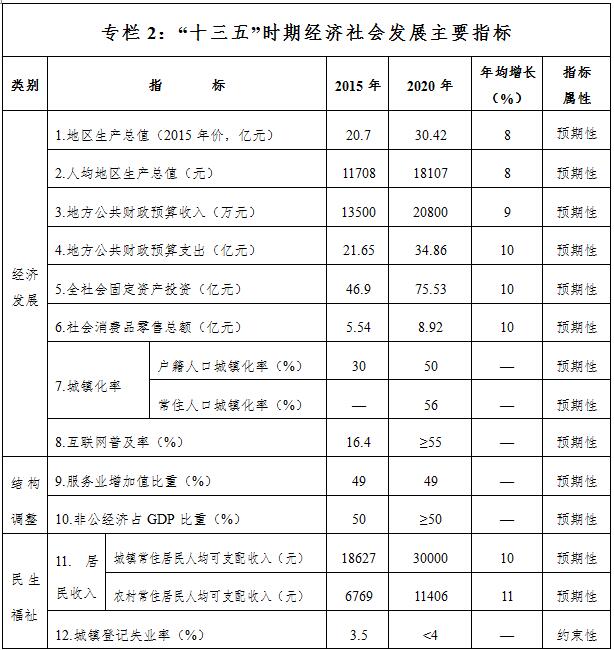 到2020年,完成地区生产总值30.4亿元,年均增长8%;地方财政一般预算收入2.08亿元,年均增长9%;全社会固定资产完成75.5亿元,年均增长10%;城镇居民人均可支配收入30000元,年均增长10%;农村居民人均可支配收入11406元,年均增长11%,发展程度在全市处于中上水平。