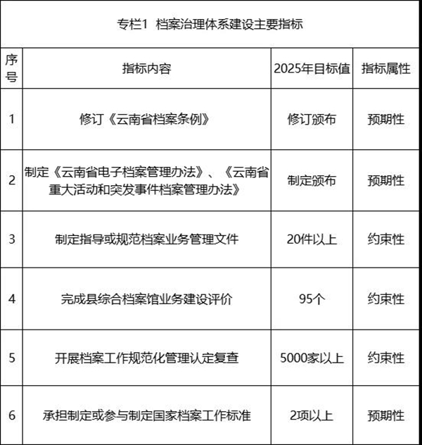 到2025年,档案工作走向依法治理、走向开放、走向现代化取得实质性进展,基本形成与新时代中国特色社会主义事业相适应的档案事业发展新局面,在建设我国民族团结进步示范区、生态文明建设排头兵、面向南亚东南亚辐射中心中更好地发挥档案工作的基础性、支撑性作用。
