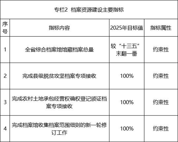 16.加快传统载体档案数字化。加快推进综合档案馆馆藏档案数字化工作,建立健全数字档案成果移交与接收制度。鼓励开展录音录像等其他载体档案的数字化工作。到2025年,全省综合档案馆馆藏应数字化档案数字化率达到80%以上,全部完成馆藏国家重点档案数字化,力争州(市)级以上综合档案馆馆藏录音录像档案数字化率达到100%。