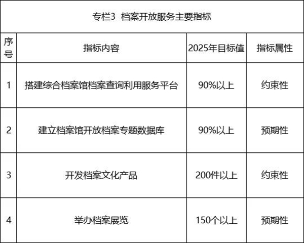 ——档案利用服务达到新水平。持续推进档案利用体系建设,档案查询利用更加便捷、文化产品更加丰富、传播方式更加多样,公共服务和社会教育功能更加凸显。