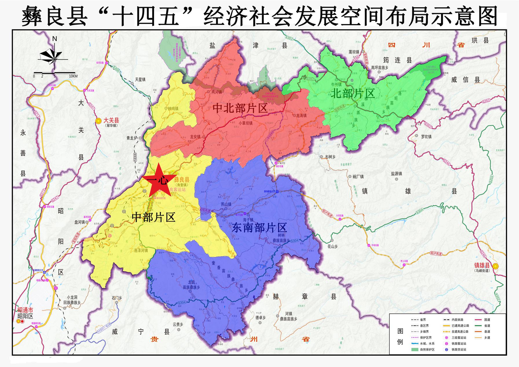 为加快彝良高质量跨越发展,根据经济社会发展需要,综合考虑人口和资源环境承载能力,结合全县产业发展、城镇建设、基础设施等发展要素,按照功能协调互动、产业相对集聚、区域联动协作的原则,构建“一心四片”的经济发展空间布局。
