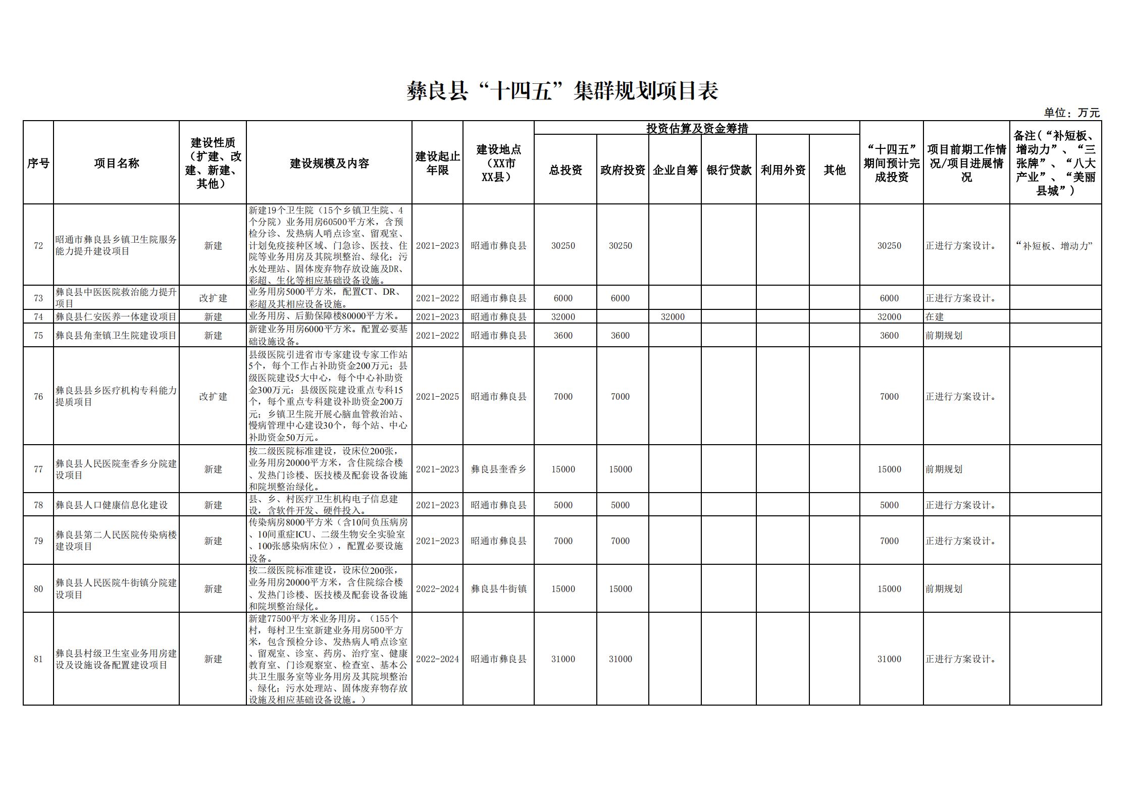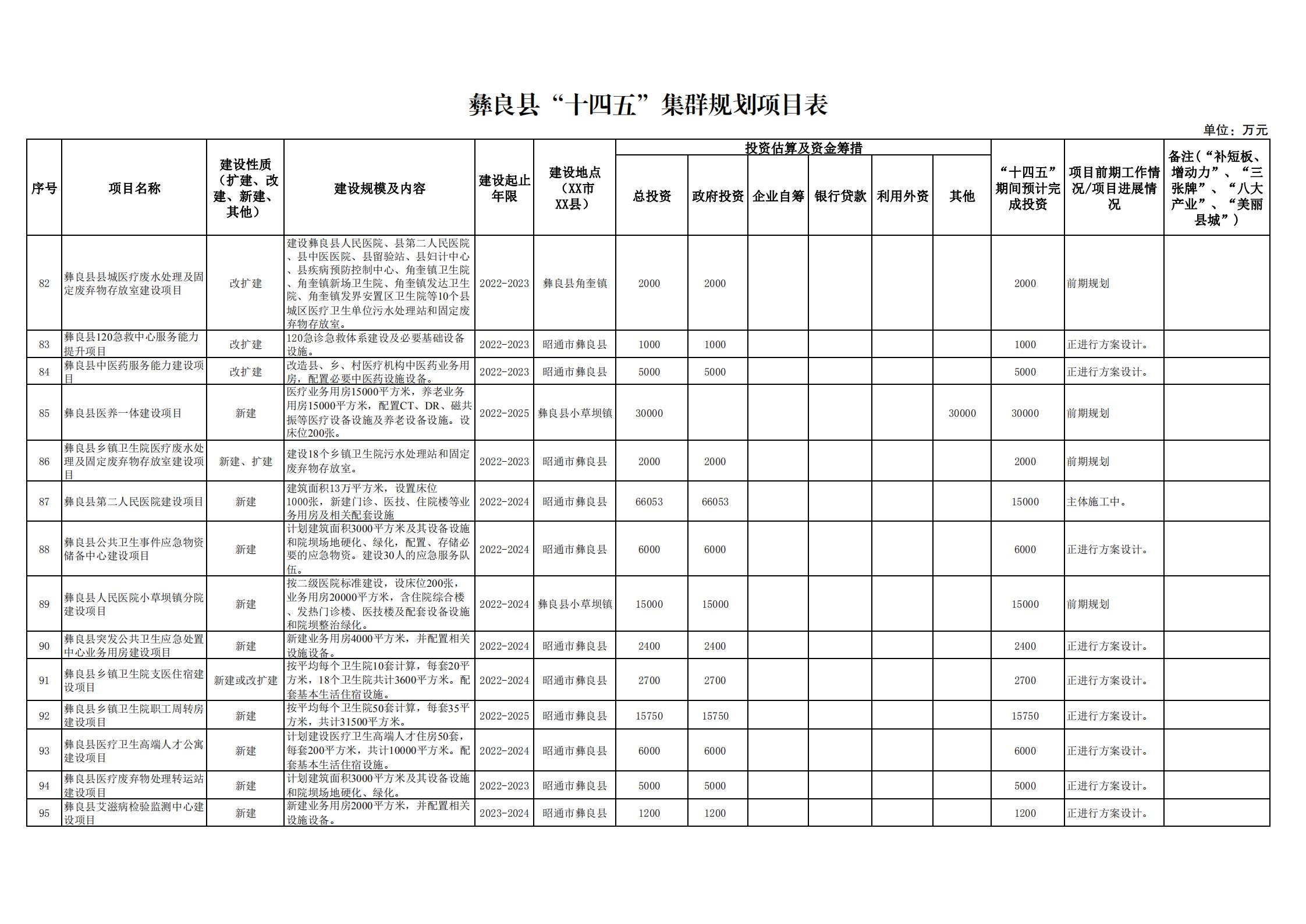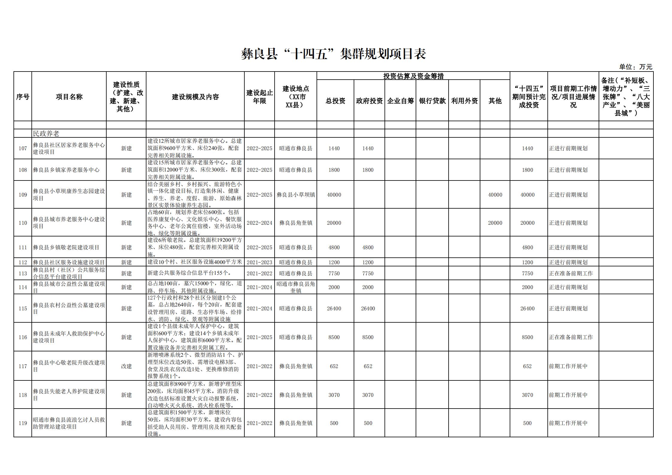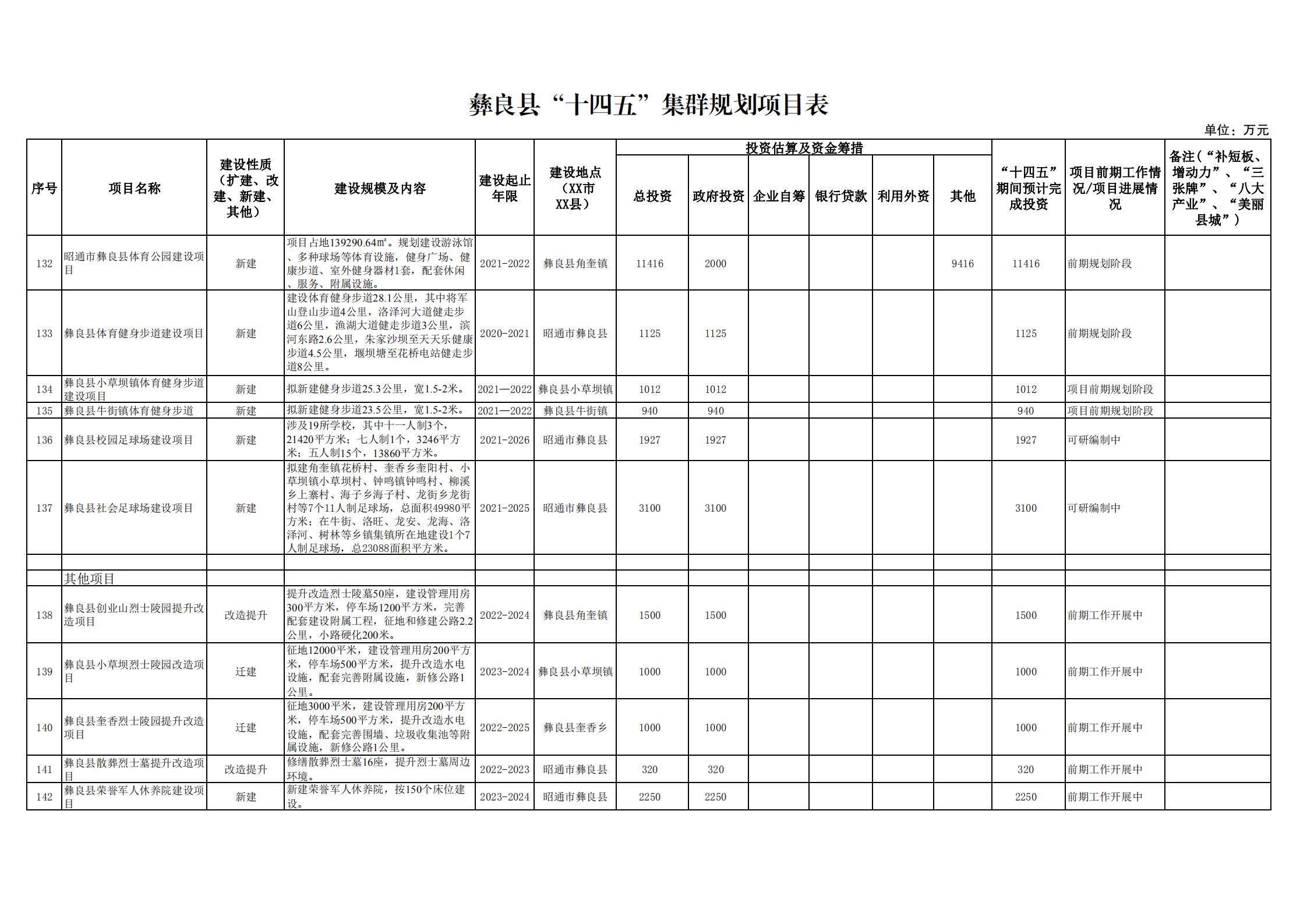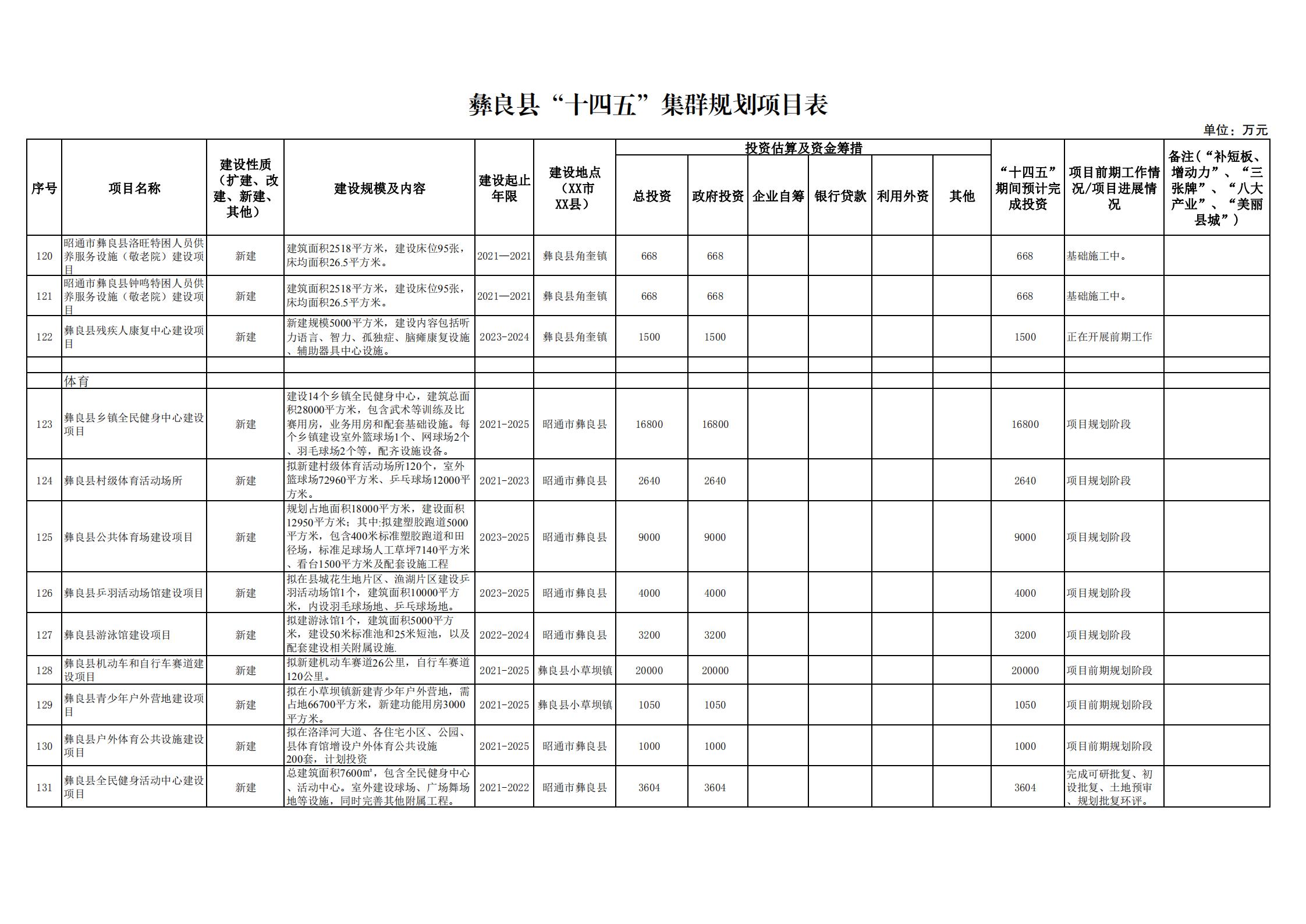 教育领域。推进彝良县村级幼儿园建设、彝良县幼儿园南校区建设、彝良县幼儿园东校区建设、彝良县角奎镇第二幼儿园建设、彝良县角奎镇第三幼儿园建设、彝良县角奎镇第四幼儿园建设、彝良县角奎镇第五幼儿园建设、彝良县角奎镇中心幼儿园建设、彝良县角奎镇新场幼儿园建设、彝良县白岩高铁新区第一幼儿园建设、彝良县白岩高铁新区第二幼儿园建设、彝良县白岩高铁新区第三幼儿园建设、彝良县角奎镇塘房小学建设、彝良县白岩高铁新区小学建设、彝良县小草坝镇小草坝村小学建设、彝良县小草坝镇宝藏村宝藏小学建设、彝良县民族小学建设、彝良县角奎镇花生地小学建设、彝良县乡村小学建设、彝良县角奎镇新场中学建设、彝良县洛旺乡中学建设、彝良县小草坝镇中学建设、彝良县洛泽河镇毛坪中学迁建、彝良县角奎镇中学迁建、彝良县角奎镇花生地中学、彝良县白岩高铁新区初级中学建设、彝良县第一中学扩建、彝良县民族中学、彝良县第四中学建设、彝良县特殊教育学校建设、彝良县乡村教师周转宿舍建设、彝良县幼儿园及中小学校设施设备购置、彝良县老年学校建设、彝良县乡镇老年学校建设、彝良县体育艺术学校建设、彝良县炳辉小学建设、彝良县义务教育能力提升、彝良县新城中学建设、彝良县学校集中改厕、彝良县职业技术高级中学建设等项目实施。 卫生领域。推进彝良县人民医院医技综合楼建设、彝良县中医医院业务用房建设、彝良县中医医院发热门诊建设、彝良县疾病预防控制中心服务能力提升、彝良县妇幼保健计生服务中心服务能力提升、彝良县中医医院中医药服务能力提升建设、彝良县疾病预防控制中心实验室、彝良县人民医院发热门诊建设、彝良县中医医院中医药特色重点专科建设、彝良县人民医院救治能力提升、彝良县应急抢救设施配置、彝良县留验站建设、彝良县体检中心业务用房建设、昭通市彝良县乡镇卫生院服务能力提升建设、彝良县中医医院救治能力提升、彝良县仁安医养一体建设、彝良县角奎镇卫生院建设、彝良县县乡医疗机构专科能力提质、彝良县人民医院奎香乡分院建设、彝良县人口健康信息化建设、彝良县第二人民医院传染病楼建设、彝良县人民医院牛街镇分院建设、彝良县村级卫生室业务用房建设及设施设备配置建设、彝良县县城医疗废水处理及固定废弃物存放室建设、彝良县120急救中心服务能力提升、彝良县中医药服务能力建设、彝良县医养一体建设、彝良县乡镇卫生院医疗废水处理及固定废弃物存放室建设、彝良县第二人民医院建设、彝良县公共卫生事件应急物资储备中心建设、彝良县人民医院小草坝镇分院建设、彝良县突发公共卫生应急处置中心业务用房建设、彝良县乡镇卫生院支医住宿建设、彝良县乡镇卫生院职工周转房建设、彝良县医疗卫生高端人才公寓建设、彝良县医疗废弃物处理转运站建设、彝良县艾滋病检验监测中心建设、彝良县医疗废弃物处理站建设、彝良县人民医院医养一体建设、彝良县海子乡中心卫生院建设、彝良县全民健康体检、彝良县基本公共卫生服务、彝良县重大公共卫生服务、彝良县卫生专业人才培养、彝良县爱国卫生运动等项目实施。 文化事业领域。推进彝良县图书文化馆提升改造、彝良县乡镇文化站建设、彝良县文化园建设、彝良县行政村(社区)综合性文化服务中心建设、彝良县罗炳辉将军纪念馆扩建、彝良县奎香长征纪念广场扩建、彝良县镇彝威地下党支部旧址修复、彝良县红二六军团指挥部旧址修复、彝良县乌蒙回旋战博物馆建设、罗炳辉将军故居提升改造、彝良县罗炳辉将军纪念馆公园、彝良县非遗保护传承展示中心、彝良县苗族传统节日场地建设等项目实施。 民政养老领域。推进彝良县社区居家养老服务中心建设、彝良县农村居家养老服务中心、彝良县小草坝康养生态园建设、彝良县城市养老服务中心建设、彝良县乡镇敬老院建设、彝良县社区服务设施建设、彝良县村(社区)公共服务综合信息平台建设、彝良县城市公益性公墓(骨灰堂)建设、彝良县农村公益性公墓(骨灰堂)建设、彝良县未成年人救助保护中心建设、彝良县中心敬老院升级改建、彝良县失能老人养护院建设、昭通市彝良县流浪乞讨人员救助管理站建设、昭通市彝良县洛旺特困人员供养服务设施(敬老院)建设、昭通市彝良县钟鸣特困人员供养服务设施(敬老院)建设、彝良县残疾人康复中心建设等项目实施。 体育领域。推进彝良县乡镇全民健身中心建设、彝良县村级体育活动场所、彝良县公共体育场建设、彝良县乒羽活动场馆建设、彝良县游泳馆建设、彝良县机动车和自行车赛道建设、彝良县青少年户外营地建设、彝良县户外体育公共设施建设、彝良县全民健身活动中心建设、昭通市彝良县体育公园建设、彝良县体育健身步道建设、彝良县小草坝镇体育健身步道建设、彝良县牛街镇体育健身步道、彝良县校园足球场建设、彝良县社会足球场建设等项目实施。 其他项目。推进彝良县创业山烈士陵园提升改造、彝良县小草坝烈士陵园改造、彝良县奎香烈士陵园提升改造、彝良县散葬烈士墓提升改造、彝良县荣誉军人休养院建设、彝良县职业技能培训基地建设、彝良县劳务创业市场基地建设