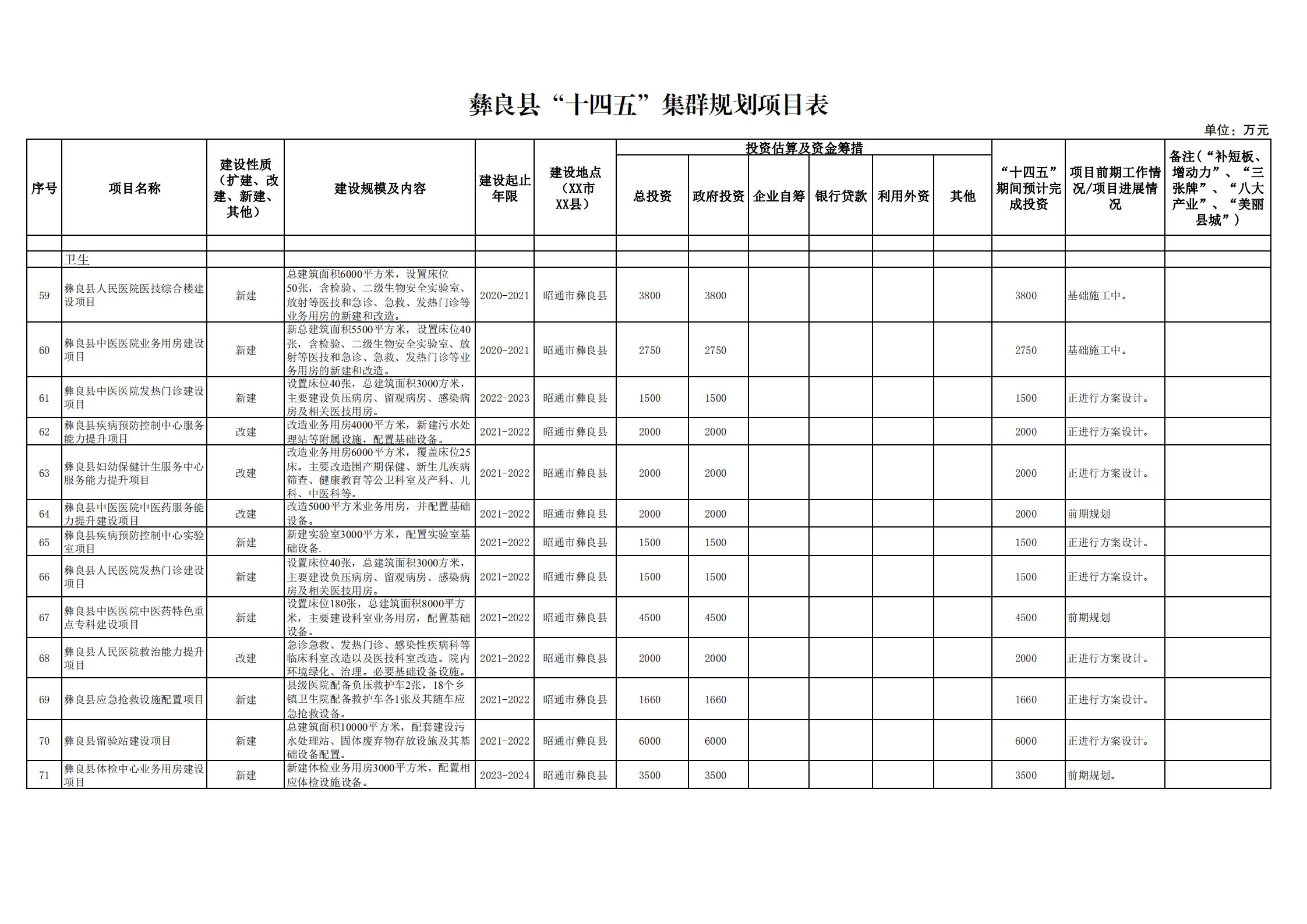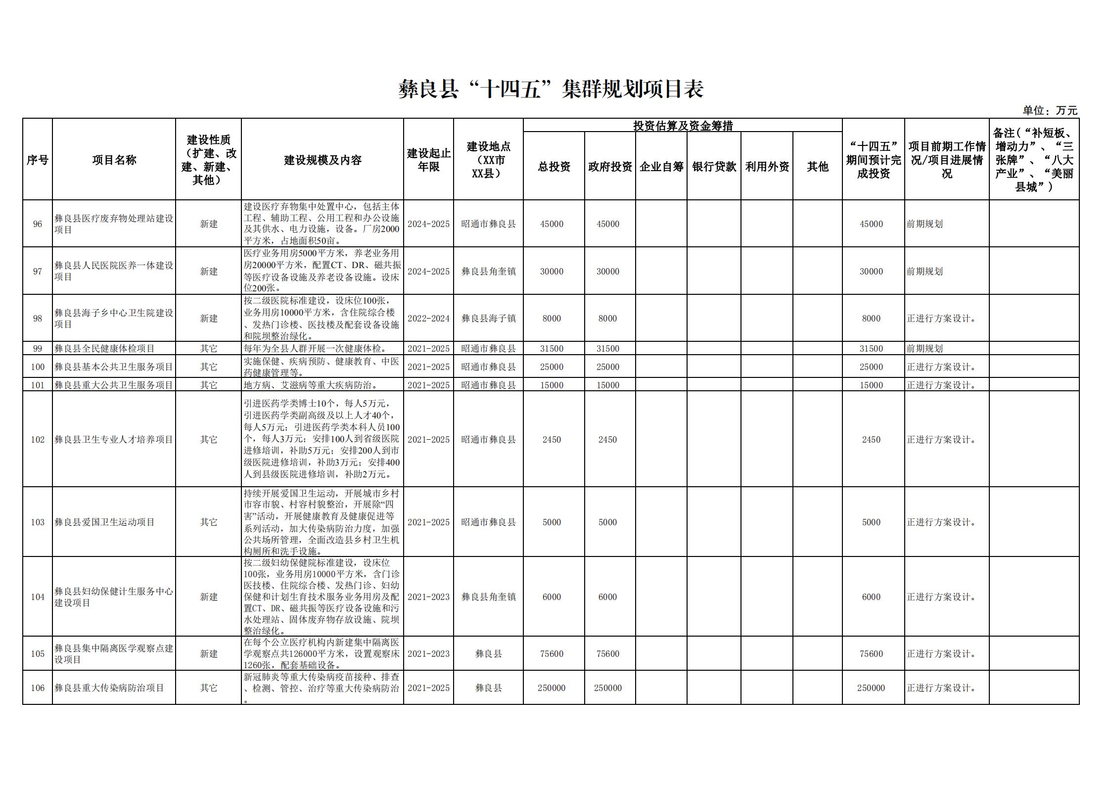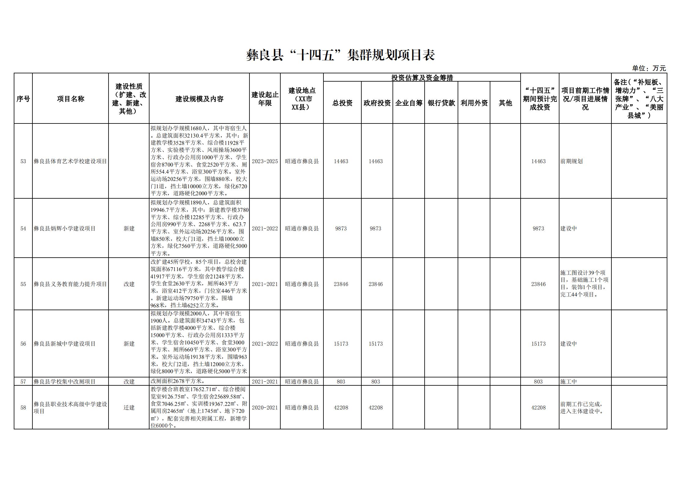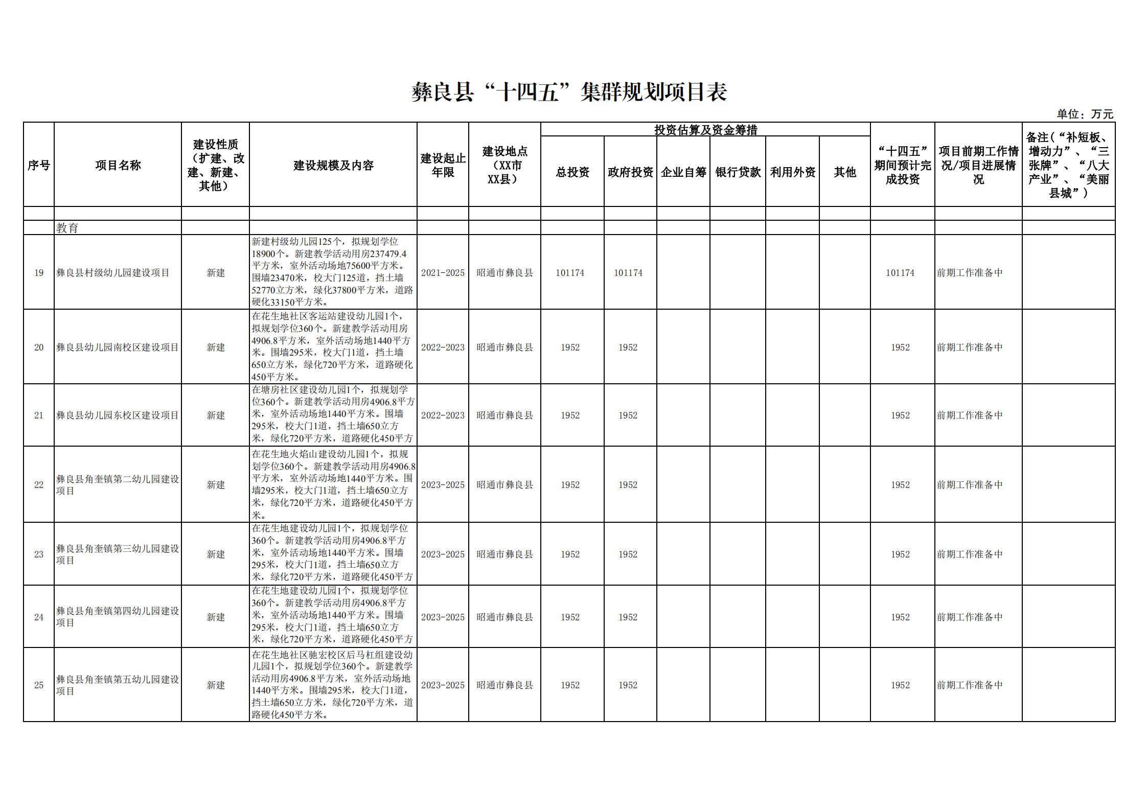 教育领域。推进彝良县村级幼儿园建设、彝良县幼儿园南校区建设、彝良县幼儿园东校区建设、彝良县角奎镇第二幼儿园建设、彝良县角奎镇第三幼儿园建设、彝良县角奎镇第四幼儿园建设、彝良县角奎镇第五幼儿园建设、彝良县角奎镇中心幼儿园建设、彝良县角奎镇新场幼儿园建设、彝良县白岩高铁新区第一幼儿园建设、彝良县白岩高铁新区第二幼儿园建设、彝良县白岩高铁新区第三幼儿园建设、彝良县角奎镇塘房小学建设、彝良县白岩高铁新区小学建设、彝良县小草坝镇小草坝村小学建设、彝良县小草坝镇宝藏村宝藏小学建设、彝良县民族小学建设、彝良县角奎镇花生地小学建设、彝良县乡村小学建设、彝良县角奎镇新场中学建设、彝良县洛旺乡中学建设、彝良县小草坝镇中学建设、彝良县洛泽河镇毛坪中学迁建、彝良县角奎镇中学迁建、彝良县角奎镇花生地中学、彝良县白岩高铁新区初级中学建设、彝良县第一中学扩建、彝良县民族中学、彝良县第四中学建设、彝良县特殊教育学校建设、彝良县乡村教师周转宿舍建设、彝良县幼儿园及中小学校设施设备购置、彝良县老年学校建设、彝良县乡镇老年学校建设、彝良县体育艺术学校建设、彝良县炳辉小学建设、彝良县义务教育能力提升、彝良县新城中学建设、彝良县学校集中改厕、彝良县职业技术高级中学建设等项目实施。 卫生领域。推进彝良县人民医院医技综合楼建设、彝良县中医医院业务用房建设、彝良县中医医院发热门诊建设、彝良县疾病预防控制中心服务能力提升、彝良县妇幼保健计生服务中心服务能力提升、彝良县中医医院中医药服务能力提升建设、彝良县疾病预防控制中心实验室、彝良县人民医院发热门诊建设、彝良县中医医院中医药特色重点专科建设、彝良县人民医院救治能力提升、彝良县应急抢救设施配置、彝良县留验站建设、彝良县体检中心业务用房建设、昭通市彝良县乡镇卫生院服务能力提升建设、彝良县中医医院救治能力提升、彝良县仁安医养一体建设、彝良县角奎镇卫生院建设、彝良县县乡医疗机构专科能力提质、彝良县人民医院奎香乡分院建设、彝良县人口健康信息化建设、彝良县第二人民医院传染病楼建设、彝良县人民医院牛街镇分院建设、彝良县村级卫生室业务用房建设及设施设备配置建设、彝良县县城医疗废水处理及固定废弃物存放室建设、彝良县120急救中心服务能力提升、彝良县中医药服务能力建设、彝良县医养一体建设、彝良县乡镇卫生院医疗废水处理及固定废弃物存放室建设、彝良县第二人民医院建设、彝良县公共卫生事件应急物资储备中心建设、彝良县人民医院小草坝镇分院建设、彝良县突发公共卫生应急处置中心业务用房建设、彝良县乡镇卫生院支医住宿建设、彝良县乡镇卫生院职工周转房建设、彝良县医疗卫生高端人才公寓建设、彝良县医疗废弃物处理转运站建设、彝良县艾滋病检验监测中心建设、彝良县医疗废弃物处理站建设、彝良县人民医院医养一体建设、彝良县海子乡中心卫生院建设、彝良县全民健康体检、彝良县基本公共卫生服务、彝良县重大公共卫生服务、彝良县卫生专业人才培养、彝良县爱国卫生运动等项目实施。 文化事业领域。推进彝良县图书文化馆提升改造、彝良县乡镇文化站建设、彝良县文化园建设、彝良县行政村(社区)综合性文化服务中心建设、彝良县罗炳辉将军纪念馆扩建、彝良县奎香长征纪念广场扩建、彝良县镇彝威地下党支部旧址修复、彝良县红二六军团指挥部旧址修复、彝良县乌蒙回旋战博物馆建设、罗炳辉将军故居提升改造、彝良县罗炳辉将军纪念馆公园、彝良县非遗保护传承展示中心、彝良县苗族传统节日场地建设等项目实施。 民政养老领域。推进彝良县社区居家养老服务中心建设、彝良县农村居家养老服务中心、彝良县小草坝康养生态园建设、彝良县城市养老服务中心建设、彝良县乡镇敬老院建设、彝良县社区服务设施建设、彝良县村(社区)公共服务综合信息平台建设、彝良县城市公益性公墓(骨灰堂)建设、彝良县农村公益性公墓(骨灰堂)建设、彝良县未成年人救助保护中心建设、彝良县中心敬老院升级改建、彝良县失能老人养护院建设、昭通市彝良县流浪乞讨人员救助管理站建设、昭通市彝良县洛旺特困人员供养服务设施(敬老院)建设、昭通市彝良县钟鸣特困人员供养服务设施(敬老院)建设、彝良县残疾人康复中心建设等项目实施。 体育领域。推进彝良县乡镇全民健身中心建设、彝良县村级体育活动场所、彝良县公共体育场建设、彝良县乒羽活动场馆建设、彝良县游泳馆建设、彝良县机动车和自行车赛道建设、彝良县青少年户外营地建设、彝良县户外体育公共设施建设、彝良县全民健身活动中心建设、昭通市彝良县体育公园建设、彝良县体育健身步道建设、彝良县小草坝镇体育健身步道建设、彝良县牛街镇体育健身步道、彝良县校园足球场建设、彝良县社会足球场建设等项目实施。 其他项目。推进彝良县创业山烈士陵园提升改造、彝良县小草坝烈士陵园改造、彝良县奎香烈士陵园提升改造、彝良县散葬烈士墓提升改造、彝良县荣誉军人休养院建设、彝良县职业技能培训基地建设、彝良县劳务创业市场基地建设