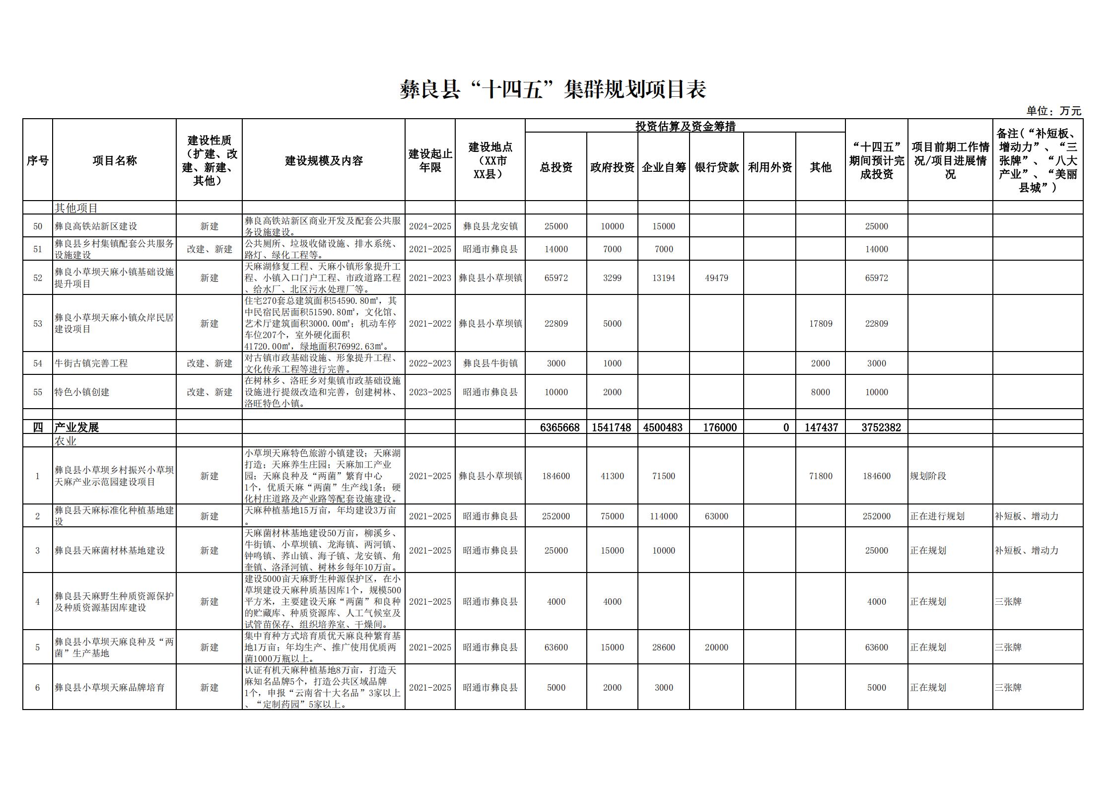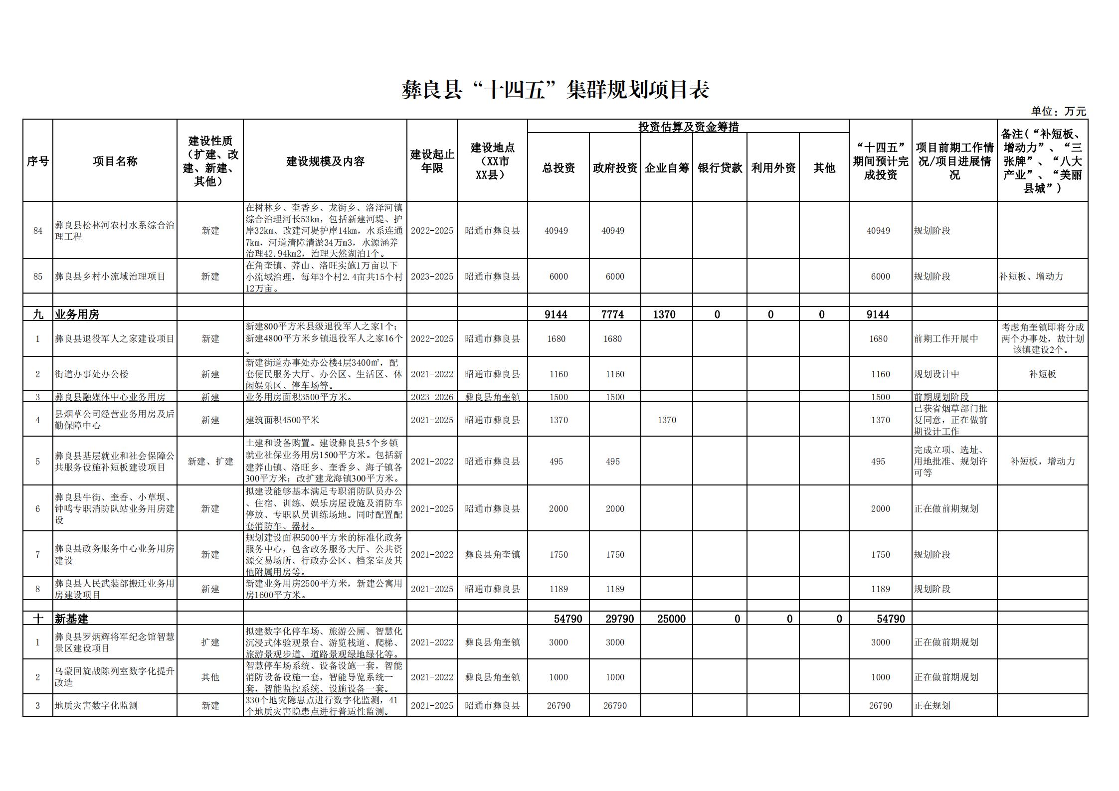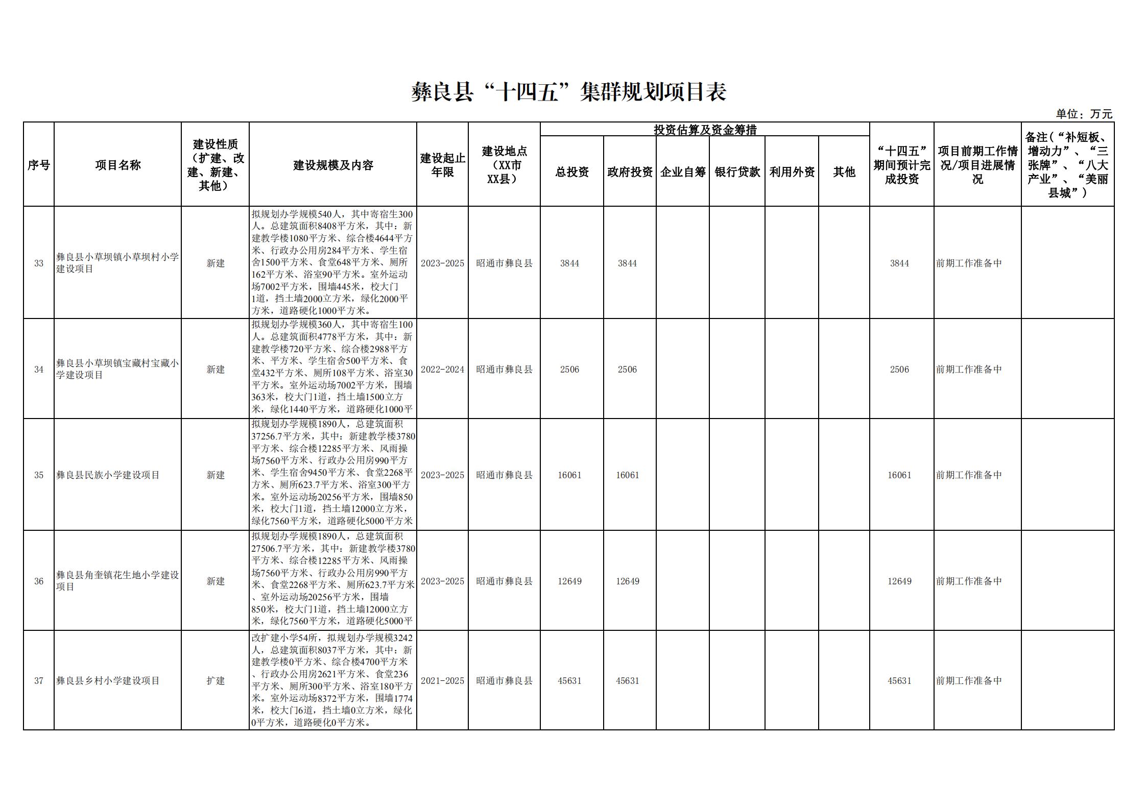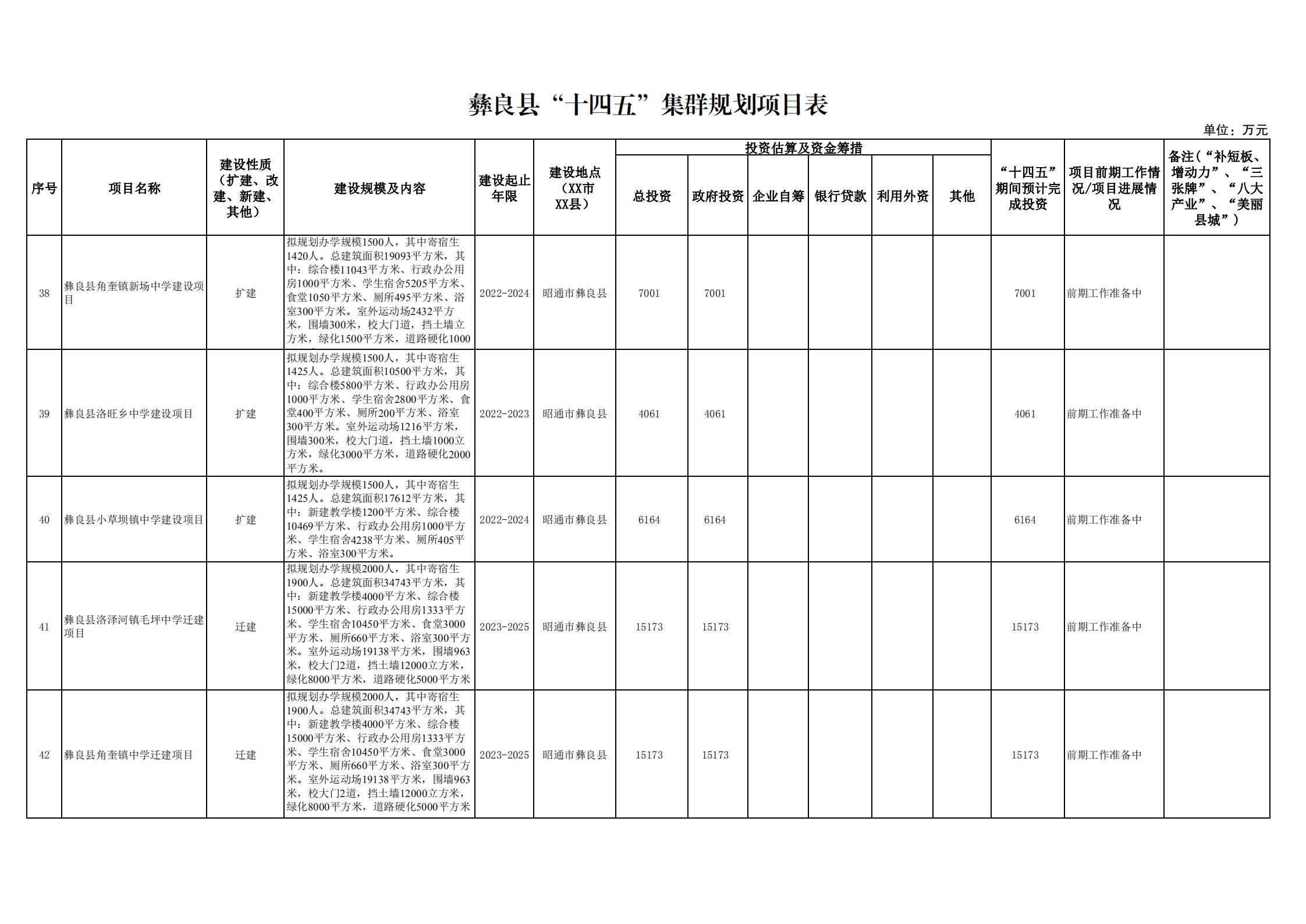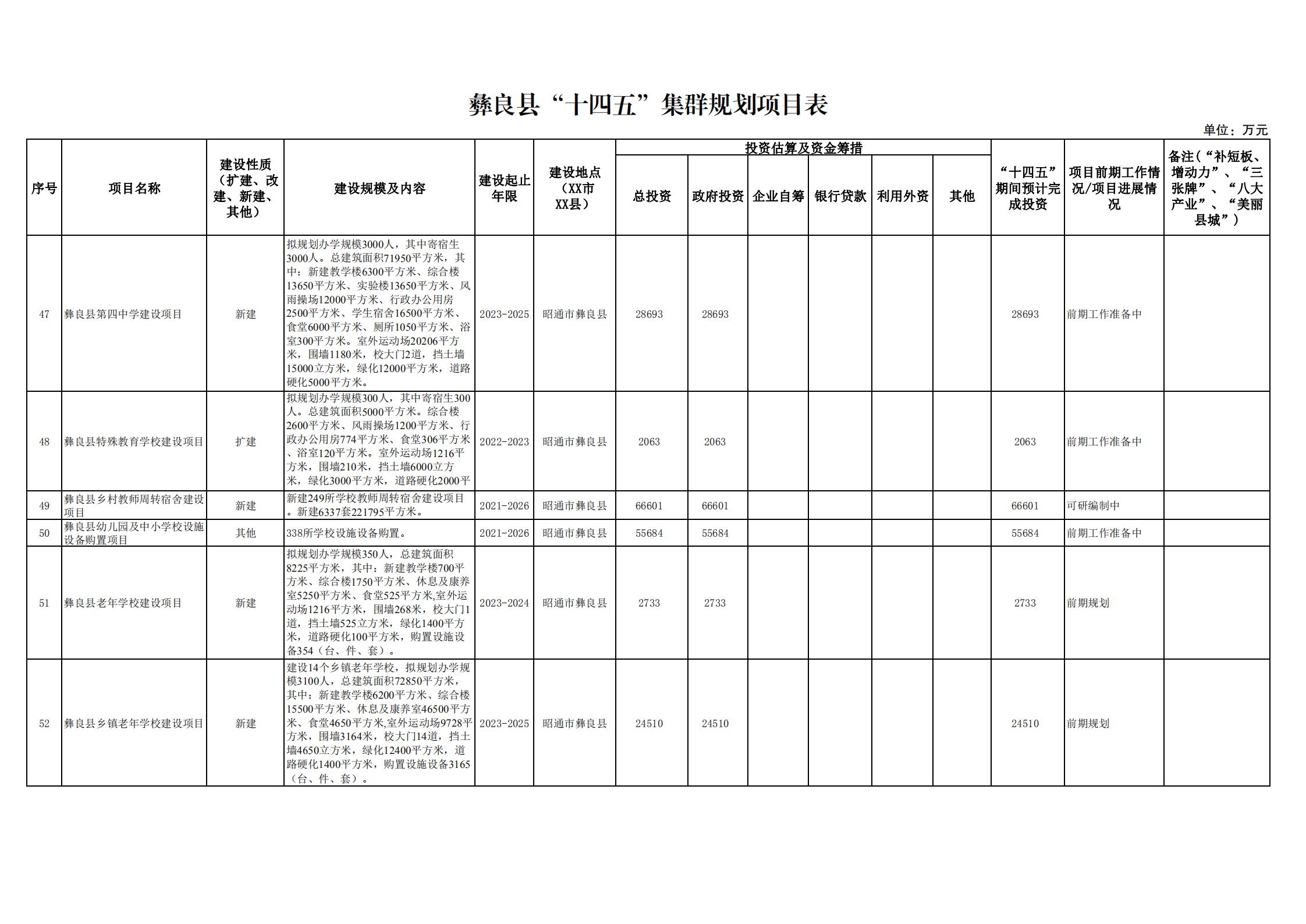 教育领域。推进彝良县村级幼儿园建设、彝良县幼儿园南校区建设、彝良县幼儿园东校区建设、彝良县角奎镇第二幼儿园建设、彝良县角奎镇第三幼儿园建设、彝良县角奎镇第四幼儿园建设、彝良县角奎镇第五幼儿园建设、彝良县角奎镇中心幼儿园建设、彝良县角奎镇新场幼儿园建设、彝良县白岩高铁新区第一幼儿园建设、彝良县白岩高铁新区第二幼儿园建设、彝良县白岩高铁新区第三幼儿园建设、彝良县角奎镇塘房小学建设、彝良县白岩高铁新区小学建设、彝良县小草坝镇小草坝村小学建设、彝良县小草坝镇宝藏村宝藏小学建设、彝良县民族小学建设、彝良县角奎镇花生地小学建设、彝良县乡村小学建设、彝良县角奎镇新场中学建设、彝良县洛旺乡中学建设、彝良县小草坝镇中学建设、彝良县洛泽河镇毛坪中学迁建、彝良县角奎镇中学迁建、彝良县角奎镇花生地中学、彝良县白岩高铁新区初级中学建设、彝良县第一中学扩建、彝良县民族中学、彝良县第四中学建设、彝良县特殊教育学校建设、彝良县乡村教师周转宿舍建设、彝良县幼儿园及中小学校设施设备购置、彝良县老年学校建设、彝良县乡镇老年学校建设、彝良县体育艺术学校建设、彝良县炳辉小学建设、彝良县义务教育能力提升、彝良县新城中学建设、彝良县学校集中改厕、彝良县职业技术高级中学建设等项目实施。 卫生领域。推进彝良县人民医院医技综合楼建设、彝良县中医医院业务用房建设、彝良县中医医院发热门诊建设、彝良县疾病预防控制中心服务能力提升、彝良县妇幼保健计生服务中心服务能力提升、彝良县中医医院中医药服务能力提升建设、彝良县疾病预防控制中心实验室、彝良县人民医院发热门诊建设、彝良县中医医院中医药特色重点专科建设、彝良县人民医院救治能力提升、彝良县应急抢救设施配置、彝良县留验站建设、彝良县体检中心业务用房建设、昭通市彝良县乡镇卫生院服务能力提升建设、彝良县中医医院救治能力提升、彝良县仁安医养一体建设、彝良县角奎镇卫生院建设、彝良县县乡医疗机构专科能力提质、彝良县人民医院奎香乡分院建设、彝良县人口健康信息化建设、彝良县第二人民医院传染病楼建设、彝良县人民医院牛街镇分院建设、彝良县村级卫生室业务用房建设及设施设备配置建设、彝良县县城医疗废水处理及固定废弃物存放室建设、彝良县120急救中心服务能力提升、彝良县中医药服务能力建设、彝良县医养一体建设、彝良县乡镇卫生院医疗废水处理及固定废弃物存放室建设、彝良县第二人民医院建设、彝良县公共卫生事件应急物资储备中心建设、彝良县人民医院小草坝镇分院建设、彝良县突发公共卫生应急处置中心业务用房建设、彝良县乡镇卫生院支医住宿建设、彝良县乡镇卫生院职工周转房建设、彝良县医疗卫生高端人才公寓建设、彝良县医疗废弃物处理转运站建设、彝良县艾滋病检验监测中心建设、彝良县医疗废弃物处理站建设、彝良县人民医院医养一体建设、彝良县海子乡中心卫生院建设、彝良县全民健康体检、彝良县基本公共卫生服务、彝良县重大公共卫生服务、彝良县卫生专业人才培养、彝良县爱国卫生运动等项目实施。 文化事业领域。推进彝良县图书文化馆提升改造、彝良县乡镇文化站建设、彝良县文化园建设、彝良县行政村(社区)综合性文化服务中心建设、彝良县罗炳辉将军纪念馆扩建、彝良县奎香长征纪念广场扩建、彝良县镇彝威地下党支部旧址修复、彝良县红二六军团指挥部旧址修复、彝良县乌蒙回旋战博物馆建设、罗炳辉将军故居提升改造、彝良县罗炳辉将军纪念馆公园、彝良县非遗保护传承展示中心、彝良县苗族传统节日场地建设等项目实施。 民政养老领域。推进彝良县社区居家养老服务中心建设、彝良县农村居家养老服务中心、彝良县小草坝康养生态园建设、彝良县城市养老服务中心建设、彝良县乡镇敬老院建设、彝良县社区服务设施建设、彝良县村(社区)公共服务综合信息平台建设、彝良县城市公益性公墓(骨灰堂)建设、彝良县农村公益性公墓(骨灰堂)建设、彝良县未成年人救助保护中心建设、彝良县中心敬老院升级改建、彝良县失能老人养护院建设、昭通市彝良县流浪乞讨人员救助管理站建设、昭通市彝良县洛旺特困人员供养服务设施(敬老院)建设、昭通市彝良县钟鸣特困人员供养服务设施(敬老院)建设、彝良县残疾人康复中心建设等项目实施。 体育领域。推进彝良县乡镇全民健身中心建设、彝良县村级体育活动场所、彝良县公共体育场建设、彝良县乒羽活动场馆建设、彝良县游泳馆建设、彝良县机动车和自行车赛道建设、彝良县青少年户外营地建设、彝良县户外体育公共设施建设、彝良县全民健身活动中心建设、昭通市彝良县体育公园建设、彝良县体育健身步道建设、彝良县小草坝镇体育健身步道建设、彝良县牛街镇体育健身步道、彝良县校园足球场建设、彝良县社会足球场建设等项目实施。 其他项目。推进彝良县创业山烈士陵园提升改造、彝良县小草坝烈士陵园改造、彝良县奎香烈士陵园提升改造、彝良县散葬烈士墓提升改造、彝良县荣誉军人休养院建设、彝良县职业技能培训基地建设、彝良县劳务创业市场基地建设