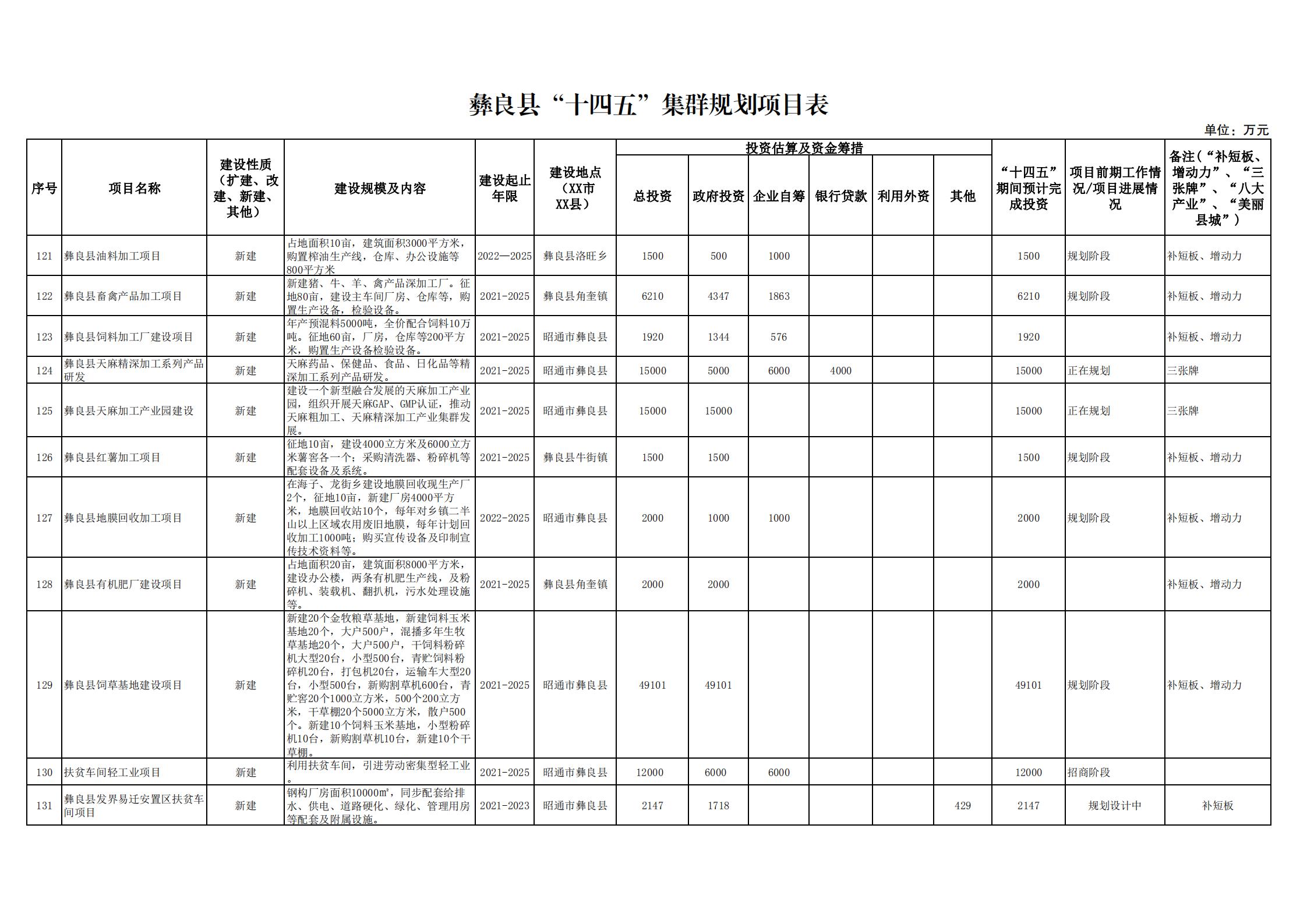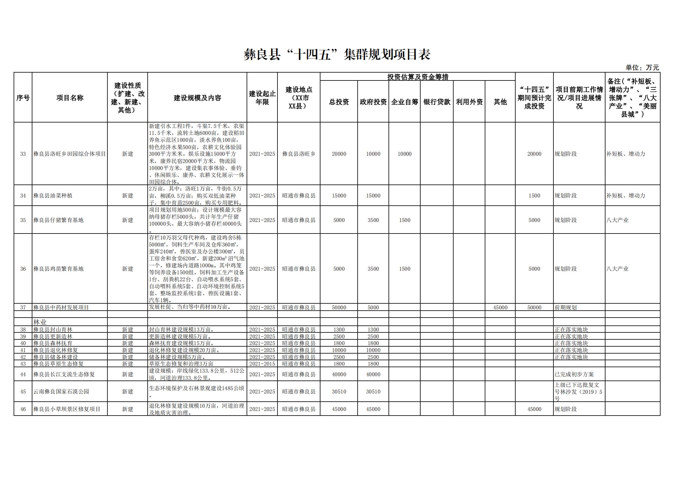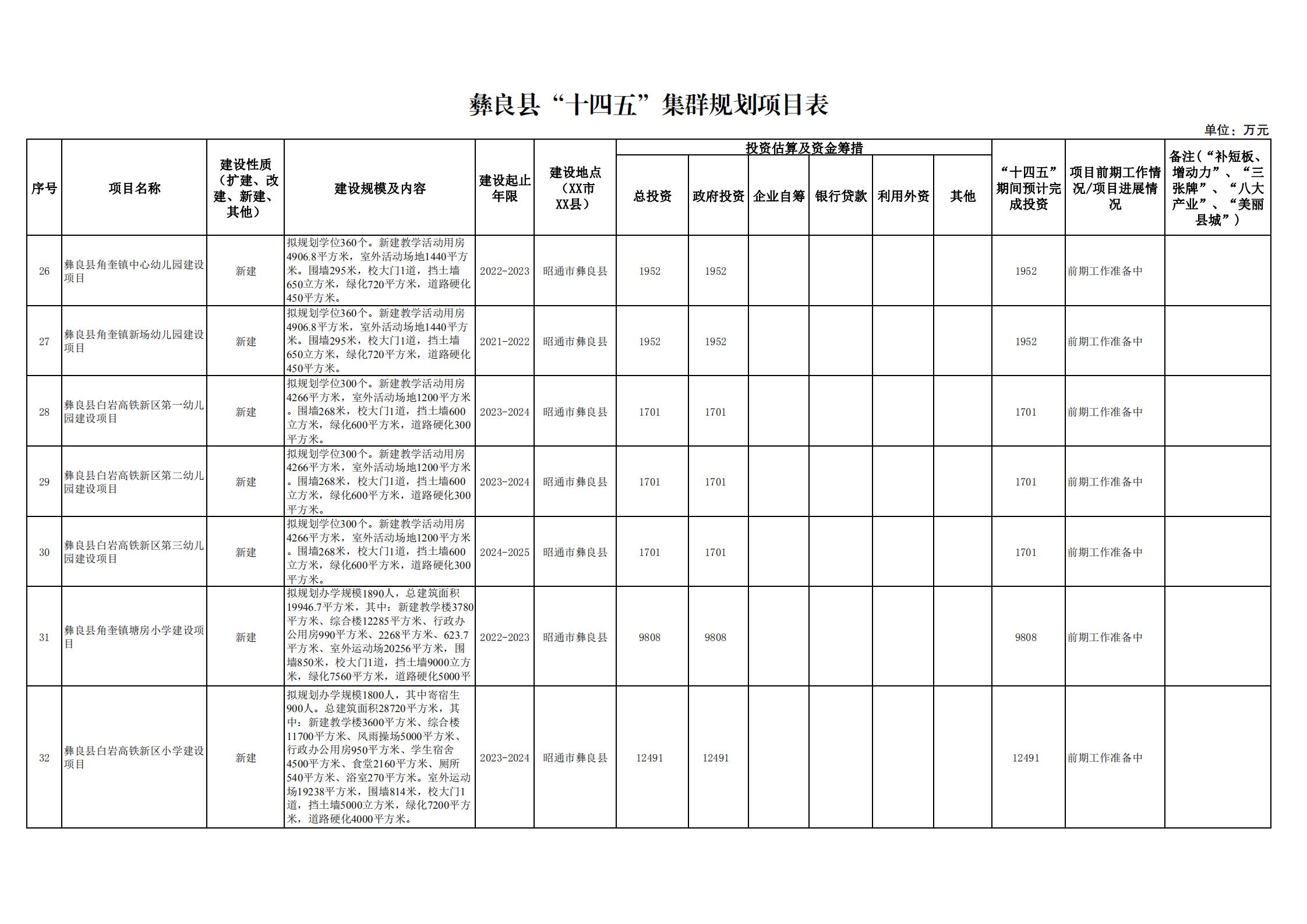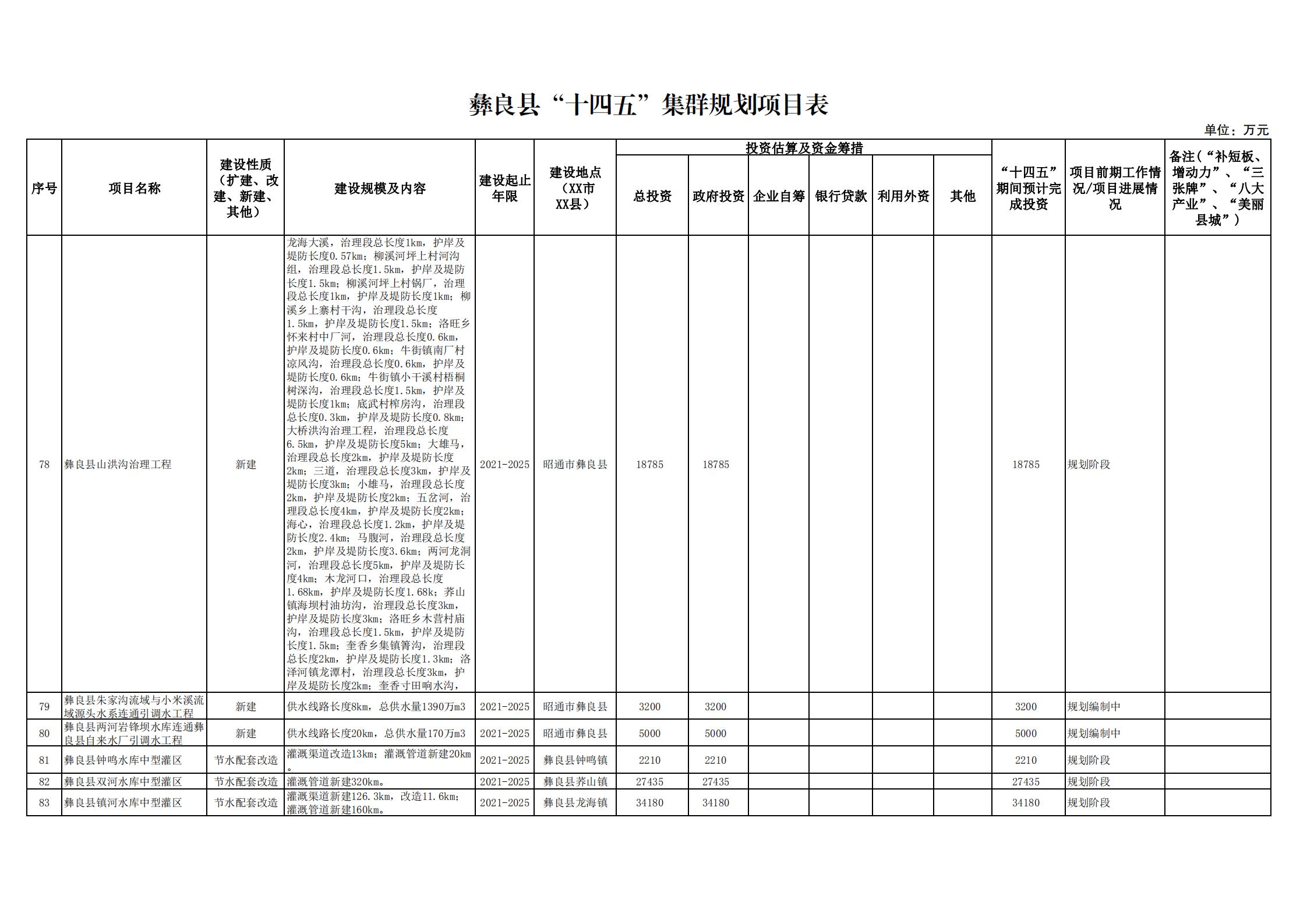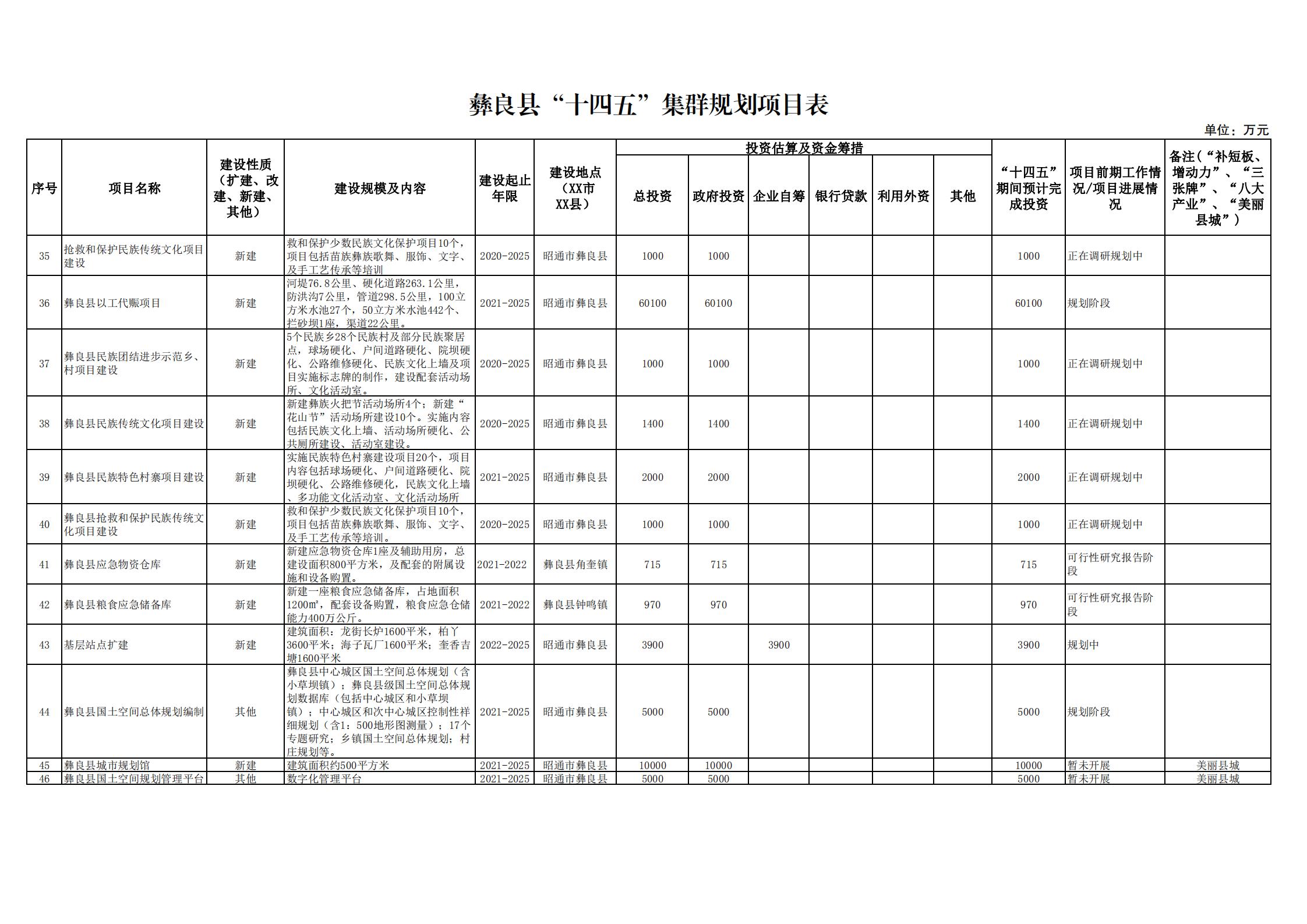 教育领域。推进彝良县村级幼儿园建设、彝良县幼儿园南校区建设、彝良县幼儿园东校区建设、彝良县角奎镇第二幼儿园建设、彝良县角奎镇第三幼儿园建设、彝良县角奎镇第四幼儿园建设、彝良县角奎镇第五幼儿园建设、彝良县角奎镇中心幼儿园建设、彝良县角奎镇新场幼儿园建设、彝良县白岩高铁新区第一幼儿园建设、彝良县白岩高铁新区第二幼儿园建设、彝良县白岩高铁新区第三幼儿园建设、彝良县角奎镇塘房小学建设、彝良县白岩高铁新区小学建设、彝良县小草坝镇小草坝村小学建设、彝良县小草坝镇宝藏村宝藏小学建设、彝良县民族小学建设、彝良县角奎镇花生地小学建设、彝良县乡村小学建设、彝良县角奎镇新场中学建设、彝良县洛旺乡中学建设、彝良县小草坝镇中学建设、彝良县洛泽河镇毛坪中学迁建、彝良县角奎镇中学迁建、彝良县角奎镇花生地中学、彝良县白岩高铁新区初级中学建设、彝良县第一中学扩建、彝良县民族中学、彝良县第四中学建设、彝良县特殊教育学校建设、彝良县乡村教师周转宿舍建设、彝良县幼儿园及中小学校设施设备购置、彝良县老年学校建设、彝良县乡镇老年学校建设、彝良县体育艺术学校建设、彝良县炳辉小学建设、彝良县义务教育能力提升、彝良县新城中学建设、彝良县学校集中改厕、彝良县职业技术高级中学建设等项目实施。 卫生领域。推进彝良县人民医院医技综合楼建设、彝良县中医医院业务用房建设、彝良县中医医院发热门诊建设、彝良县疾病预防控制中心服务能力提升、彝良县妇幼保健计生服务中心服务能力提升、彝良县中医医院中医药服务能力提升建设、彝良县疾病预防控制中心实验室、彝良县人民医院发热门诊建设、彝良县中医医院中医药特色重点专科建设、彝良县人民医院救治能力提升、彝良县应急抢救设施配置、彝良县留验站建设、彝良县体检中心业务用房建设、昭通市彝良县乡镇卫生院服务能力提升建设、彝良县中医医院救治能力提升、彝良县仁安医养一体建设、彝良县角奎镇卫生院建设、彝良县县乡医疗机构专科能力提质、彝良县人民医院奎香乡分院建设、彝良县人口健康信息化建设、彝良县第二人民医院传染病楼建设、彝良县人民医院牛街镇分院建设、彝良县村级卫生室业务用房建设及设施设备配置建设、彝良县县城医疗废水处理及固定废弃物存放室建设、彝良县120急救中心服务能力提升、彝良县中医药服务能力建设、彝良县医养一体建设、彝良县乡镇卫生院医疗废水处理及固定废弃物存放室建设、彝良县第二人民医院建设、彝良县公共卫生事件应急物资储备中心建设、彝良县人民医院小草坝镇分院建设、彝良县突发公共卫生应急处置中心业务用房建设、彝良县乡镇卫生院支医住宿建设、彝良县乡镇卫生院职工周转房建设、彝良县医疗卫生高端人才公寓建设、彝良县医疗废弃物处理转运站建设、彝良县艾滋病检验监测中心建设、彝良县医疗废弃物处理站建设、彝良县人民医院医养一体建设、彝良县海子乡中心卫生院建设、彝良县全民健康体检、彝良县基本公共卫生服务、彝良县重大公共卫生服务、彝良县卫生专业人才培养、彝良县爱国卫生运动等项目实施。 文化事业领域。推进彝良县图书文化馆提升改造、彝良县乡镇文化站建设、彝良县文化园建设、彝良县行政村(社区)综合性文化服务中心建设、彝良县罗炳辉将军纪念馆扩建、彝良县奎香长征纪念广场扩建、彝良县镇彝威地下党支部旧址修复、彝良县红二六军团指挥部旧址修复、彝良县乌蒙回旋战博物馆建设、罗炳辉将军故居提升改造、彝良县罗炳辉将军纪念馆公园、彝良县非遗保护传承展示中心、彝良县苗族传统节日场地建设等项目实施。 民政养老领域。推进彝良县社区居家养老服务中心建设、彝良县农村居家养老服务中心、彝良县小草坝康养生态园建设、彝良县城市养老服务中心建设、彝良县乡镇敬老院建设、彝良县社区服务设施建设、彝良县村(社区)公共服务综合信息平台建设、彝良县城市公益性公墓(骨灰堂)建设、彝良县农村公益性公墓(骨灰堂)建设、彝良县未成年人救助保护中心建设、彝良县中心敬老院升级改建、彝良县失能老人养护院建设、昭通市彝良县流浪乞讨人员救助管理站建设、昭通市彝良县洛旺特困人员供养服务设施(敬老院)建设、昭通市彝良县钟鸣特困人员供养服务设施(敬老院)建设、彝良县残疾人康复中心建设等项目实施。 体育领域。推进彝良县乡镇全民健身中心建设、彝良县村级体育活动场所、彝良县公共体育场建设、彝良县乒羽活动场馆建设、彝良县游泳馆建设、彝良县机动车和自行车赛道建设、彝良县青少年户外营地建设、彝良县户外体育公共设施建设、彝良县全民健身活动中心建设、昭通市彝良县体育公园建设、彝良县体育健身步道建设、彝良县小草坝镇体育健身步道建设、彝良县牛街镇体育健身步道、彝良县校园足球场建设、彝良县社会足球场建设等项目实施。 其他项目。推进彝良县创业山烈士陵园提升改造、彝良县小草坝烈士陵园改造、彝良县奎香烈士陵园提升改造、彝良县散葬烈士墓提升改造、彝良县荣誉军人休养院建设、彝良县职业技能培训基地建设、彝良县劳务创业市场基地建设