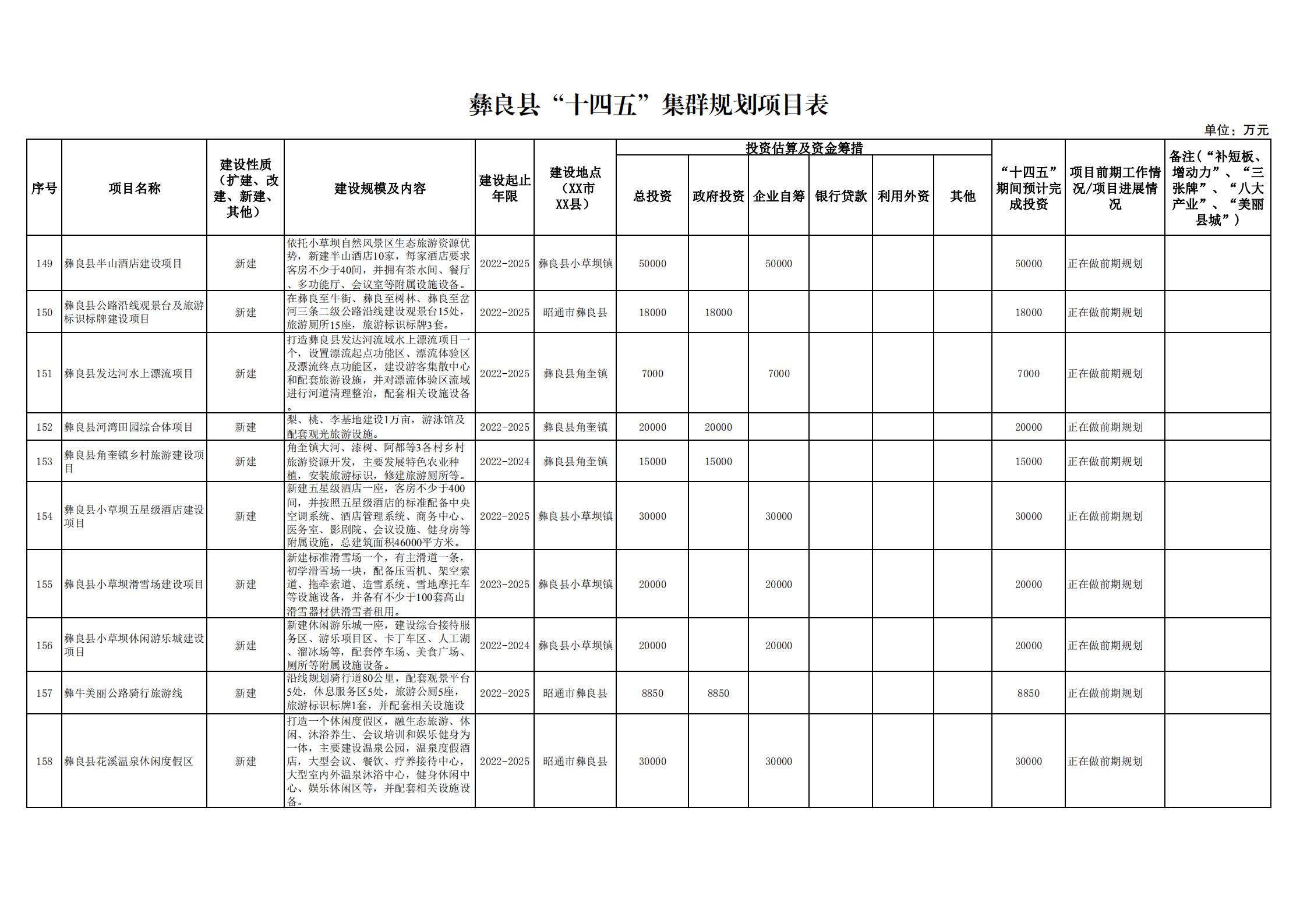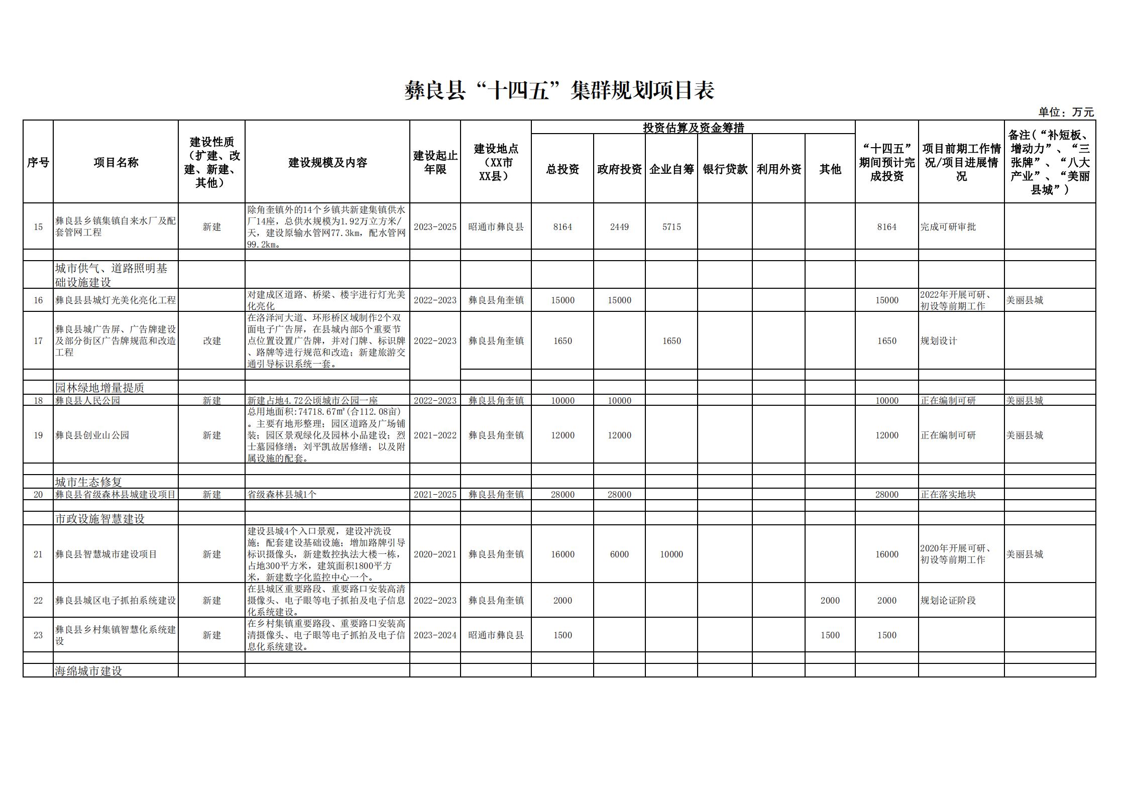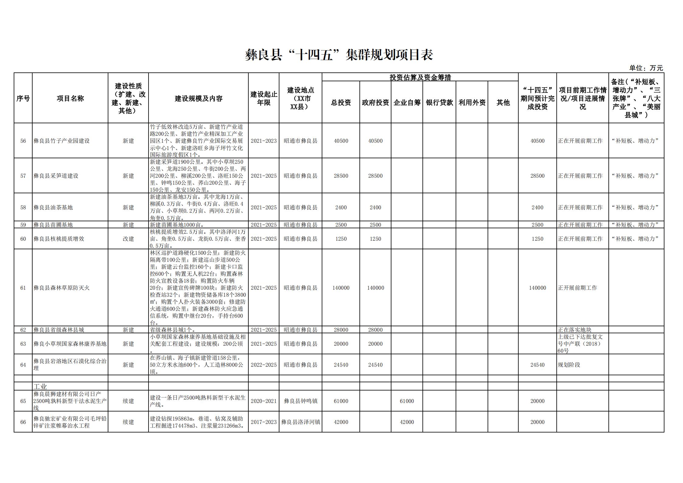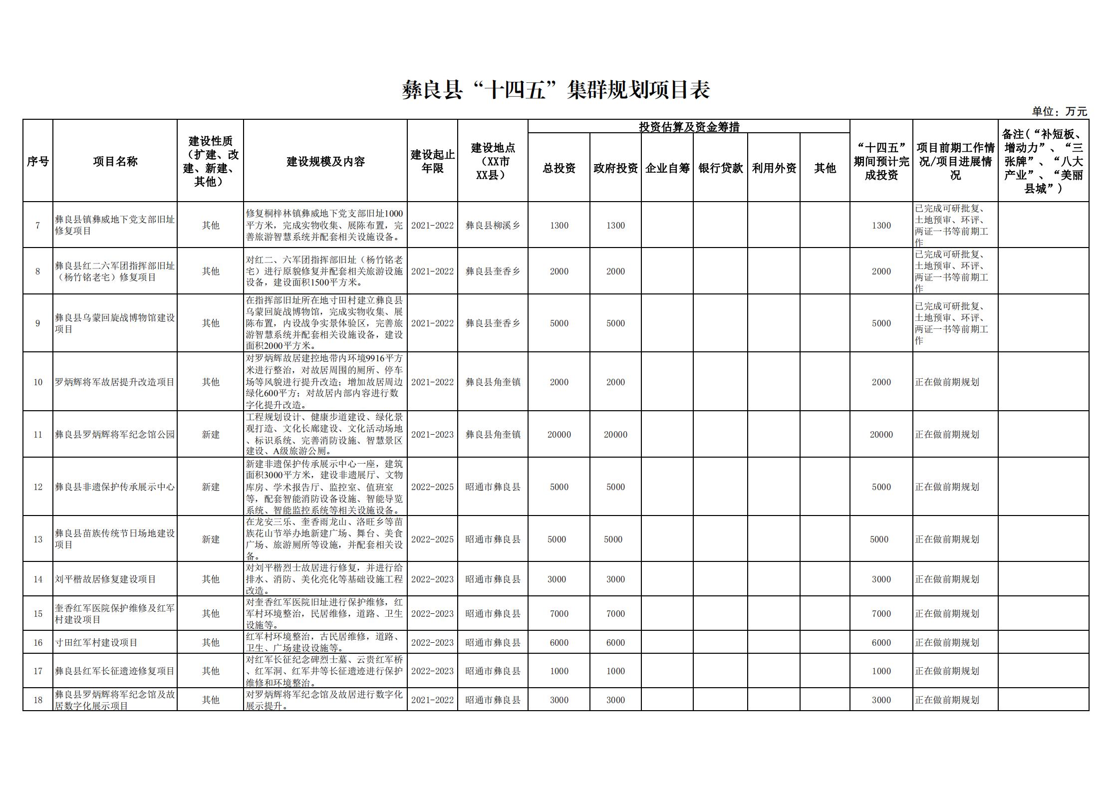 教育领域。推进彝良县村级幼儿园建设、彝良县幼儿园南校区建设、彝良县幼儿园东校区建设、彝良县角奎镇第二幼儿园建设、彝良县角奎镇第三幼儿园建设、彝良县角奎镇第四幼儿园建设、彝良县角奎镇第五幼儿园建设、彝良县角奎镇中心幼儿园建设、彝良县角奎镇新场幼儿园建设、彝良县白岩高铁新区第一幼儿园建设、彝良县白岩高铁新区第二幼儿园建设、彝良县白岩高铁新区第三幼儿园建设、彝良县角奎镇塘房小学建设、彝良县白岩高铁新区小学建设、彝良县小草坝镇小草坝村小学建设、彝良县小草坝镇宝藏村宝藏小学建设、彝良县民族小学建设、彝良县角奎镇花生地小学建设、彝良县乡村小学建设、彝良县角奎镇新场中学建设、彝良县洛旺乡中学建设、彝良县小草坝镇中学建设、彝良县洛泽河镇毛坪中学迁建、彝良县角奎镇中学迁建、彝良县角奎镇花生地中学、彝良县白岩高铁新区初级中学建设、彝良县第一中学扩建、彝良县民族中学、彝良县第四中学建设、彝良县特殊教育学校建设、彝良县乡村教师周转宿舍建设、彝良县幼儿园及中小学校设施设备购置、彝良县老年学校建设、彝良县乡镇老年学校建设、彝良县体育艺术学校建设、彝良县炳辉小学建设、彝良县义务教育能力提升、彝良县新城中学建设、彝良县学校集中改厕、彝良县职业技术高级中学建设等项目实施。 卫生领域。推进彝良县人民医院医技综合楼建设、彝良县中医医院业务用房建设、彝良县中医医院发热门诊建设、彝良县疾病预防控制中心服务能力提升、彝良县妇幼保健计生服务中心服务能力提升、彝良县中医医院中医药服务能力提升建设、彝良县疾病预防控制中心实验室、彝良县人民医院发热门诊建设、彝良县中医医院中医药特色重点专科建设、彝良县人民医院救治能力提升、彝良县应急抢救设施配置、彝良县留验站建设、彝良县体检中心业务用房建设、昭通市彝良县乡镇卫生院服务能力提升建设、彝良县中医医院救治能力提升、彝良县仁安医养一体建设、彝良县角奎镇卫生院建设、彝良县县乡医疗机构专科能力提质、彝良县人民医院奎香乡分院建设、彝良县人口健康信息化建设、彝良县第二人民医院传染病楼建设、彝良县人民医院牛街镇分院建设、彝良县村级卫生室业务用房建设及设施设备配置建设、彝良县县城医疗废水处理及固定废弃物存放室建设、彝良县120急救中心服务能力提升、彝良县中医药服务能力建设、彝良县医养一体建设、彝良县乡镇卫生院医疗废水处理及固定废弃物存放室建设、彝良县第二人民医院建设、彝良县公共卫生事件应急物资储备中心建设、彝良县人民医院小草坝镇分院建设、彝良县突发公共卫生应急处置中心业务用房建设、彝良县乡镇卫生院支医住宿建设、彝良县乡镇卫生院职工周转房建设、彝良县医疗卫生高端人才公寓建设、彝良县医疗废弃物处理转运站建设、彝良县艾滋病检验监测中心建设、彝良县医疗废弃物处理站建设、彝良县人民医院医养一体建设、彝良县海子乡中心卫生院建设、彝良县全民健康体检、彝良县基本公共卫生服务、彝良县重大公共卫生服务、彝良县卫生专业人才培养、彝良县爱国卫生运动等项目实施。 文化事业领域。推进彝良县图书文化馆提升改造、彝良县乡镇文化站建设、彝良县文化园建设、彝良县行政村(社区)综合性文化服务中心建设、彝良县罗炳辉将军纪念馆扩建、彝良县奎香长征纪念广场扩建、彝良县镇彝威地下党支部旧址修复、彝良县红二六军团指挥部旧址修复、彝良县乌蒙回旋战博物馆建设、罗炳辉将军故居提升改造、彝良县罗炳辉将军纪念馆公园、彝良县非遗保护传承展示中心、彝良县苗族传统节日场地建设等项目实施。 民政养老领域。推进彝良县社区居家养老服务中心建设、彝良县农村居家养老服务中心、彝良县小草坝康养生态园建设、彝良县城市养老服务中心建设、彝良县乡镇敬老院建设、彝良县社区服务设施建设、彝良县村(社区)公共服务综合信息平台建设、彝良县城市公益性公墓(骨灰堂)建设、彝良县农村公益性公墓(骨灰堂)建设、彝良县未成年人救助保护中心建设、彝良县中心敬老院升级改建、彝良县失能老人养护院建设、昭通市彝良县流浪乞讨人员救助管理站建设、昭通市彝良县洛旺特困人员供养服务设施(敬老院)建设、昭通市彝良县钟鸣特困人员供养服务设施(敬老院)建设、彝良县残疾人康复中心建设等项目实施。 体育领域。推进彝良县乡镇全民健身中心建设、彝良县村级体育活动场所、彝良县公共体育场建设、彝良县乒羽活动场馆建设、彝良县游泳馆建设、彝良县机动车和自行车赛道建设、彝良县青少年户外营地建设、彝良县户外体育公共设施建设、彝良县全民健身活动中心建设、昭通市彝良县体育公园建设、彝良县体育健身步道建设、彝良县小草坝镇体育健身步道建设、彝良县牛街镇体育健身步道、彝良县校园足球场建设、彝良县社会足球场建设等项目实施。 其他项目。推进彝良县创业山烈士陵园提升改造、彝良县小草坝烈士陵园改造、彝良县奎香烈士陵园提升改造、彝良县散葬烈士墓提升改造、彝良县荣誉军人休养院建设、彝良县职业技能培训基地建设、彝良县劳务创业市场基地建设