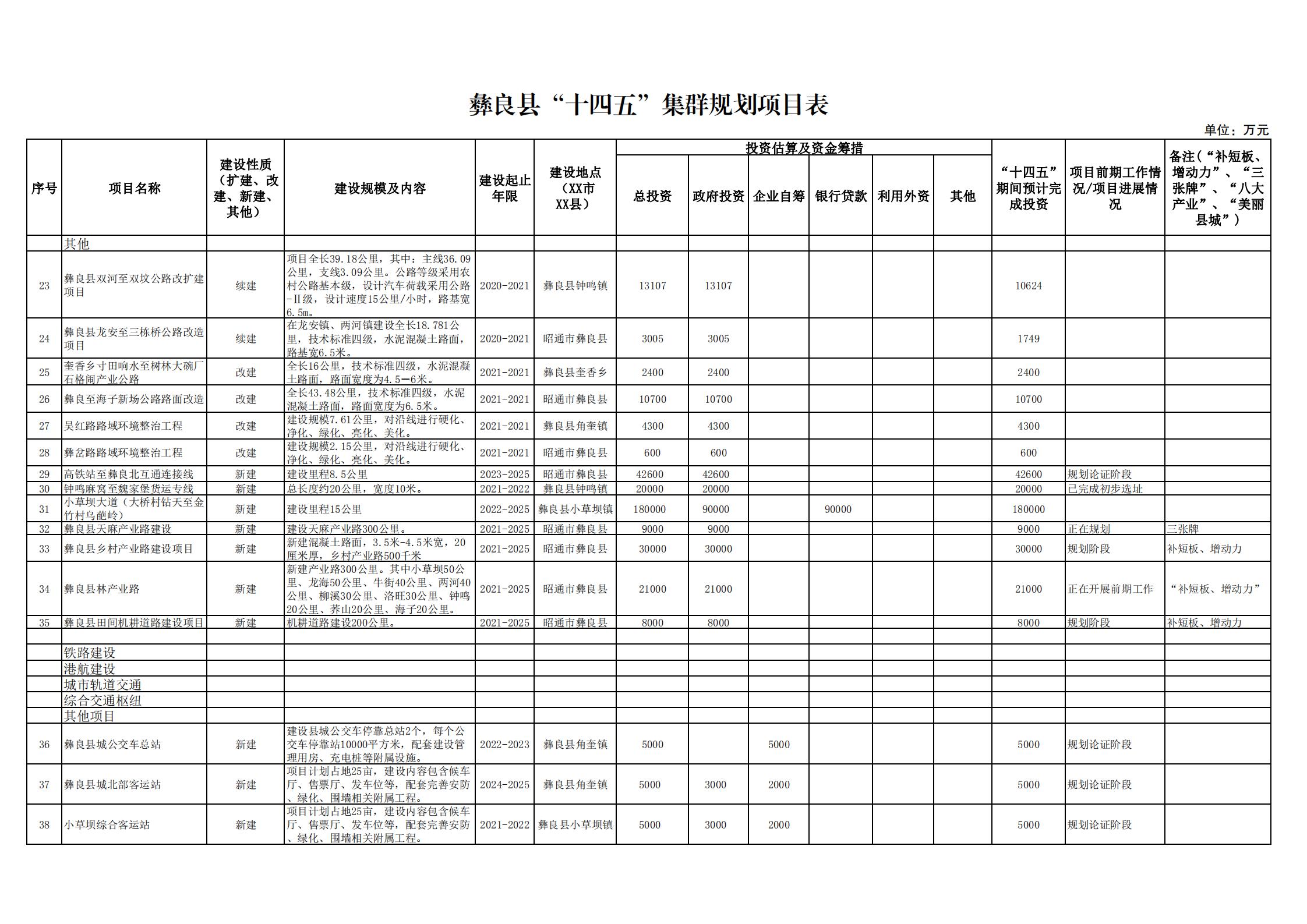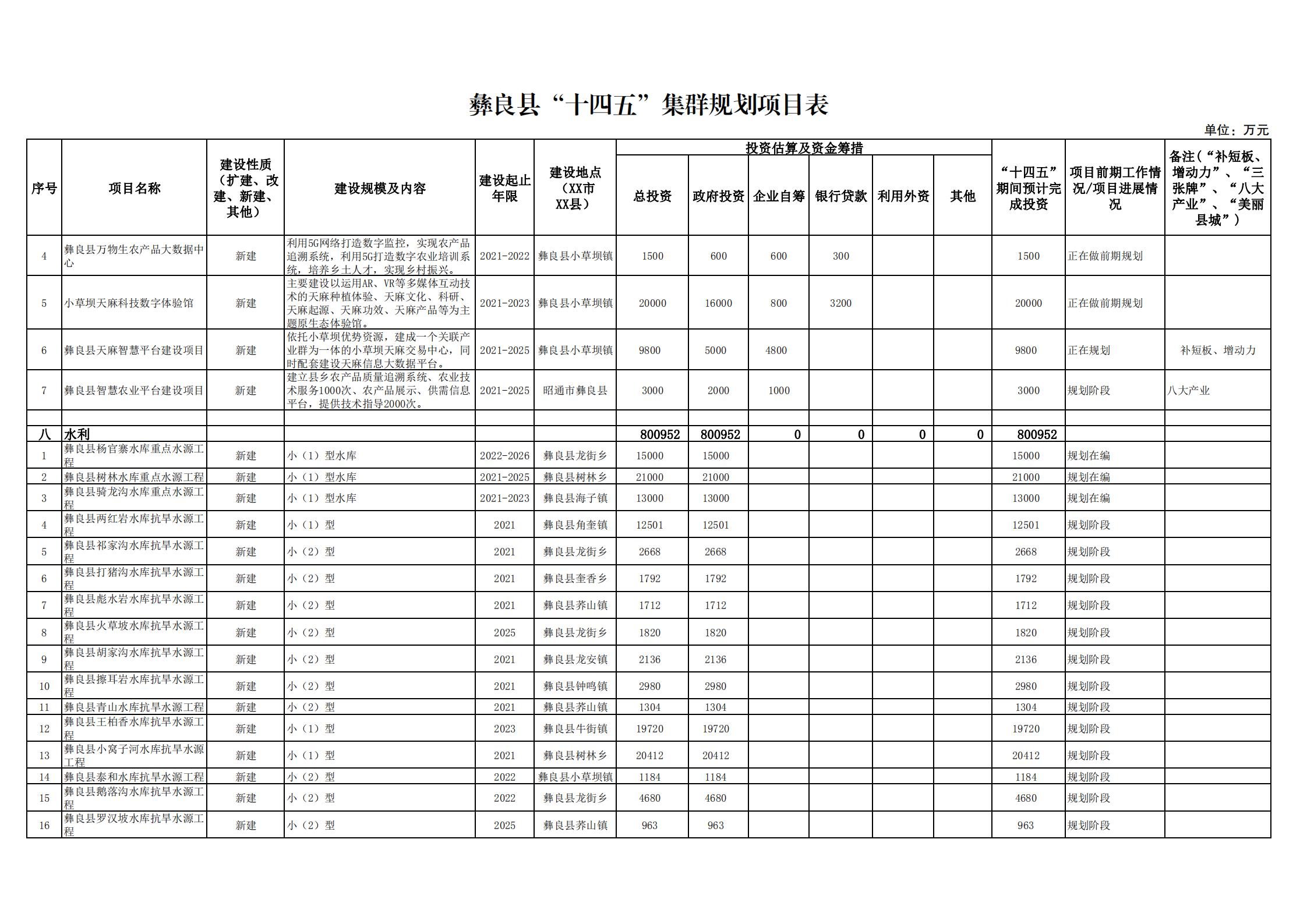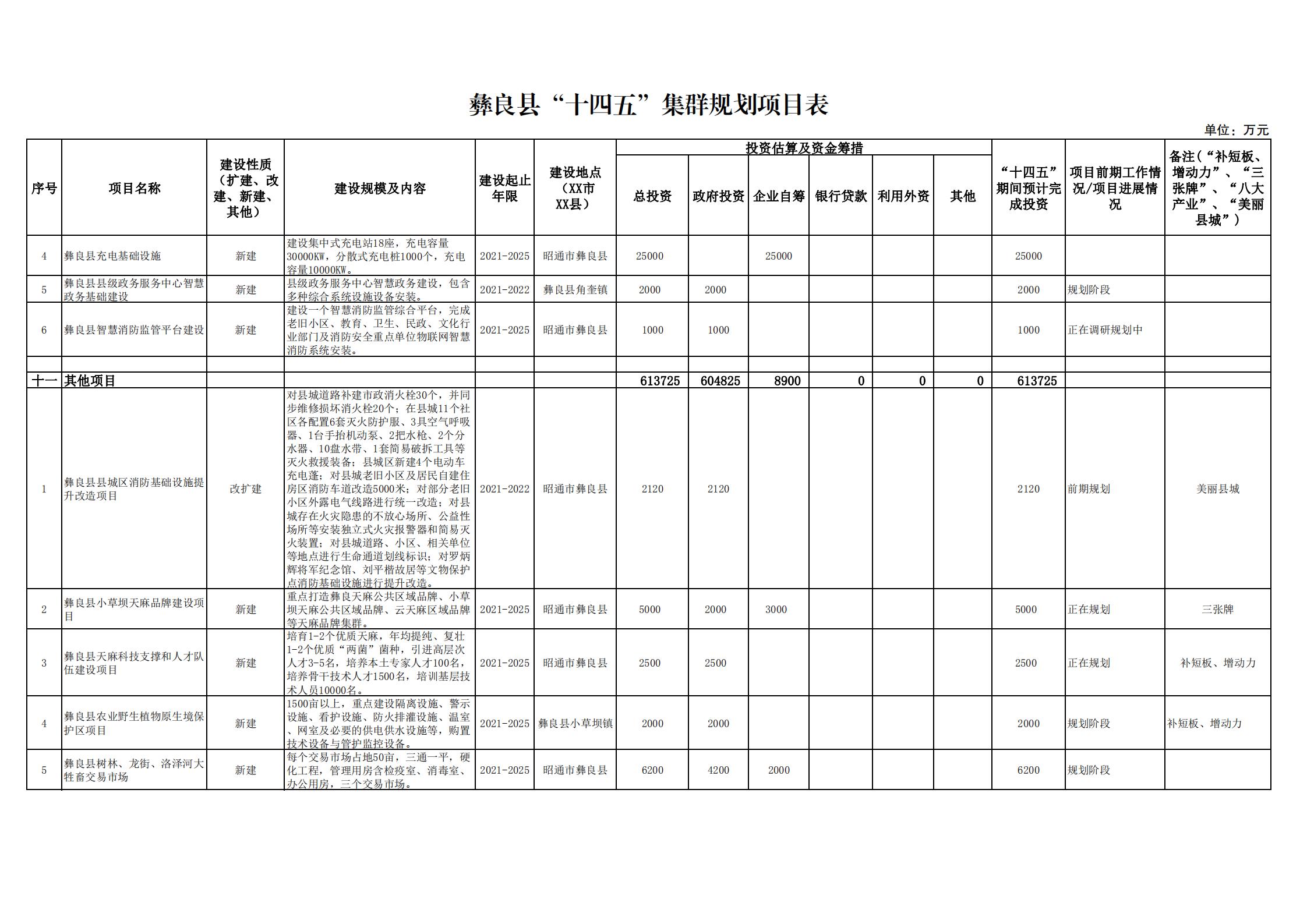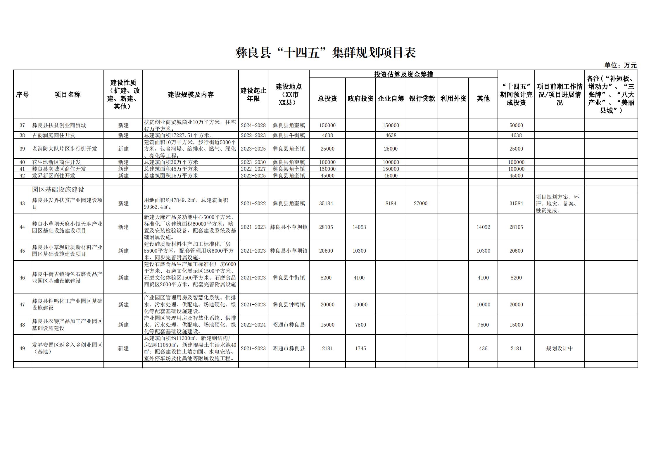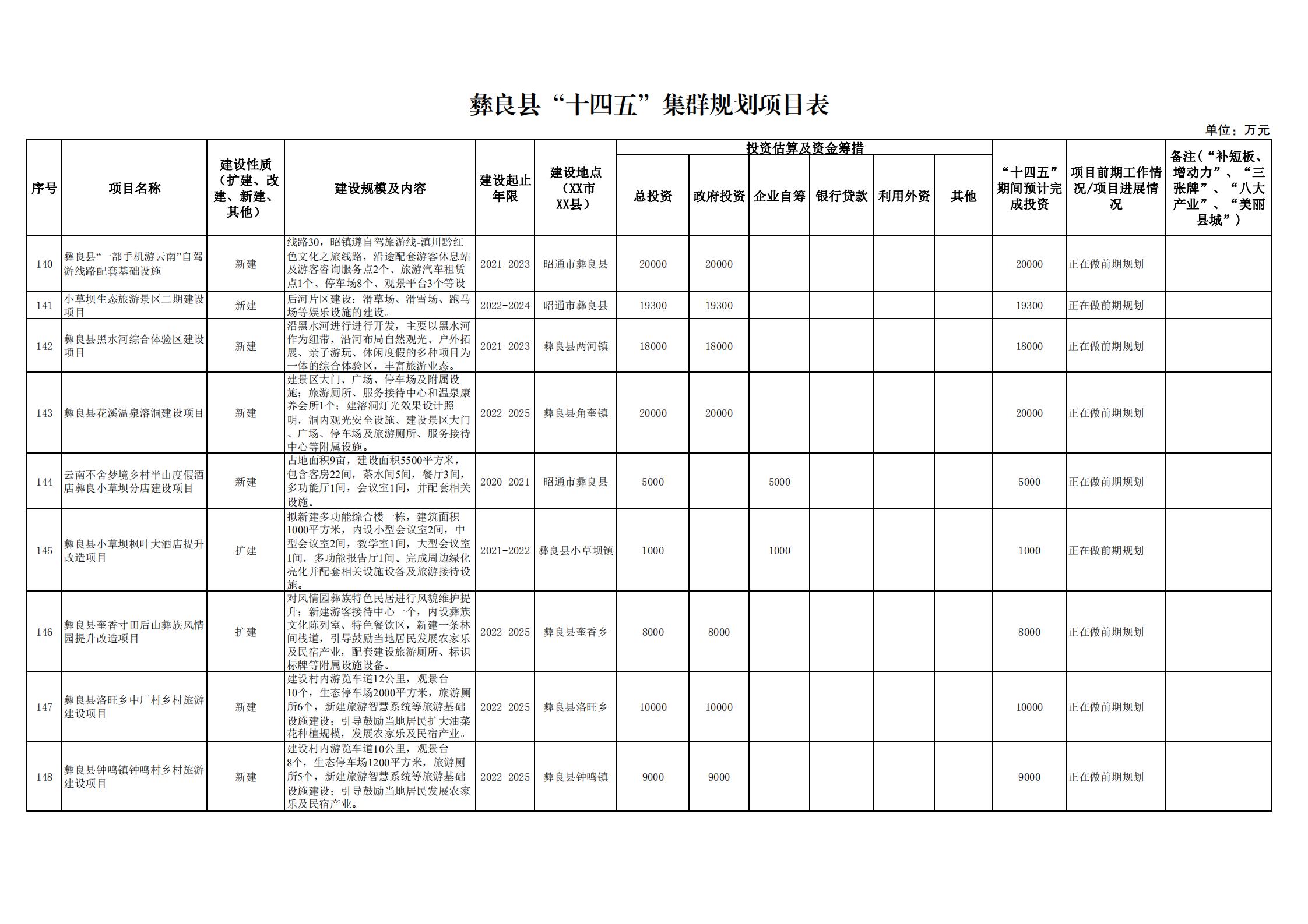 教育领域。推进彝良县村级幼儿园建设、彝良县幼儿园南校区建设、彝良县幼儿园东校区建设、彝良县角奎镇第二幼儿园建设、彝良县角奎镇第三幼儿园建设、彝良县角奎镇第四幼儿园建设、彝良县角奎镇第五幼儿园建设、彝良县角奎镇中心幼儿园建设、彝良县角奎镇新场幼儿园建设、彝良县白岩高铁新区第一幼儿园建设、彝良县白岩高铁新区第二幼儿园建设、彝良县白岩高铁新区第三幼儿园建设、彝良县角奎镇塘房小学建设、彝良县白岩高铁新区小学建设、彝良县小草坝镇小草坝村小学建设、彝良县小草坝镇宝藏村宝藏小学建设、彝良县民族小学建设、彝良县角奎镇花生地小学建设、彝良县乡村小学建设、彝良县角奎镇新场中学建设、彝良县洛旺乡中学建设、彝良县小草坝镇中学建设、彝良县洛泽河镇毛坪中学迁建、彝良县角奎镇中学迁建、彝良县角奎镇花生地中学、彝良县白岩高铁新区初级中学建设、彝良县第一中学扩建、彝良县民族中学、彝良县第四中学建设、彝良县特殊教育学校建设、彝良县乡村教师周转宿舍建设、彝良县幼儿园及中小学校设施设备购置、彝良县老年学校建设、彝良县乡镇老年学校建设、彝良县体育艺术学校建设、彝良县炳辉小学建设、彝良县义务教育能力提升、彝良县新城中学建设、彝良县学校集中改厕、彝良县职业技术高级中学建设等项目实施。 卫生领域。推进彝良县人民医院医技综合楼建设、彝良县中医医院业务用房建设、彝良县中医医院发热门诊建设、彝良县疾病预防控制中心服务能力提升、彝良县妇幼保健计生服务中心服务能力提升、彝良县中医医院中医药服务能力提升建设、彝良县疾病预防控制中心实验室、彝良县人民医院发热门诊建设、彝良县中医医院中医药特色重点专科建设、彝良县人民医院救治能力提升、彝良县应急抢救设施配置、彝良县留验站建设、彝良县体检中心业务用房建设、昭通市彝良县乡镇卫生院服务能力提升建设、彝良县中医医院救治能力提升、彝良县仁安医养一体建设、彝良县角奎镇卫生院建设、彝良县县乡医疗机构专科能力提质、彝良县人民医院奎香乡分院建设、彝良县人口健康信息化建设、彝良县第二人民医院传染病楼建设、彝良县人民医院牛街镇分院建设、彝良县村级卫生室业务用房建设及设施设备配置建设、彝良县县城医疗废水处理及固定废弃物存放室建设、彝良县120急救中心服务能力提升、彝良县中医药服务能力建设、彝良县医养一体建设、彝良县乡镇卫生院医疗废水处理及固定废弃物存放室建设、彝良县第二人民医院建设、彝良县公共卫生事件应急物资储备中心建设、彝良县人民医院小草坝镇分院建设、彝良县突发公共卫生应急处置中心业务用房建设、彝良县乡镇卫生院支医住宿建设、彝良县乡镇卫生院职工周转房建设、彝良县医疗卫生高端人才公寓建设、彝良县医疗废弃物处理转运站建设、彝良县艾滋病检验监测中心建设、彝良县医疗废弃物处理站建设、彝良县人民医院医养一体建设、彝良县海子乡中心卫生院建设、彝良县全民健康体检、彝良县基本公共卫生服务、彝良县重大公共卫生服务、彝良县卫生专业人才培养、彝良县爱国卫生运动等项目实施。 文化事业领域。推进彝良县图书文化馆提升改造、彝良县乡镇文化站建设、彝良县文化园建设、彝良县行政村(社区)综合性文化服务中心建设、彝良县罗炳辉将军纪念馆扩建、彝良县奎香长征纪念广场扩建、彝良县镇彝威地下党支部旧址修复、彝良县红二六军团指挥部旧址修复、彝良县乌蒙回旋战博物馆建设、罗炳辉将军故居提升改造、彝良县罗炳辉将军纪念馆公园、彝良县非遗保护传承展示中心、彝良县苗族传统节日场地建设等项目实施。 民政养老领域。推进彝良县社区居家养老服务中心建设、彝良县农村居家养老服务中心、彝良县小草坝康养生态园建设、彝良县城市养老服务中心建设、彝良县乡镇敬老院建设、彝良县社区服务设施建设、彝良县村(社区)公共服务综合信息平台建设、彝良县城市公益性公墓(骨灰堂)建设、彝良县农村公益性公墓(骨灰堂)建设、彝良县未成年人救助保护中心建设、彝良县中心敬老院升级改建、彝良县失能老人养护院建设、昭通市彝良县流浪乞讨人员救助管理站建设、昭通市彝良县洛旺特困人员供养服务设施(敬老院)建设、昭通市彝良县钟鸣特困人员供养服务设施(敬老院)建设、彝良县残疾人康复中心建设等项目实施。 体育领域。推进彝良县乡镇全民健身中心建设、彝良县村级体育活动场所、彝良县公共体育场建设、彝良县乒羽活动场馆建设、彝良县游泳馆建设、彝良县机动车和自行车赛道建设、彝良县青少年户外营地建设、彝良县户外体育公共设施建设、彝良县全民健身活动中心建设、昭通市彝良县体育公园建设、彝良县体育健身步道建设、彝良县小草坝镇体育健身步道建设、彝良县牛街镇体育健身步道、彝良县校园足球场建设、彝良县社会足球场建设等项目实施。 其他项目。推进彝良县创业山烈士陵园提升改造、彝良县小草坝烈士陵园改造、彝良县奎香烈士陵园提升改造、彝良县散葬烈士墓提升改造、彝良县荣誉军人休养院建设、彝良县职业技能培训基地建设、彝良县劳务创业市场基地建设