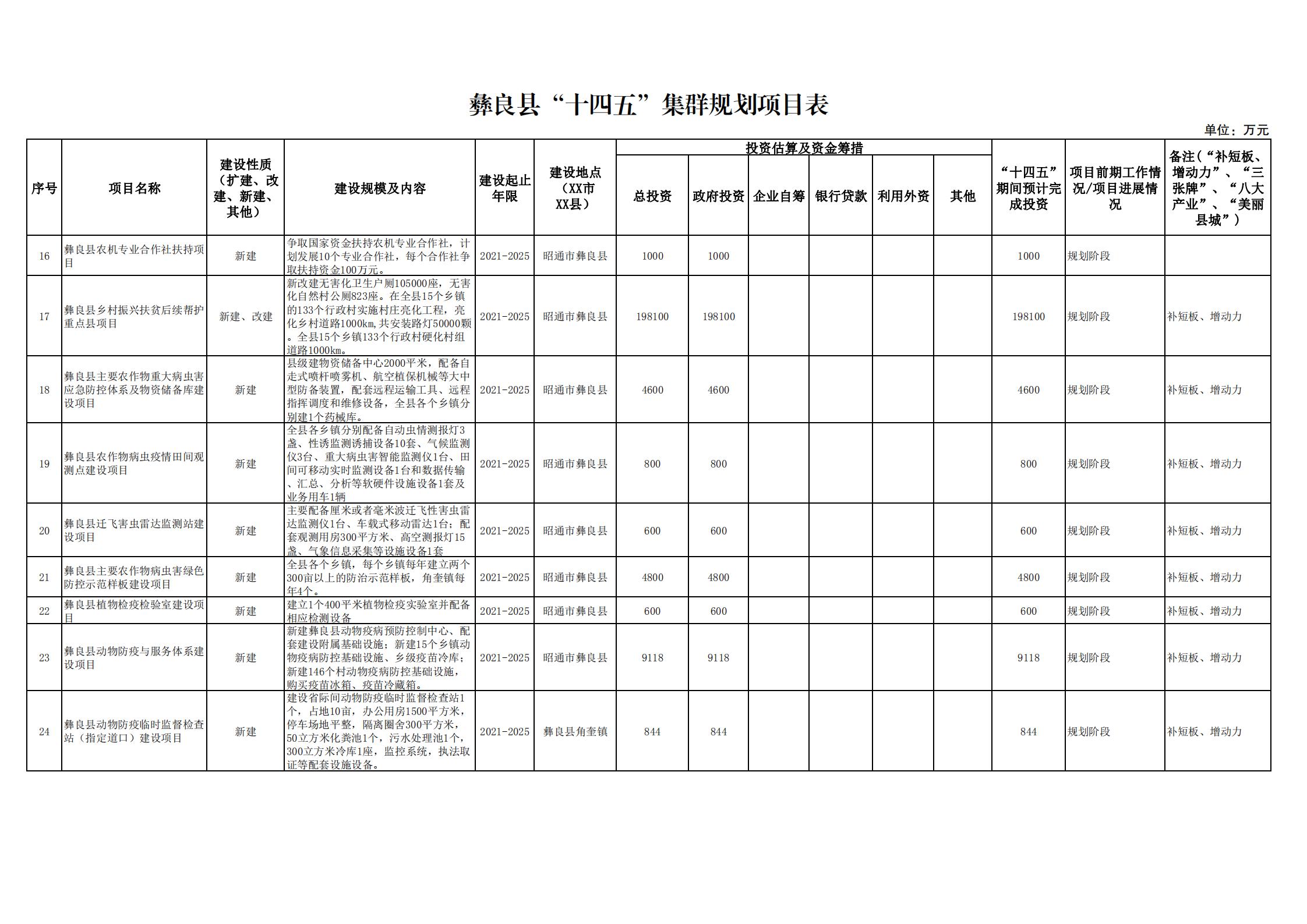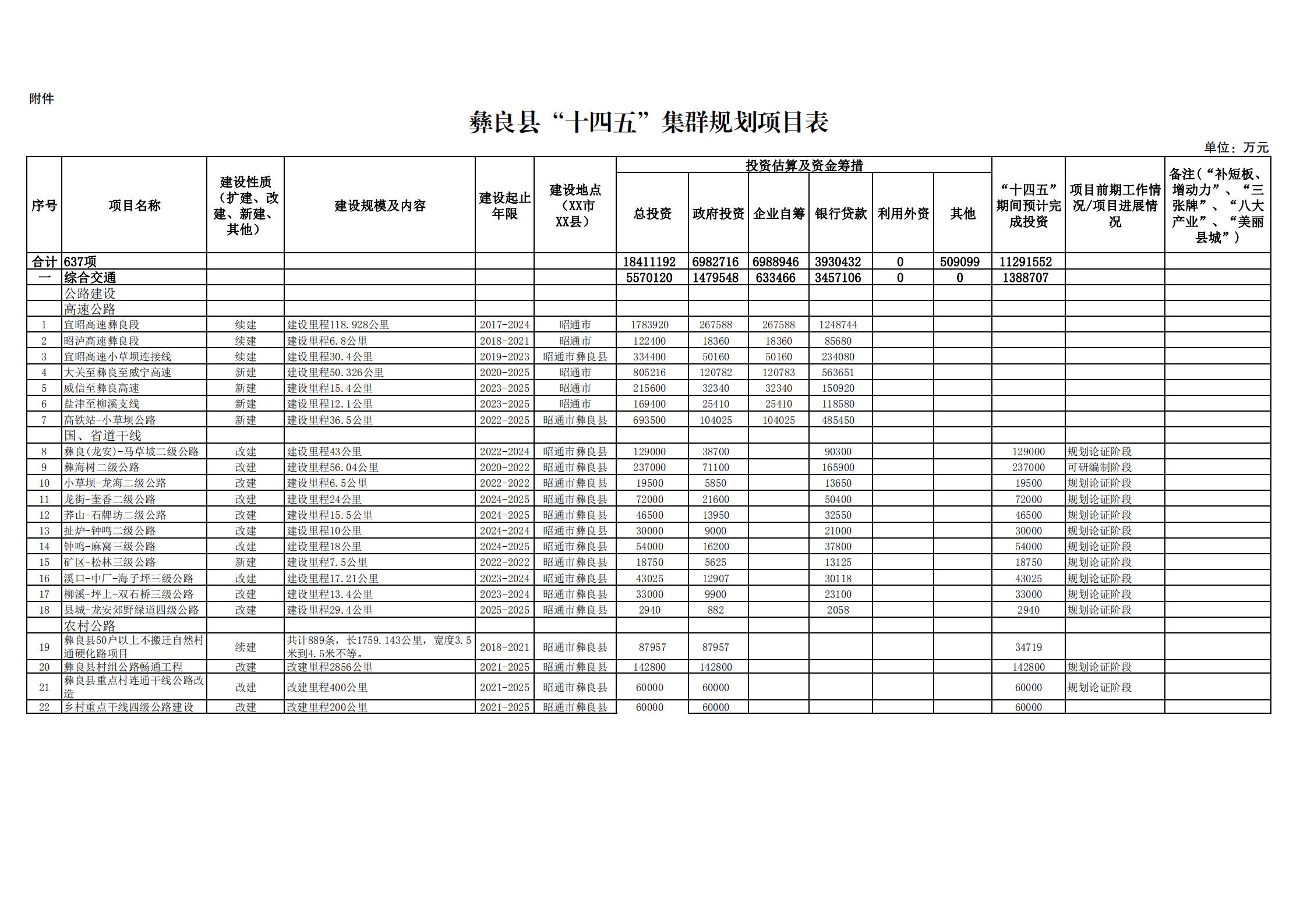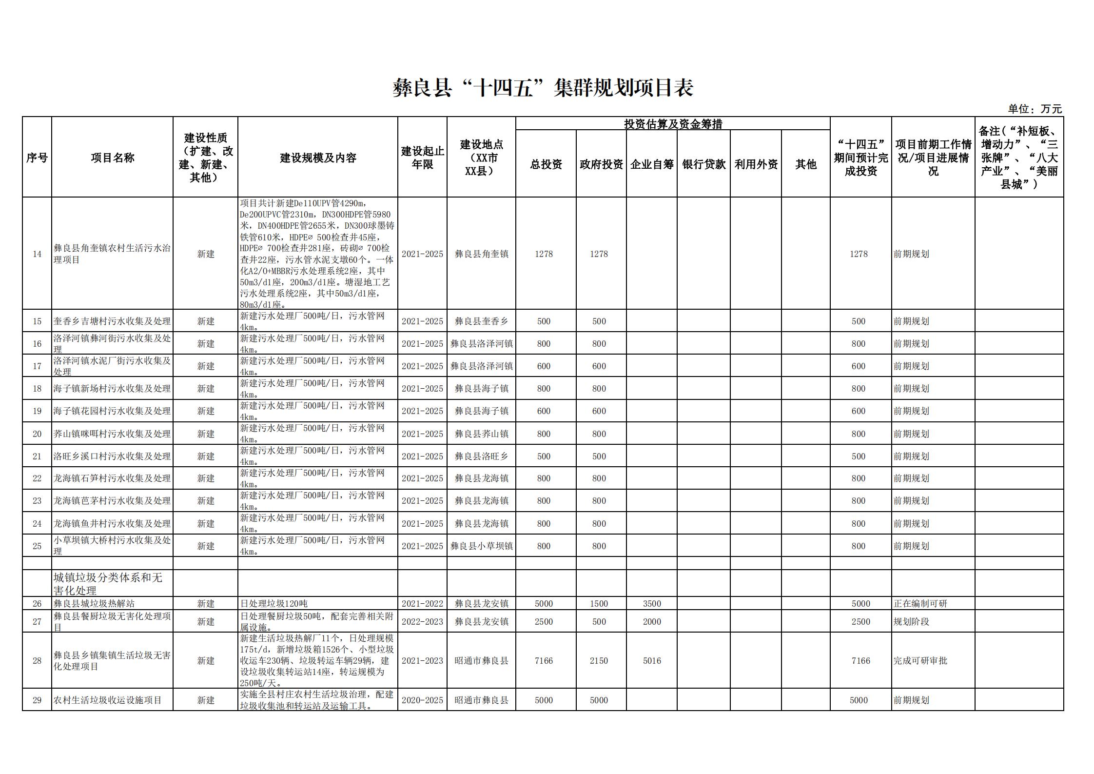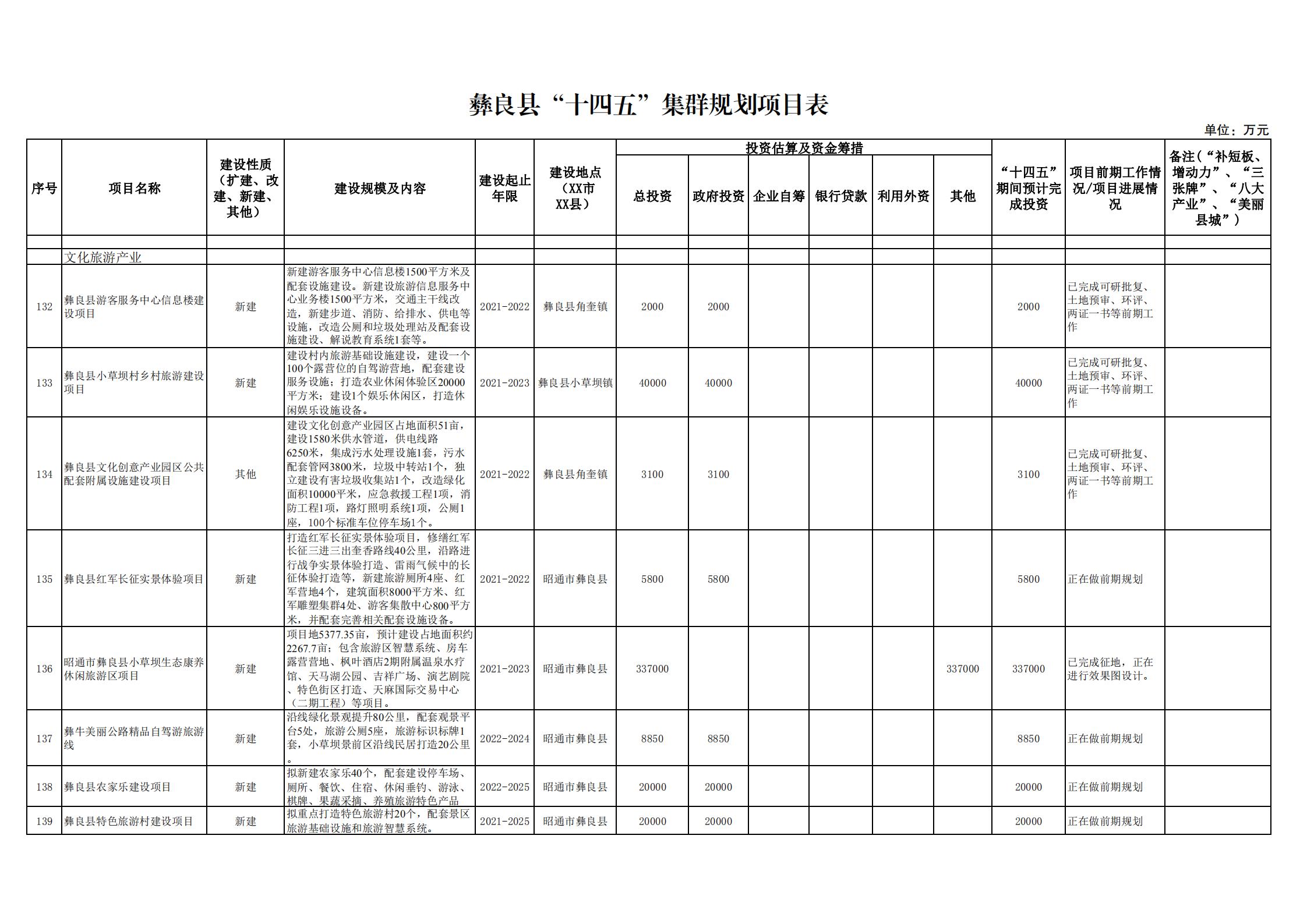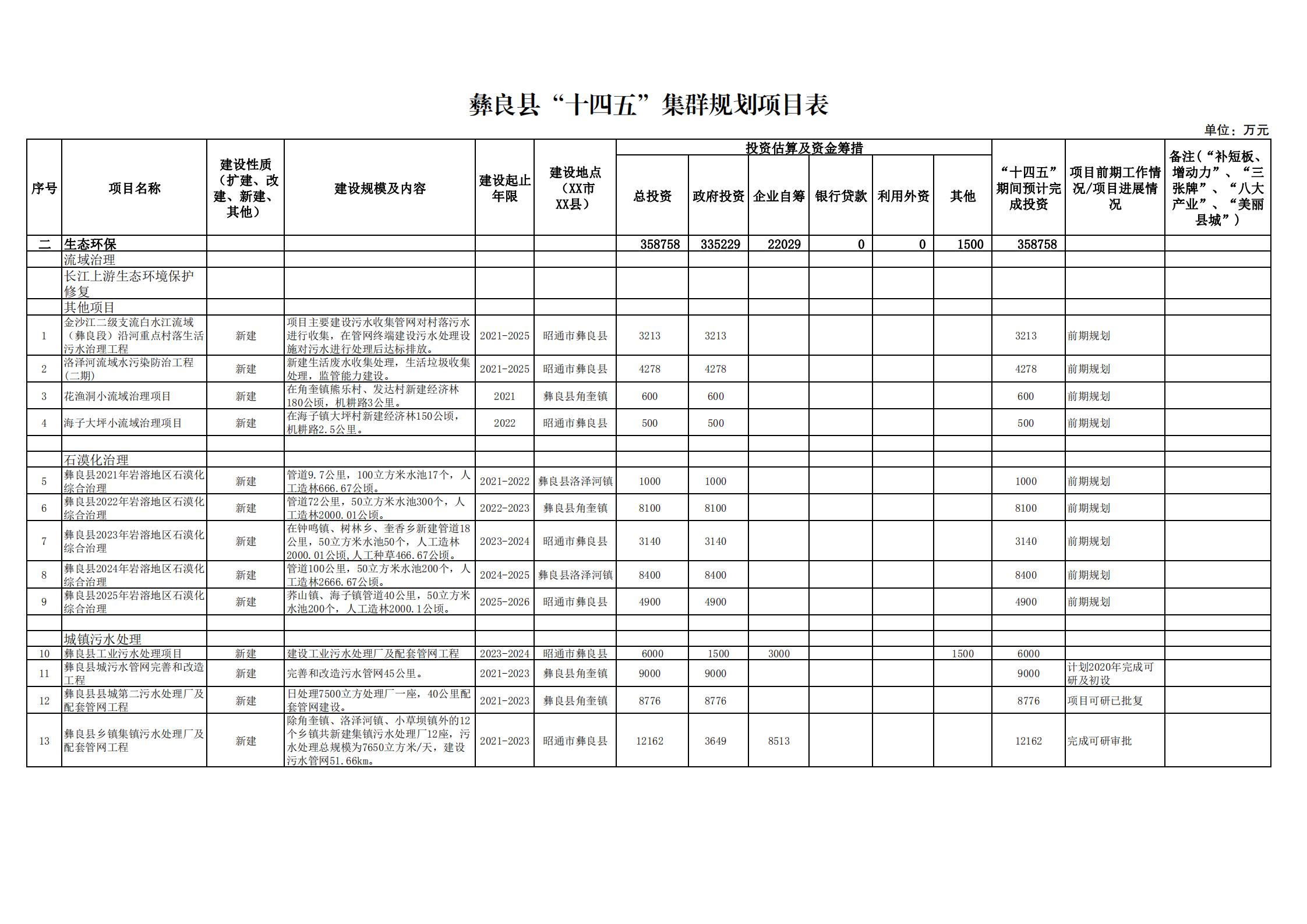 教育领域。推进彝良县村级幼儿园建设、彝良县幼儿园南校区建设、彝良县幼儿园东校区建设、彝良县角奎镇第二幼儿园建设、彝良县角奎镇第三幼儿园建设、彝良县角奎镇第四幼儿园建设、彝良县角奎镇第五幼儿园建设、彝良县角奎镇中心幼儿园建设、彝良县角奎镇新场幼儿园建设、彝良县白岩高铁新区第一幼儿园建设、彝良县白岩高铁新区第二幼儿园建设、彝良县白岩高铁新区第三幼儿园建设、彝良县角奎镇塘房小学建设、彝良县白岩高铁新区小学建设、彝良县小草坝镇小草坝村小学建设、彝良县小草坝镇宝藏村宝藏小学建设、彝良县民族小学建设、彝良县角奎镇花生地小学建设、彝良县乡村小学建设、彝良县角奎镇新场中学建设、彝良县洛旺乡中学建设、彝良县小草坝镇中学建设、彝良县洛泽河镇毛坪中学迁建、彝良县角奎镇中学迁建、彝良县角奎镇花生地中学、彝良县白岩高铁新区初级中学建设、彝良县第一中学扩建、彝良县民族中学、彝良县第四中学建设、彝良县特殊教育学校建设、彝良县乡村教师周转宿舍建设、彝良县幼儿园及中小学校设施设备购置、彝良县老年学校建设、彝良县乡镇老年学校建设、彝良县体育艺术学校建设、彝良县炳辉小学建设、彝良县义务教育能力提升、彝良县新城中学建设、彝良县学校集中改厕、彝良县职业技术高级中学建设等项目实施。 卫生领域。推进彝良县人民医院医技综合楼建设、彝良县中医医院业务用房建设、彝良县中医医院发热门诊建设、彝良县疾病预防控制中心服务能力提升、彝良县妇幼保健计生服务中心服务能力提升、彝良县中医医院中医药服务能力提升建设、彝良县疾病预防控制中心实验室、彝良县人民医院发热门诊建设、彝良县中医医院中医药特色重点专科建设、彝良县人民医院救治能力提升、彝良县应急抢救设施配置、彝良县留验站建设、彝良县体检中心业务用房建设、昭通市彝良县乡镇卫生院服务能力提升建设、彝良县中医医院救治能力提升、彝良县仁安医养一体建设、彝良县角奎镇卫生院建设、彝良县县乡医疗机构专科能力提质、彝良县人民医院奎香乡分院建设、彝良县人口健康信息化建设、彝良县第二人民医院传染病楼建设、彝良县人民医院牛街镇分院建设、彝良县村级卫生室业务用房建设及设施设备配置建设、彝良县县城医疗废水处理及固定废弃物存放室建设、彝良县120急救中心服务能力提升、彝良县中医药服务能力建设、彝良县医养一体建设、彝良县乡镇卫生院医疗废水处理及固定废弃物存放室建设、彝良县第二人民医院建设、彝良县公共卫生事件应急物资储备中心建设、彝良县人民医院小草坝镇分院建设、彝良县突发公共卫生应急处置中心业务用房建设、彝良县乡镇卫生院支医住宿建设、彝良县乡镇卫生院职工周转房建设、彝良县医疗卫生高端人才公寓建设、彝良县医疗废弃物处理转运站建设、彝良县艾滋病检验监测中心建设、彝良县医疗废弃物处理站建设、彝良县人民医院医养一体建设、彝良县海子乡中心卫生院建设、彝良县全民健康体检、彝良县基本公共卫生服务、彝良县重大公共卫生服务、彝良县卫生专业人才培养、彝良县爱国卫生运动等项目实施。 文化事业领域。推进彝良县图书文化馆提升改造、彝良县乡镇文化站建设、彝良县文化园建设、彝良县行政村(社区)综合性文化服务中心建设、彝良县罗炳辉将军纪念馆扩建、彝良县奎香长征纪念广场扩建、彝良县镇彝威地下党支部旧址修复、彝良县红二六军团指挥部旧址修复、彝良县乌蒙回旋战博物馆建设、罗炳辉将军故居提升改造、彝良县罗炳辉将军纪念馆公园、彝良县非遗保护传承展示中心、彝良县苗族传统节日场地建设等项目实施。 民政养老领域。推进彝良县社区居家养老服务中心建设、彝良县农村居家养老服务中心、彝良县小草坝康养生态园建设、彝良县城市养老服务中心建设、彝良县乡镇敬老院建设、彝良县社区服务设施建设、彝良县村(社区)公共服务综合信息平台建设、彝良县城市公益性公墓(骨灰堂)建设、彝良县农村公益性公墓(骨灰堂)建设、彝良县未成年人救助保护中心建设、彝良县中心敬老院升级改建、彝良县失能老人养护院建设、昭通市彝良县流浪乞讨人员救助管理站建设、昭通市彝良县洛旺特困人员供养服务设施(敬老院)建设、昭通市彝良县钟鸣特困人员供养服务设施(敬老院)建设、彝良县残疾人康复中心建设等项目实施。 体育领域。推进彝良县乡镇全民健身中心建设、彝良县村级体育活动场所、彝良县公共体育场建设、彝良县乒羽活动场馆建设、彝良县游泳馆建设、彝良县机动车和自行车赛道建设、彝良县青少年户外营地建设、彝良县户外体育公共设施建设、彝良县全民健身活动中心建设、昭通市彝良县体育公园建设、彝良县体育健身步道建设、彝良县小草坝镇体育健身步道建设、彝良县牛街镇体育健身步道、彝良县校园足球场建设、彝良县社会足球场建设等项目实施。 其他项目。推进彝良县创业山烈士陵园提升改造、彝良县小草坝烈士陵园改造、彝良县奎香烈士陵园提升改造、彝良县散葬烈士墓提升改造、彝良县荣誉军人休养院建设、彝良县职业技能培训基地建设、彝良县劳务创业市场基地建设
