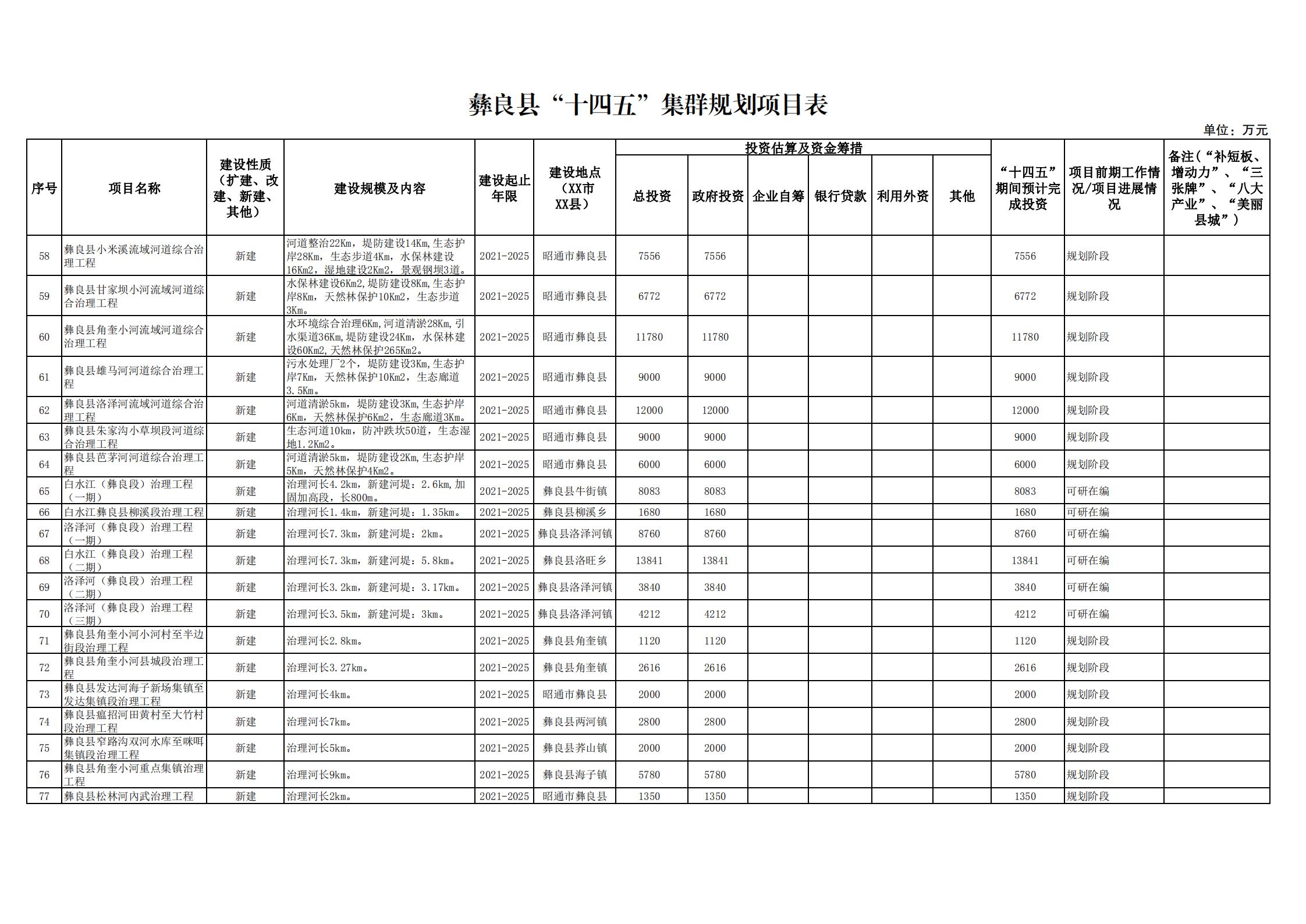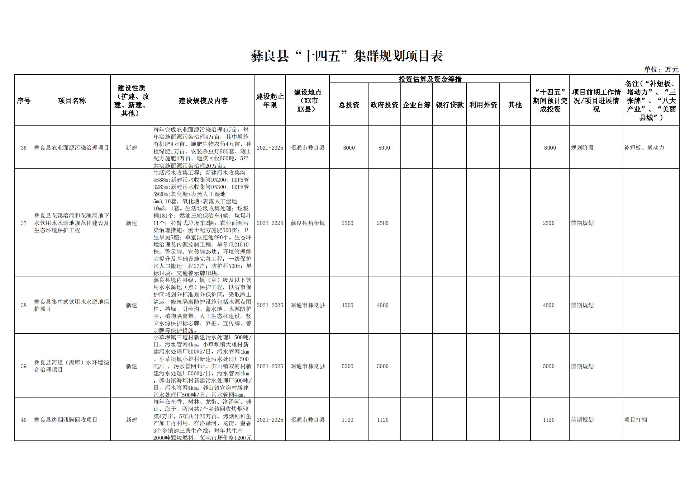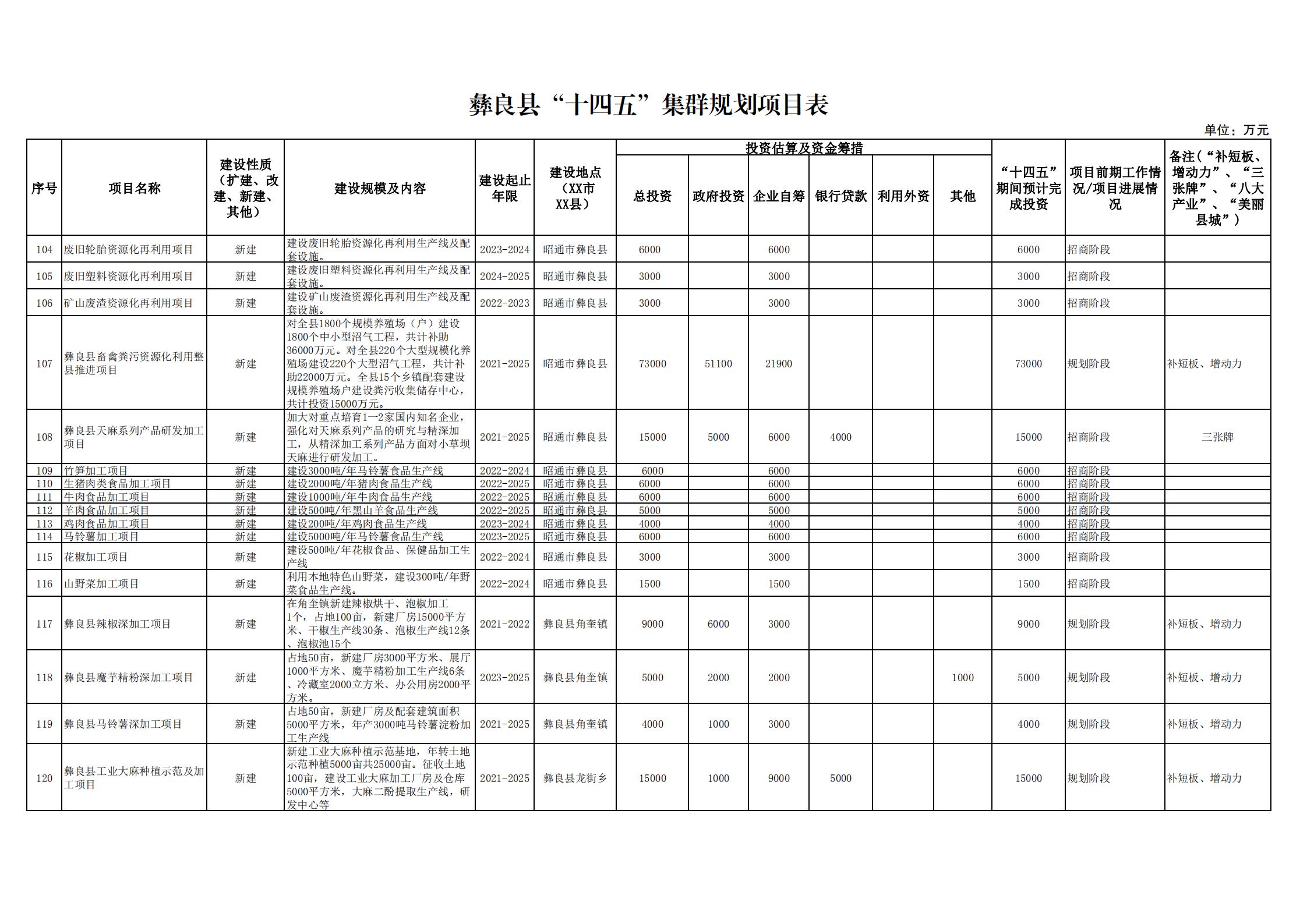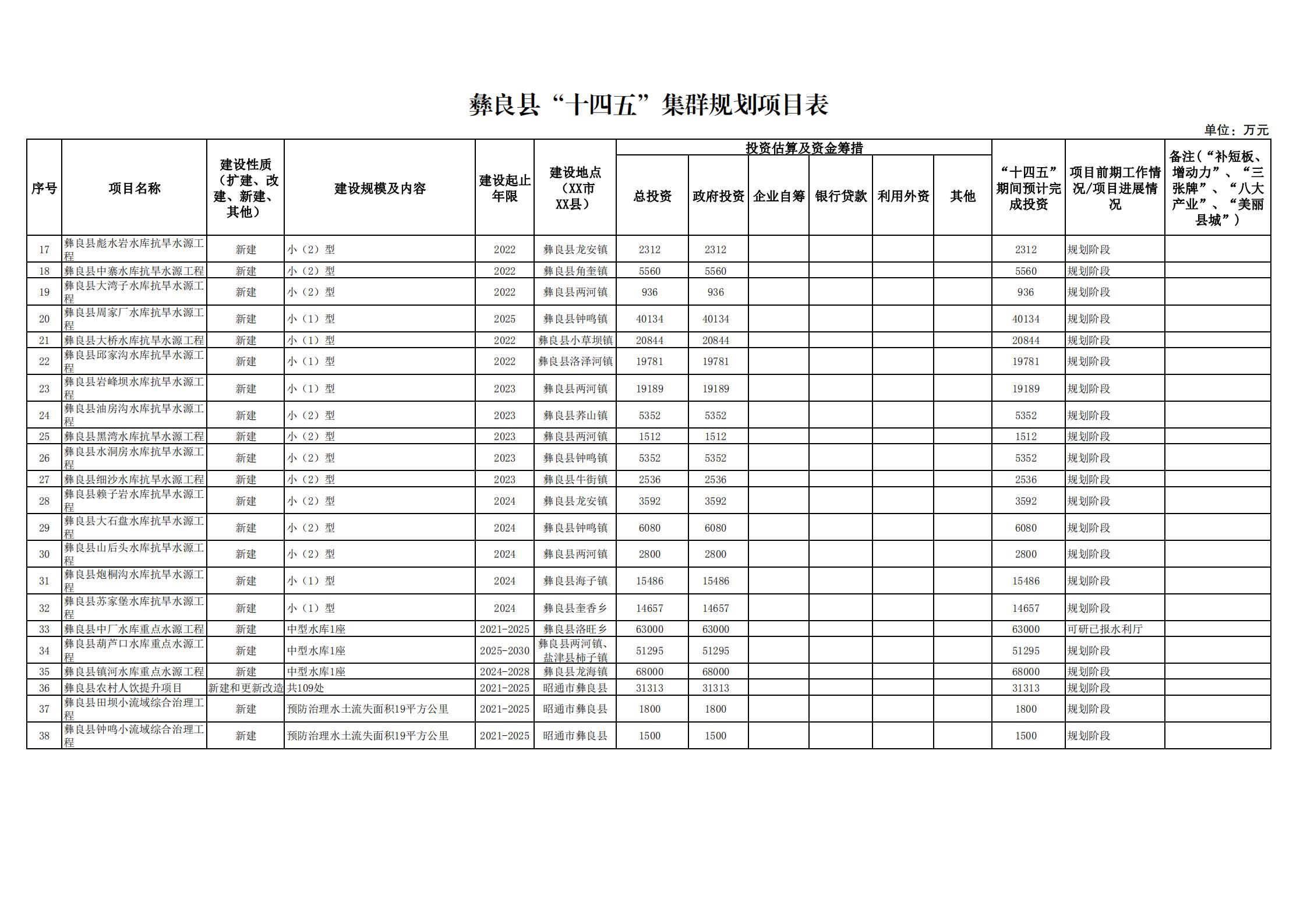 教育领域。推进彝良县村级幼儿园建设、彝良县幼儿园南校区建设、彝良县幼儿园东校区建设、彝良县角奎镇第二幼儿园建设、彝良县角奎镇第三幼儿园建设、彝良县角奎镇第四幼儿园建设、彝良县角奎镇第五幼儿园建设、彝良县角奎镇中心幼儿园建设、彝良县角奎镇新场幼儿园建设、彝良县白岩高铁新区第一幼儿园建设、彝良县白岩高铁新区第二幼儿园建设、彝良县白岩高铁新区第三幼儿园建设、彝良县角奎镇塘房小学建设、彝良县白岩高铁新区小学建设、彝良县小草坝镇小草坝村小学建设、彝良县小草坝镇宝藏村宝藏小学建设、彝良县民族小学建设、彝良县角奎镇花生地小学建设、彝良县乡村小学建设、彝良县角奎镇新场中学建设、彝良县洛旺乡中学建设、彝良县小草坝镇中学建设、彝良县洛泽河镇毛坪中学迁建、彝良县角奎镇中学迁建、彝良县角奎镇花生地中学、彝良县白岩高铁新区初级中学建设、彝良县第一中学扩建、彝良县民族中学、彝良县第四中学建设、彝良县特殊教育学校建设、彝良县乡村教师周转宿舍建设、彝良县幼儿园及中小学校设施设备购置、彝良县老年学校建设、彝良县乡镇老年学校建设、彝良县体育艺术学校建设、彝良县炳辉小学建设、彝良县义务教育能力提升、彝良县新城中学建设、彝良县学校集中改厕、彝良县职业技术高级中学建设等项目实施。 卫生领域。推进彝良县人民医院医技综合楼建设、彝良县中医医院业务用房建设、彝良县中医医院发热门诊建设、彝良县疾病预防控制中心服务能力提升、彝良县妇幼保健计生服务中心服务能力提升、彝良县中医医院中医药服务能力提升建设、彝良县疾病预防控制中心实验室、彝良县人民医院发热门诊建设、彝良县中医医院中医药特色重点专科建设、彝良县人民医院救治能力提升、彝良县应急抢救设施配置、彝良县留验站建设、彝良县体检中心业务用房建设、昭通市彝良县乡镇卫生院服务能力提升建设、彝良县中医医院救治能力提升、彝良县仁安医养一体建设、彝良县角奎镇卫生院建设、彝良县县乡医疗机构专科能力提质、彝良县人民医院奎香乡分院建设、彝良县人口健康信息化建设、彝良县第二人民医院传染病楼建设、彝良县人民医院牛街镇分院建设、彝良县村级卫生室业务用房建设及设施设备配置建设、彝良县县城医疗废水处理及固定废弃物存放室建设、彝良县120急救中心服务能力提升、彝良县中医药服务能力建设、彝良县医养一体建设、彝良县乡镇卫生院医疗废水处理及固定废弃物存放室建设、彝良县第二人民医院建设、彝良县公共卫生事件应急物资储备中心建设、彝良县人民医院小草坝镇分院建设、彝良县突发公共卫生应急处置中心业务用房建设、彝良县乡镇卫生院支医住宿建设、彝良县乡镇卫生院职工周转房建设、彝良县医疗卫生高端人才公寓建设、彝良县医疗废弃物处理转运站建设、彝良县艾滋病检验监测中心建设、彝良县医疗废弃物处理站建设、彝良县人民医院医养一体建设、彝良县海子乡中心卫生院建设、彝良县全民健康体检、彝良县基本公共卫生服务、彝良县重大公共卫生服务、彝良县卫生专业人才培养、彝良县爱国卫生运动等项目实施。 文化事业领域。推进彝良县图书文化馆提升改造、彝良县乡镇文化站建设、彝良县文化园建设、彝良县行政村(社区)综合性文化服务中心建设、彝良县罗炳辉将军纪念馆扩建、彝良县奎香长征纪念广场扩建、彝良县镇彝威地下党支部旧址修复、彝良县红二六军团指挥部旧址修复、彝良县乌蒙回旋战博物馆建设、罗炳辉将军故居提升改造、彝良县罗炳辉将军纪念馆公园、彝良县非遗保护传承展示中心、彝良县苗族传统节日场地建设等项目实施。 民政养老领域。推进彝良县社区居家养老服务中心建设、彝良县农村居家养老服务中心、彝良县小草坝康养生态园建设、彝良县城市养老服务中心建设、彝良县乡镇敬老院建设、彝良县社区服务设施建设、彝良县村(社区)公共服务综合信息平台建设、彝良县城市公益性公墓(骨灰堂)建设、彝良县农村公益性公墓(骨灰堂)建设、彝良县未成年人救助保护中心建设、彝良县中心敬老院升级改建、彝良县失能老人养护院建设、昭通市彝良县流浪乞讨人员救助管理站建设、昭通市彝良县洛旺特困人员供养服务设施(敬老院)建设、昭通市彝良县钟鸣特困人员供养服务设施(敬老院)建设、彝良县残疾人康复中心建设等项目实施。 体育领域。推进彝良县乡镇全民健身中心建设、彝良县村级体育活动场所、彝良县公共体育场建设、彝良县乒羽活动场馆建设、彝良县游泳馆建设、彝良县机动车和自行车赛道建设、彝良县青少年户外营地建设、彝良县户外体育公共设施建设、彝良县全民健身活动中心建设、昭通市彝良县体育公园建设、彝良县体育健身步道建设、彝良县小草坝镇体育健身步道建设、彝良县牛街镇体育健身步道、彝良县校园足球场建设、彝良县社会足球场建设等项目实施。 其他项目。推进彝良县创业山烈士陵园提升改造、彝良县小草坝烈士陵园改造、彝良县奎香烈士陵园提升改造、彝良县散葬烈士墓提升改造、彝良县荣誉军人休养院建设、彝良县职业技能培训基地建设、彝良县劳务创业市场基地建设