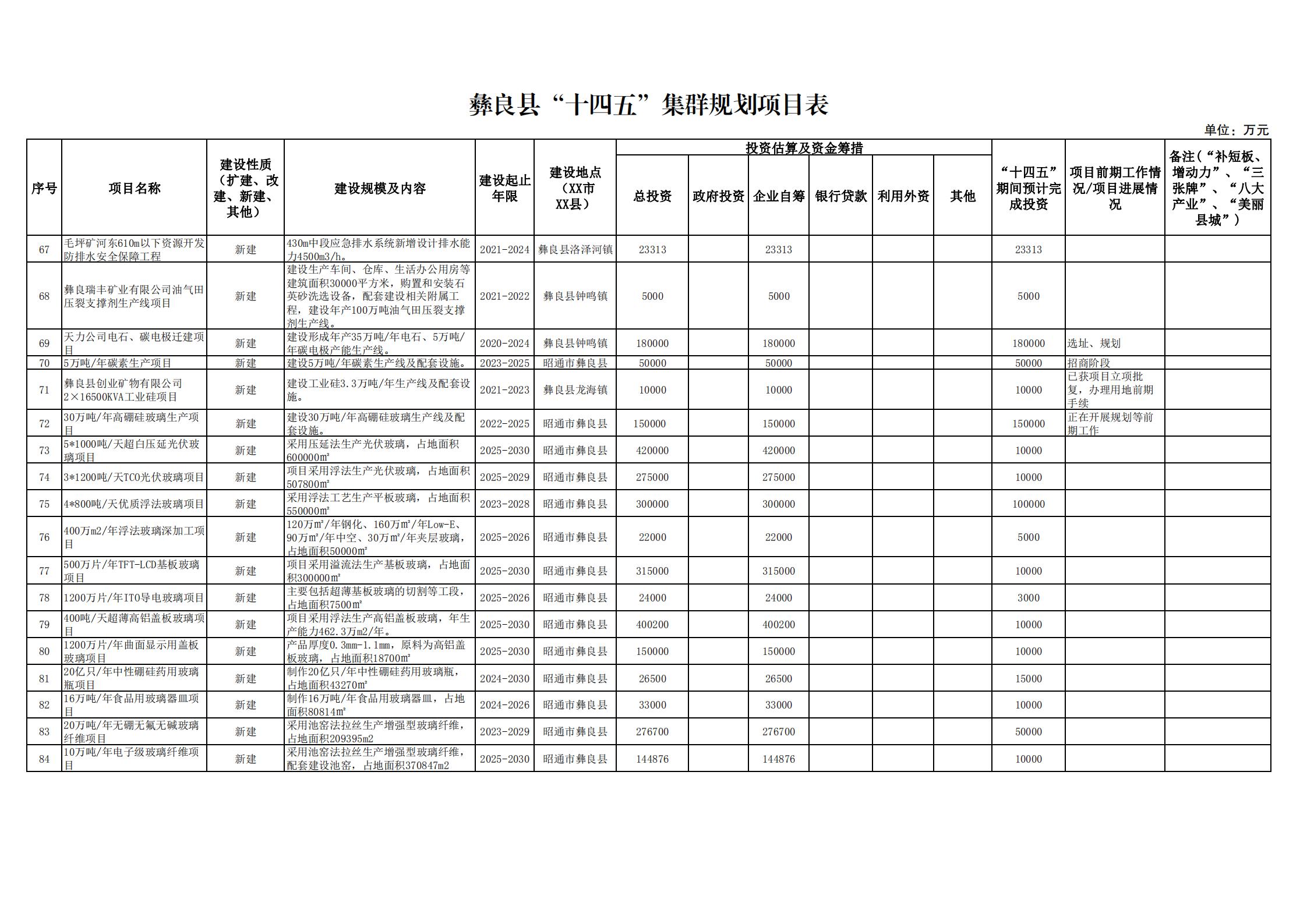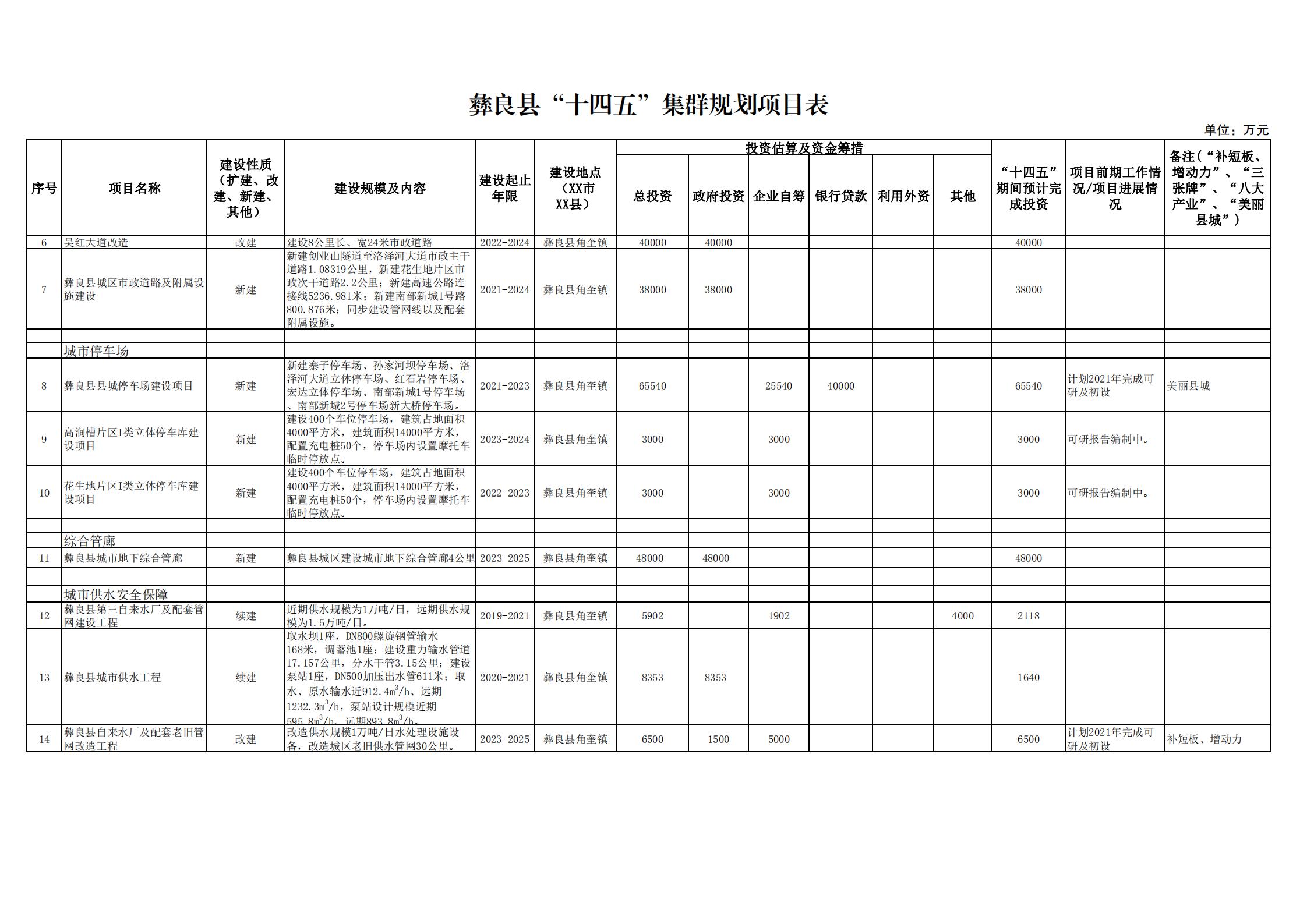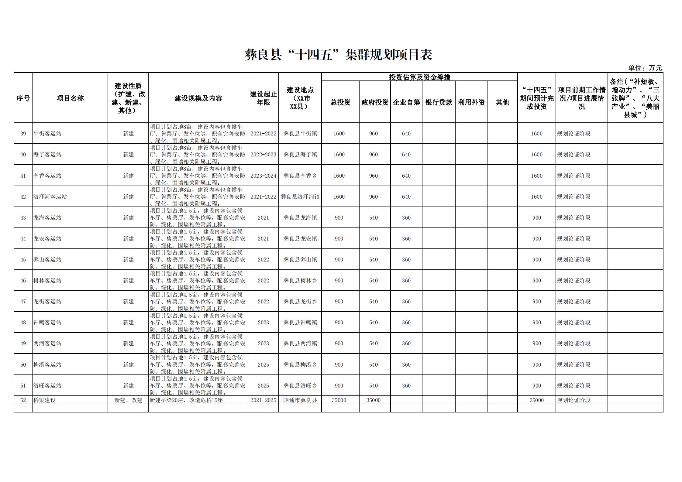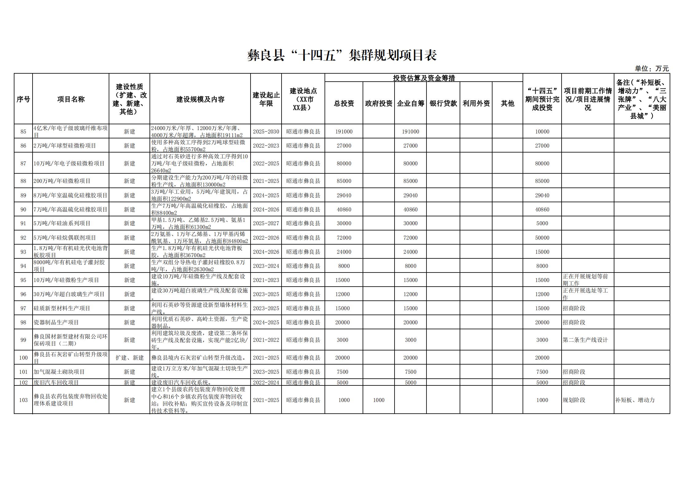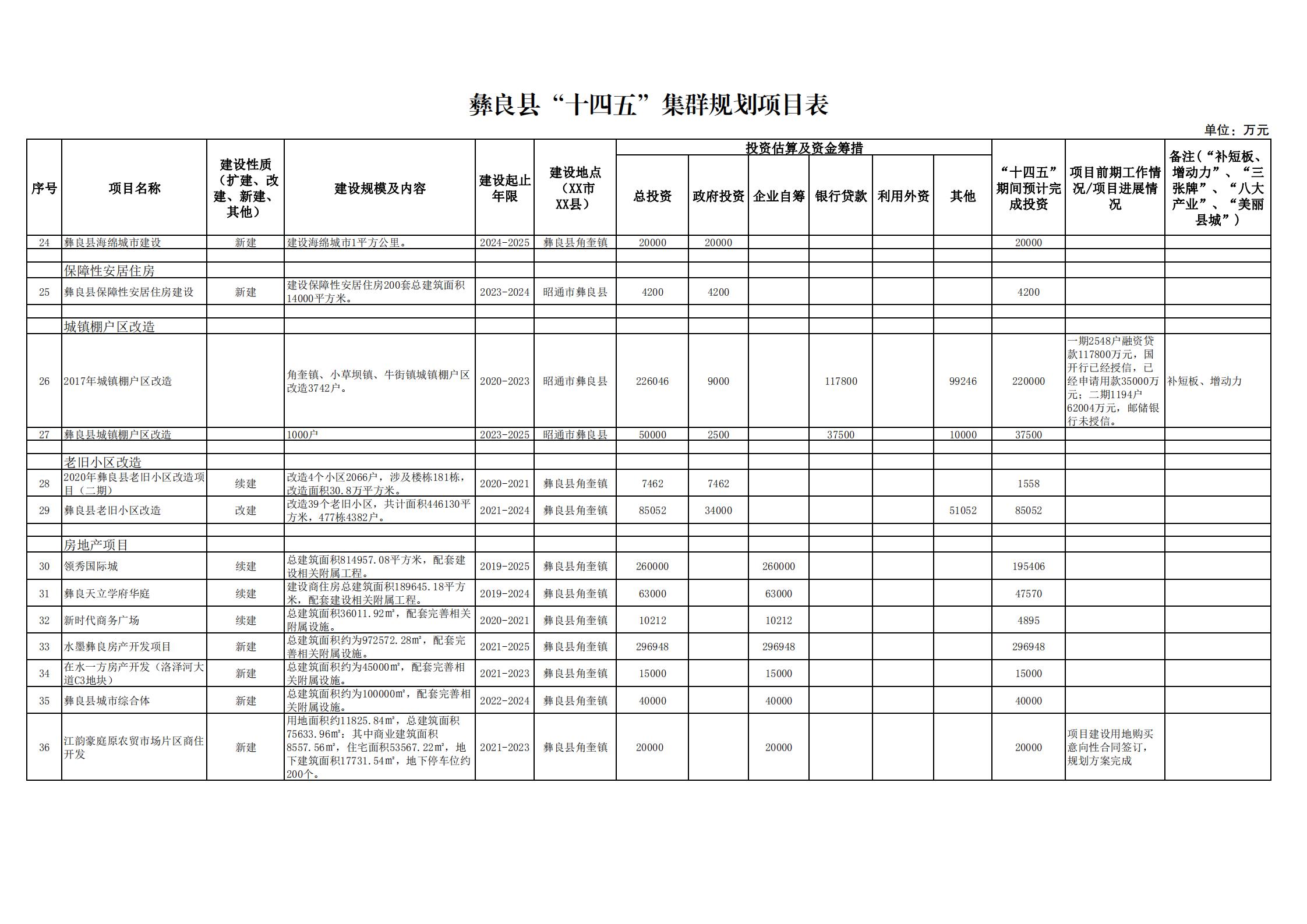 教育领域。推进彝良县村级幼儿园建设、彝良县幼儿园南校区建设、彝良县幼儿园东校区建设、彝良县角奎镇第二幼儿园建设、彝良县角奎镇第三幼儿园建设、彝良县角奎镇第四幼儿园建设、彝良县角奎镇第五幼儿园建设、彝良县角奎镇中心幼儿园建设、彝良县角奎镇新场幼儿园建设、彝良县白岩高铁新区第一幼儿园建设、彝良县白岩高铁新区第二幼儿园建设、彝良县白岩高铁新区第三幼儿园建设、彝良县角奎镇塘房小学建设、彝良县白岩高铁新区小学建设、彝良县小草坝镇小草坝村小学建设、彝良县小草坝镇宝藏村宝藏小学建设、彝良县民族小学建设、彝良县角奎镇花生地小学建设、彝良县乡村小学建设、彝良县角奎镇新场中学建设、彝良县洛旺乡中学建设、彝良县小草坝镇中学建设、彝良县洛泽河镇毛坪中学迁建、彝良县角奎镇中学迁建、彝良县角奎镇花生地中学、彝良县白岩高铁新区初级中学建设、彝良县第一中学扩建、彝良县民族中学、彝良县第四中学建设、彝良县特殊教育学校建设、彝良县乡村教师周转宿舍建设、彝良县幼儿园及中小学校设施设备购置、彝良县老年学校建设、彝良县乡镇老年学校建设、彝良县体育艺术学校建设、彝良县炳辉小学建设、彝良县义务教育能力提升、彝良县新城中学建设、彝良县学校集中改厕、彝良县职业技术高级中学建设等项目实施。 卫生领域。推进彝良县人民医院医技综合楼建设、彝良县中医医院业务用房建设、彝良县中医医院发热门诊建设、彝良县疾病预防控制中心服务能力提升、彝良县妇幼保健计生服务中心服务能力提升、彝良县中医医院中医药服务能力提升建设、彝良县疾病预防控制中心实验室、彝良县人民医院发热门诊建设、彝良县中医医院中医药特色重点专科建设、彝良县人民医院救治能力提升、彝良县应急抢救设施配置、彝良县留验站建设、彝良县体检中心业务用房建设、昭通市彝良县乡镇卫生院服务能力提升建设、彝良县中医医院救治能力提升、彝良县仁安医养一体建设、彝良县角奎镇卫生院建设、彝良县县乡医疗机构专科能力提质、彝良县人民医院奎香乡分院建设、彝良县人口健康信息化建设、彝良县第二人民医院传染病楼建设、彝良县人民医院牛街镇分院建设、彝良县村级卫生室业务用房建设及设施设备配置建设、彝良县县城医疗废水处理及固定废弃物存放室建设、彝良县120急救中心服务能力提升、彝良县中医药服务能力建设、彝良县医养一体建设、彝良县乡镇卫生院医疗废水处理及固定废弃物存放室建设、彝良县第二人民医院建设、彝良县公共卫生事件应急物资储备中心建设、彝良县人民医院小草坝镇分院建设、彝良县突发公共卫生应急处置中心业务用房建设、彝良县乡镇卫生院支医住宿建设、彝良县乡镇卫生院职工周转房建设、彝良县医疗卫生高端人才公寓建设、彝良县医疗废弃物处理转运站建设、彝良县艾滋病检验监测中心建设、彝良县医疗废弃物处理站建设、彝良县人民医院医养一体建设、彝良县海子乡中心卫生院建设、彝良县全民健康体检、彝良县基本公共卫生服务、彝良县重大公共卫生服务、彝良县卫生专业人才培养、彝良县爱国卫生运动等项目实施。 文化事业领域。推进彝良县图书文化馆提升改造、彝良县乡镇文化站建设、彝良县文化园建设、彝良县行政村(社区)综合性文化服务中心建设、彝良县罗炳辉将军纪念馆扩建、彝良县奎香长征纪念广场扩建、彝良县镇彝威地下党支部旧址修复、彝良县红二六军团指挥部旧址修复、彝良县乌蒙回旋战博物馆建设、罗炳辉将军故居提升改造、彝良县罗炳辉将军纪念馆公园、彝良县非遗保护传承展示中心、彝良县苗族传统节日场地建设等项目实施。 民政养老领域。推进彝良县社区居家养老服务中心建设、彝良县农村居家养老服务中心、彝良县小草坝康养生态园建设、彝良县城市养老服务中心建设、彝良县乡镇敬老院建设、彝良县社区服务设施建设、彝良县村(社区)公共服务综合信息平台建设、彝良县城市公益性公墓(骨灰堂)建设、彝良县农村公益性公墓(骨灰堂)建设、彝良县未成年人救助保护中心建设、彝良县中心敬老院升级改建、彝良县失能老人养护院建设、昭通市彝良县流浪乞讨人员救助管理站建设、昭通市彝良县洛旺特困人员供养服务设施(敬老院)建设、昭通市彝良县钟鸣特困人员供养服务设施(敬老院)建设、彝良县残疾人康复中心建设等项目实施。 体育领域。推进彝良县乡镇全民健身中心建设、彝良县村级体育活动场所、彝良县公共体育场建设、彝良县乒羽活动场馆建设、彝良县游泳馆建设、彝良县机动车和自行车赛道建设、彝良县青少年户外营地建设、彝良县户外体育公共设施建设、彝良县全民健身活动中心建设、昭通市彝良县体育公园建设、彝良县体育健身步道建设、彝良县小草坝镇体育健身步道建设、彝良县牛街镇体育健身步道、彝良县校园足球场建设、彝良县社会足球场建设等项目实施。 其他项目。推进彝良县创业山烈士陵园提升改造、彝良县小草坝烈士陵园改造、彝良县奎香烈士陵园提升改造、彝良县散葬烈士墓提升改造、彝良县荣誉军人休养院建设、彝良县职业技能培训基地建设、彝良县劳务创业市场基地建设