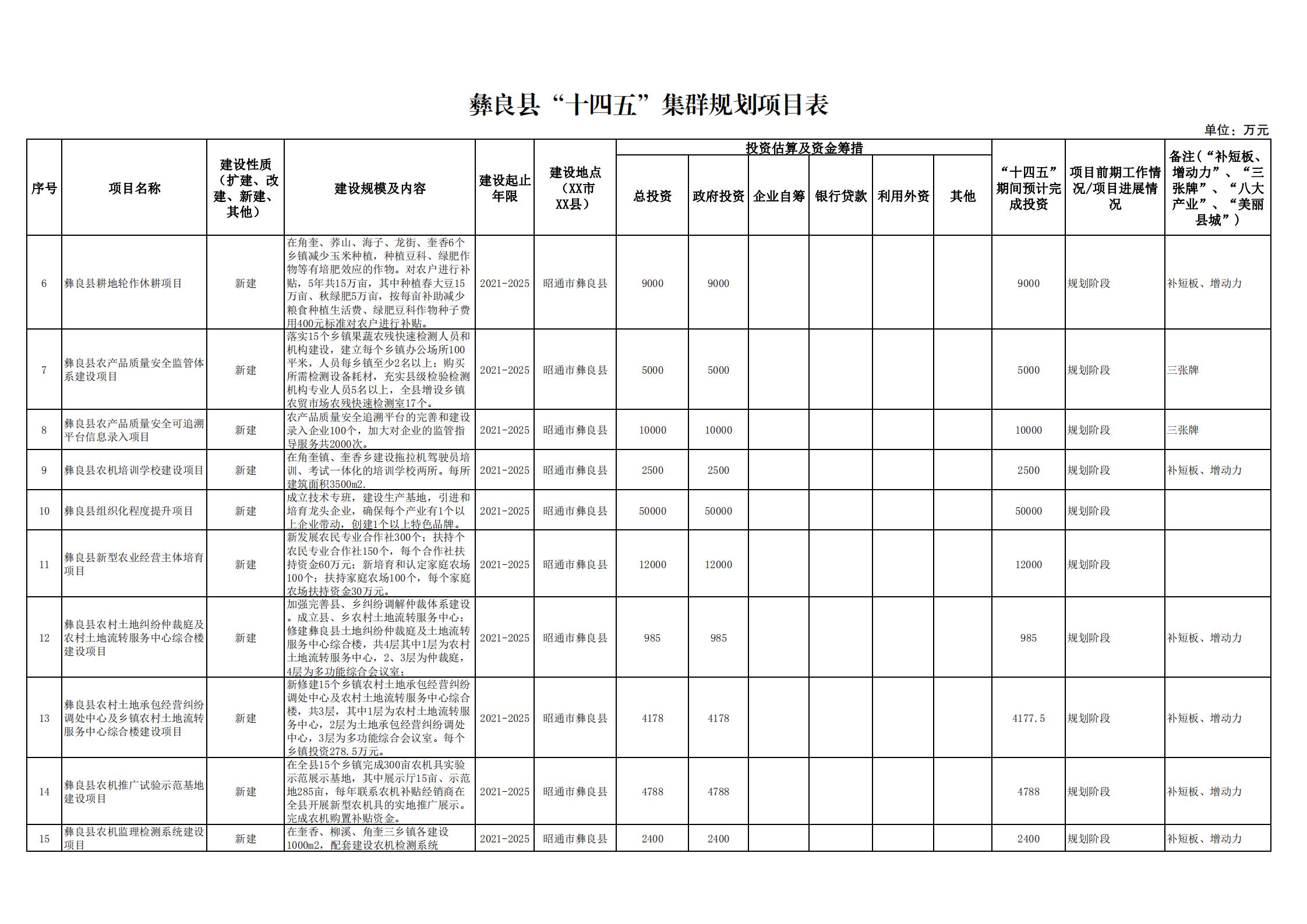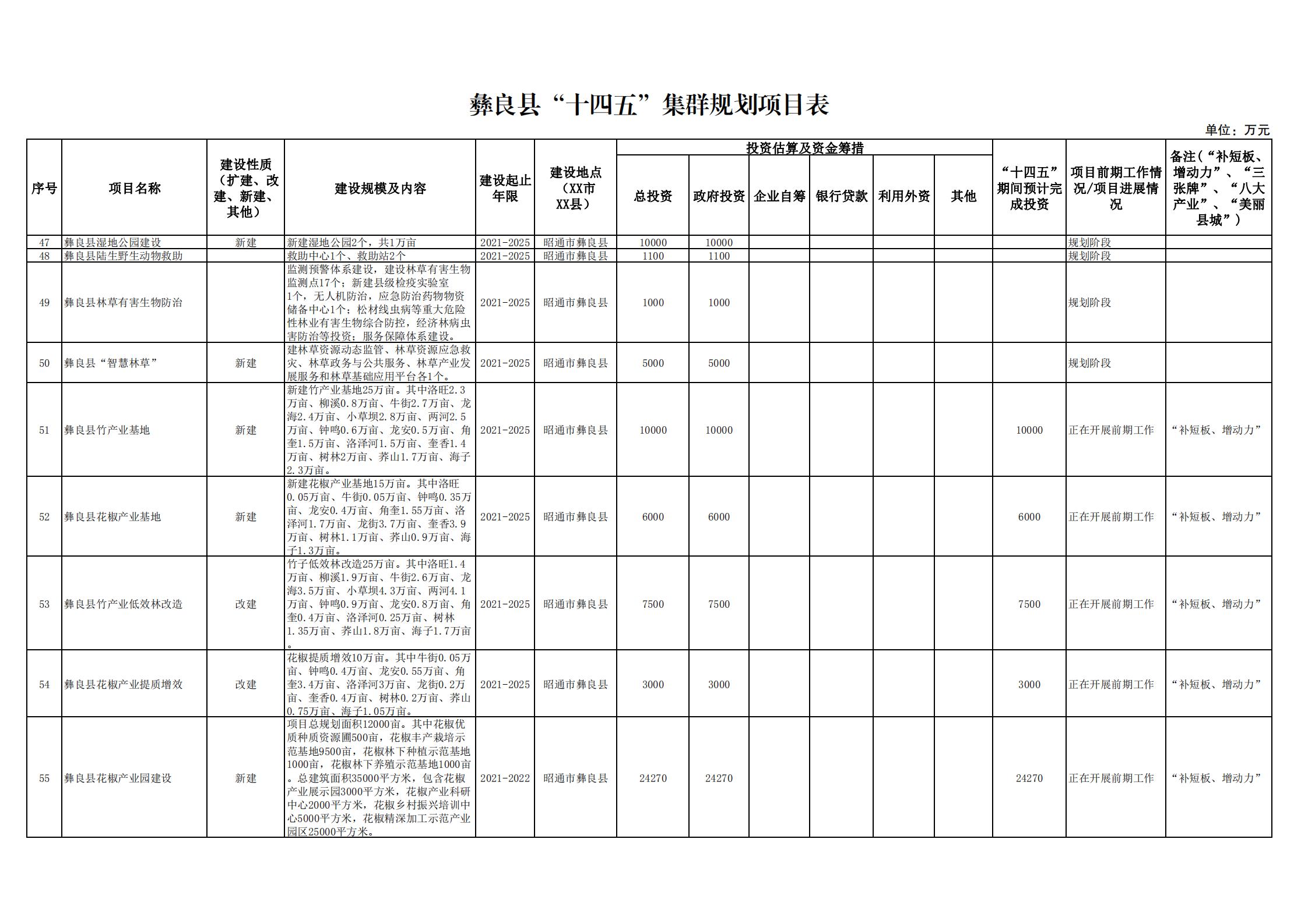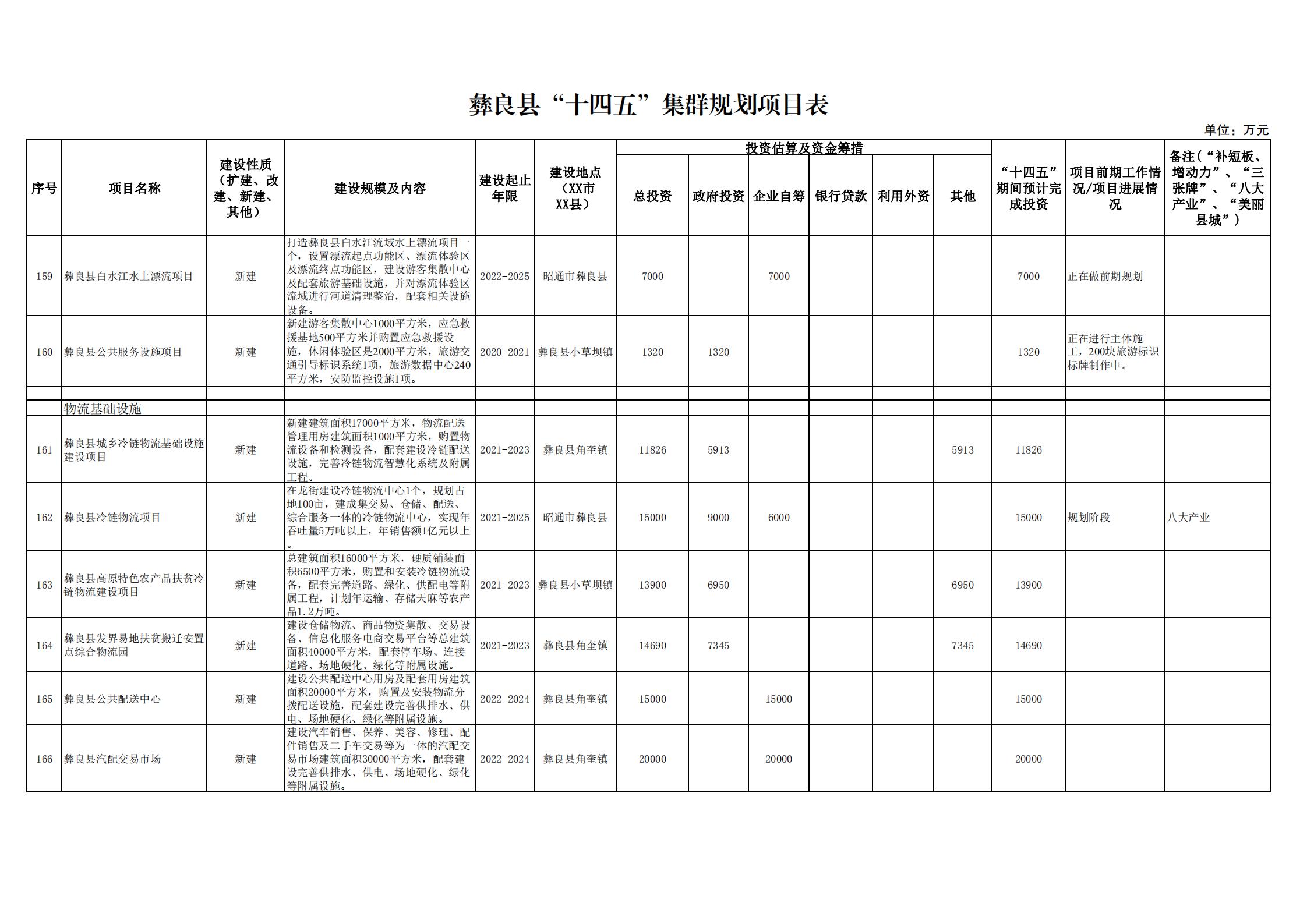 精准把握彝良发展的区域、目标定位,突出基础设施、城乡发展、公共服务、产业布局等重点,大力提升基础设施互联互通水平,补齐农业农村、公共安全、生态环保、社会民生、医疗卫生、物资储备、应急救援、防灾减灾等领域短板,围绕新型城镇化、乡村振兴、城乡区域协调发展、产业升级、生态安全等领域,谋划和推动渝昆高铁彝良站至小草坝高速公路、中厂水库等一批重大工程和重点项目建设,夯实经济社会高质量跨越发展基础。