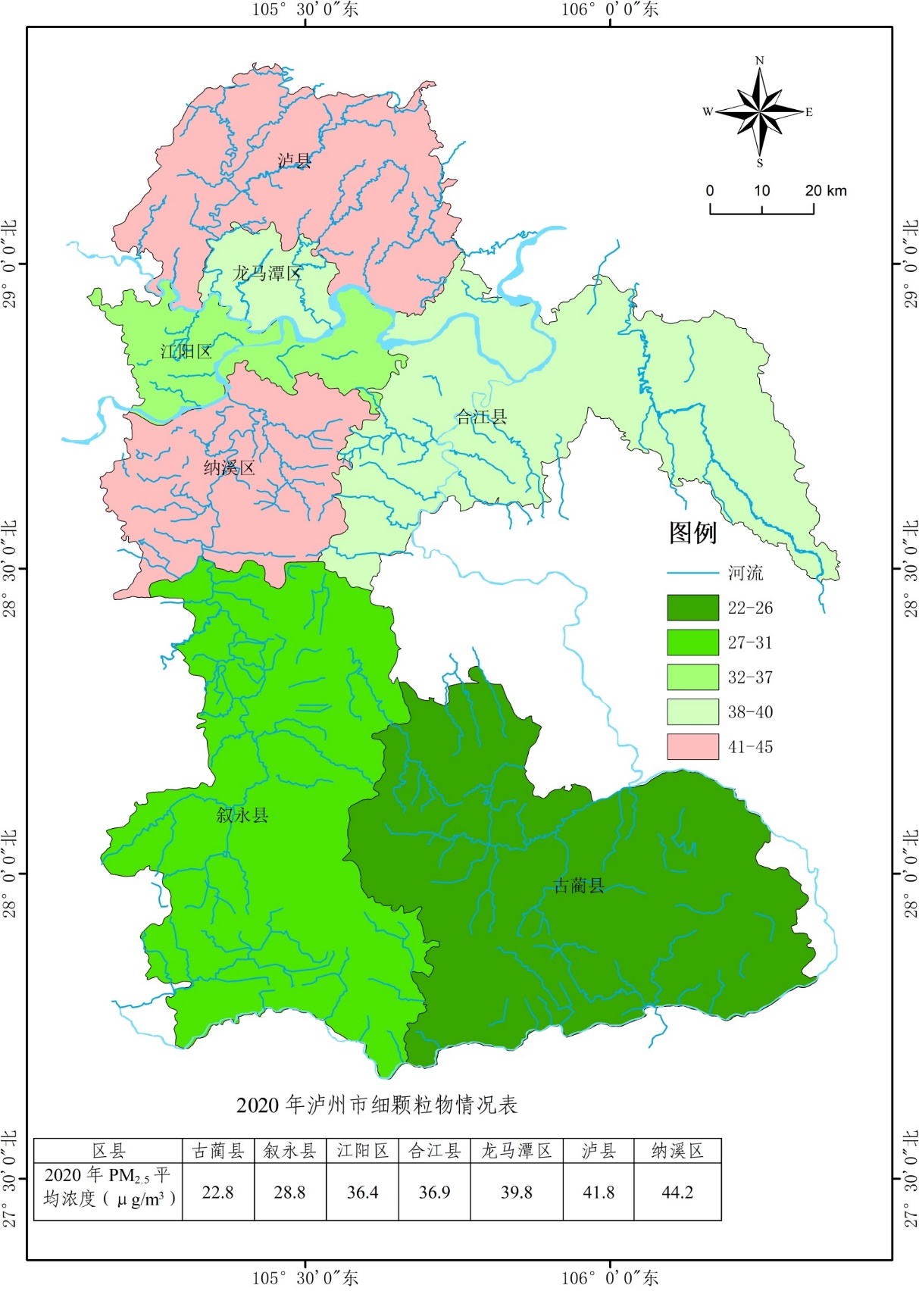 附图8 泸州市2020年PM2.5浓度分布图
