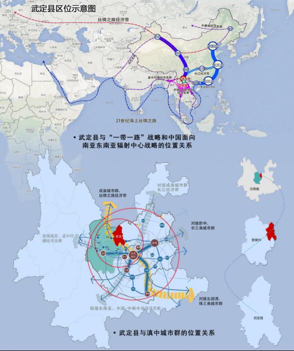 习近平总书记考察云南重要讲话为武定经济社会发展指明了方向。2015年1月、2020年1月,习近平总书记两次考察云南,提出“一个跨越”“三个定位”“五个着力”和“四个突出特点”要求,科学指明了云南在全国发展大局中的战略定位,为云南改革开放和社会主义现代化建设提供了根本遵循和行动纲领,同时也为武定经济社会发展提供了指引。国家新发展格局重要历史性机遇。全面服务和融入以国内大循环为主体、国内国际双循环相互促进的新发展格局,将充分激发武定人口、区位、资源等要素活力,挖掘市场潜力,提升科技创新能力,延伸产业链条,全面提高对内对外开放水平,为畅通县域经济循环带来历史性机遇。国家实施系列重大战略和多重重要政策红利叠加带来的机遇。国家持续深入推进“一带一路”、孟中印缅经济走廊、中国─中南半岛经济走廊、面向南亚东南亚辐射中心、长江经济带发展等重大区域协调发展战略,深入推进实施新时代西部大开发、特殊类型地区振兴发展、“两新一重”建设、乡村振兴重点帮扶县集中重点帮扶等系列重大政策,为武定加快发展带来了更多重大政策支持机遇。全省推进区域协调发展和打造重点产业战略带来的机遇。省委、省政府推进5个万亿级产业和8个千亿级产业,打造世界一流“三张牌”,推进“美丽县城”建设、美丽公路建设、特色小镇创建等,以及省委、省政府将武定产业园区作为全省优化提升保留的48个省级开发区之一,武定区位优势、枢纽地位和投资洼地效应将进一步显现。楚雄实施“双核引领”战略带来的机遇。州委、州政府加快打造禄武产业新区核心引擎,推进楚东禄丰武定城镇群,推动永仁─武定经济带发展,构筑金沙江流域生态屏障,为武定对外连接昆明、攀西经济区、成渝双城经济圈双向融入开放发展、主动服务和融入长江经济带建设带来了新的发展机遇。