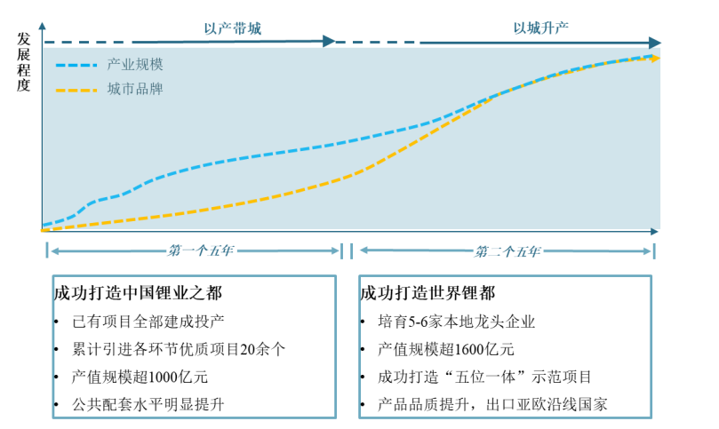 按照“上游关键材料生产全球领先,中游电池产品制造全国一流,建成全国重要的锂电新能源终端应用基地”总体目标,从“规模、结构、创新、合作”等方面着力,打造中国最具竞争力的锂材料产业集聚区、锂产品集成区、锂电新能源终端模式创新示范区、先进锂电产学研一体化建设区、产业体系建设引领示范区等,加快建设“世界锂都”,让锂电及新材料产业成为全市经济发展的先导产业和未来经济发展的支柱产业。