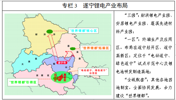5.全产业链协作配套。坚持因地制宜全面协同发展,支持遂宁经开区依托电子信息产业基础,重点引进锂电池及构件项目,推动锂电终端运用产业发展。支持大英经开区发展锂电关键材料、化学材料,如电池化学材料、电解液及溶剂、助剂、粘合剂等。支持市河东新区发展数字经济和培育产业人才,推进组建锂电新能源大数据中心IDC等项目,为锂电大数据产业赋能,建设锂电产业人才服务中心和培训基地。