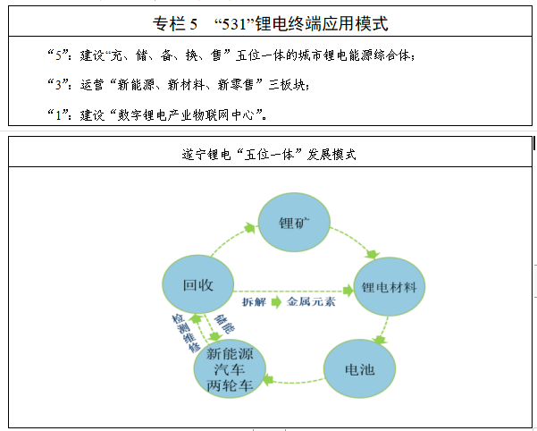 4.电池材料回收。努力提高各种锂资源的再生利用价值,实现锂矿资源的可持续利用。推动废旧电池的循环再利用和对废旧电池材料物质拆解回收利用,加强与中国铁塔、威马汽车等龙头企业合作,推进新锂想、青圣环保等锂电池回收项目建成投产,加快建设锂电池回收综合利用示范基地和动力电池梯级利用产业基地。