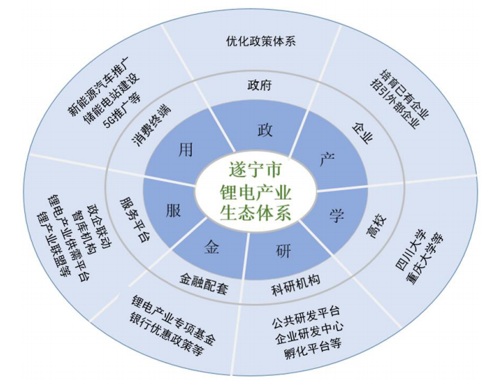 5.营商环境持续优化。国家实施成渝地区双城经济圈建设发展战略,新能源、新材料等产业迎来重大利好机遇。省委、省政府大力支持遂宁锂电产业发展,支持动力电池骨干企业开发高性能锂电池、铁镍电池、固态电池等,提升动力电池核心技术的工程化和产业化能力,给予遂宁锂电等特色优势产业到户电价不高于0.35元/千瓦时的优惠政策。市政府出台《遂宁市加快工业转型升级推动制造业高质量发展若干政策》《遂宁市支持科技成果转化若干政策》《遂宁市支持锂电产业加快发展若干政策》等,支持锂电项目加快建设和企业高质量发展。与四川区域协同基金共同设立30亿元锂电新能源产业基金,成立全省首个锂产业联盟等,与重庆大学共建“重庆大学锂电及新材料遂宁研究院”,初步形成锂电产业全生命周期服务能力。