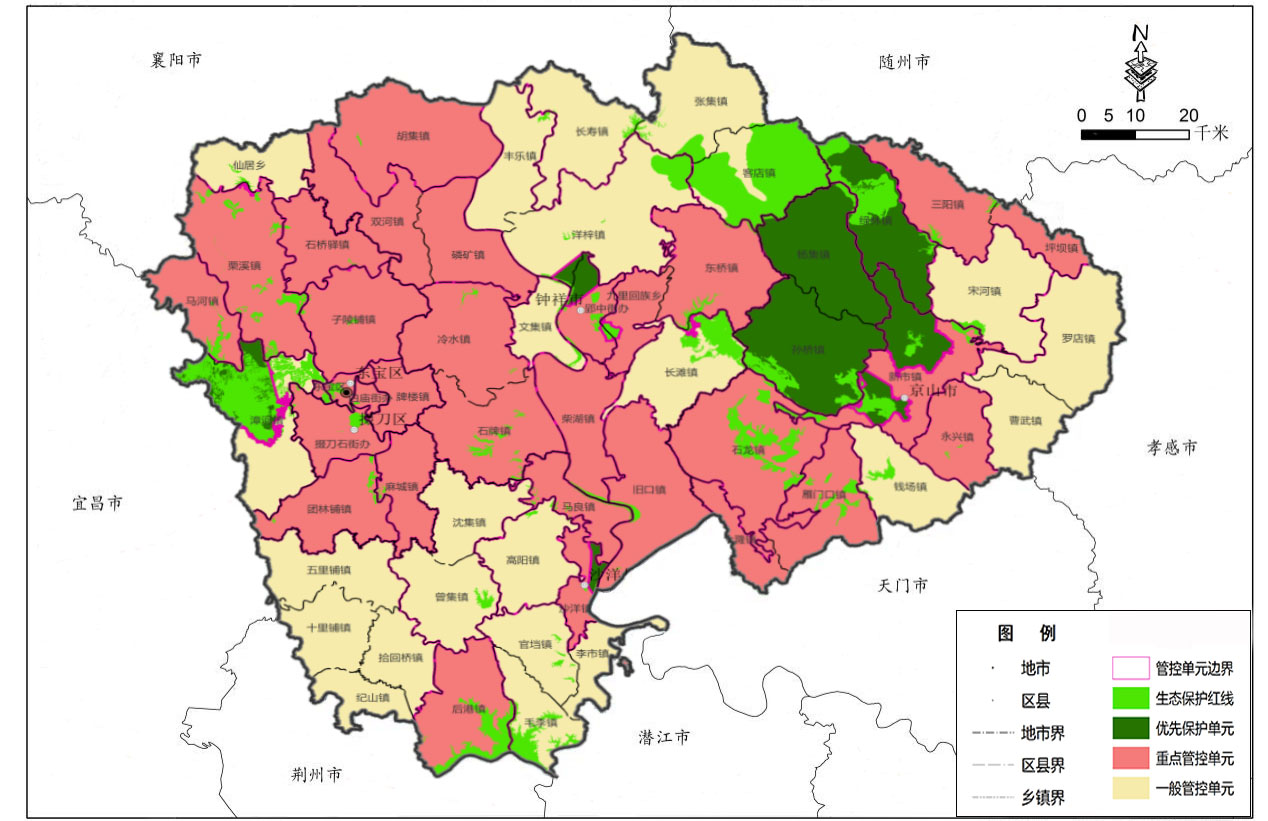 落实“三线一单”硬约束。按照生态环境分区管控体系, 加强对全市11个优先保护单元、25个重点管控单元、13个 一般管控单元的分类管控,推进精细化治理。推动“三线一单”成果在部门、区域间共享共用,实现“三线一单”编制成果与各部门相关工作的有机融合。将“三线一单”确定的生态环境管控单元及准入清单作为区域内产业布局、结构调整、资源开发、城镇建设、重大项目选址、规划环评、生态环境治理与监管的重要依据。建立健全“三线一单”成果实施评估和监管机制,积极谋划荆门市“三线一单”信息管理平台建设并与省级平台对接。