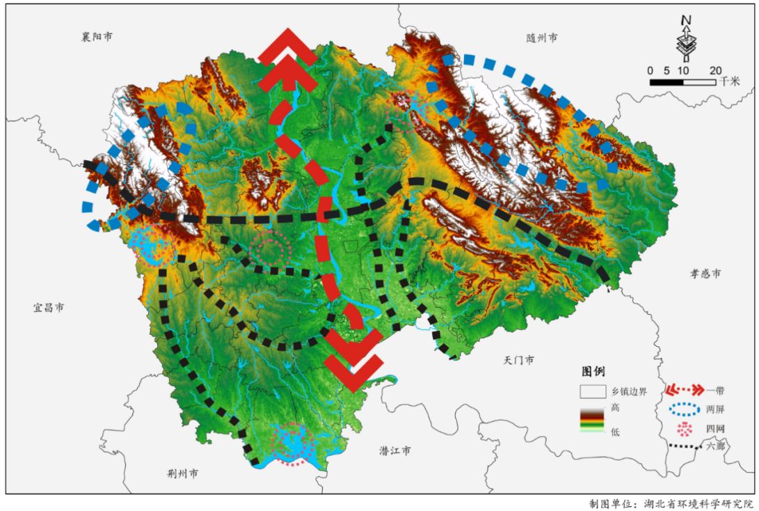 严守生态安全格局。以汉江荆门段、荆山、大洪山、漳河水网、长湖水网、温峡水网、杨竹流域水网为基本骨架,筑牢“一带两屏四网六廊”生态安全格局,以乡镇为基本单元,实施生态安全分区管控。严格落实国土空间规划功能分区、空间布局、分区管控要求,推动省级层面重点开发区域(东宝区、掇刀区)、综合农业发展区(京山市、钟祥市、沙洋县、屈家岭管理区、太子山林场)高质量发展,加大水土保持生态功能区(京山对节白蜡省级自然保护区、漳河国家湿地公园等)保护力度。
