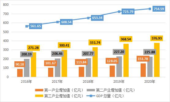 图1:2016-2020年雅安市GDP及一、二、三产业增加值变化图(单位:亿元)