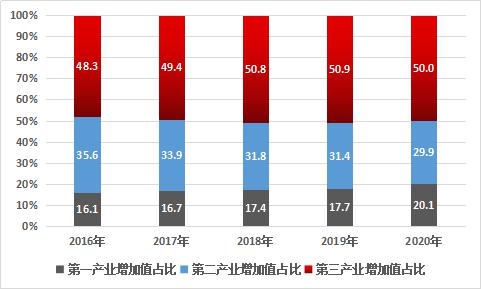 (一)总体实力不断提升。“十三五”期间,雅安市服务业蓬勃发展,成为拉动全市经济增长的重要驱动力。全市服务业增加值由2016年的271.28亿元增加到2020年的376.93亿元,总量始终保持在三次产业中的第1位,全市服务业增加值占GDP比重由2016年的48.3%提升至2020年的50.0%,服务业在全市经济中的龙头地位更加突出。“十三五”期间,雅安市服务业增加值保持较快增速,平均增速居全市三次产业之首,高于全国、全省服务业平均增速,其中2019年雅安市服务业增速9.7%,增速居全省第3位,2020年受新冠肺炎疫情影响增速为3.9%,仍高于全省服务业增加值平均增速0.5个百分点。