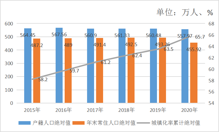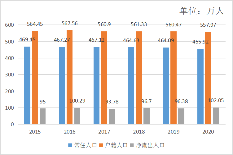人口净流出速度加快。常住人口由2015年的469.45万人下降到2020年的455.92万人,减少13.53万人,年均减少2.71万人。净流出人口由2015年的95万人增加到2020年的102.05万人,净流出人口有不断增加的趋势。