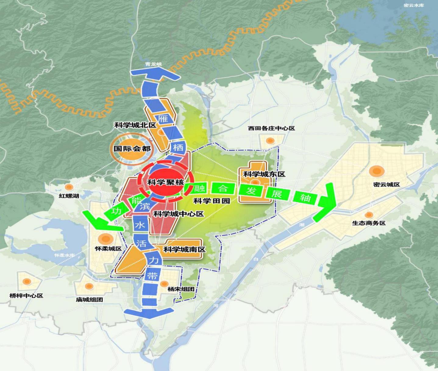 怀柔科学城建设取得全面突破,科学城党工委、管委会正式成立,工作机制逐步健全。北京怀柔综合性国家科学中心成功落户,成为国家重点打造的综合性国家科学中心之一。《怀柔科学城规划(2018年-2035年)》发布实施,科学城详规等一批支撑性规划落地实施,核心区土地一级开发全面完成。科技设施集群正在形成,高能同步辐射光源、脑认知功能图谱、材料基因组等29个科学设施全部开工建设。“怀柔一号”科学卫星成功发射。北京雁栖湖应用数学研究院、纳米能源与系统研究所、清华工研院雁栖湖创新中心、空间宇航技术产业研究院等一批新型研发机构、硬科技孵化器、创新创业平台落地运行,北京怀柔仪器和传感器有限公司挂牌落地,以中科院、高校、企业为主体的科技创新生态初步形成。对外科技交流合作继续深化,国家科学中心国际合作联盟、“一带一路”国际科学组织联盟正式落户。科学城城市框架扎实起步,“远看是花园、近看是家园”的新型城市形态建设有序拉开,城市配套设施持续推进,一零一中学怀柔校区扩建、怀柔医院二期、城市客厅A地块、雁栖国际社区、凯利特公寓等项目全面加快建设。雁栖湖国际会都(以下简称“国际会都”)功能不断完善,扩容提升工程扎实推进,雁柏山庄主体结构完工,融创项目回购完成,栖湖组团实现供地;重大国事活动常态化服务保障机制不断完善,圆满完成两届“一带一路”国际合作高峰论坛等重大国际会议服务保障任务,成功举办世界心血管大会、首届雁栖人才论坛,五年累计举办各类会议会展活动2.8万余场次,成为首都北京的城市“金名片”。中国(怀柔)影视产业示范区(以下简称中国影都)建设取得新成效,北京电影学院新校区一期竣工,制片人总部基地、博纳影业总部等项目稳步推进,影视人才社区和星悦雅园开工建设,成功举办五届北京国际电影节及电影嘉年华,启动“来影都过周末”系列活动。