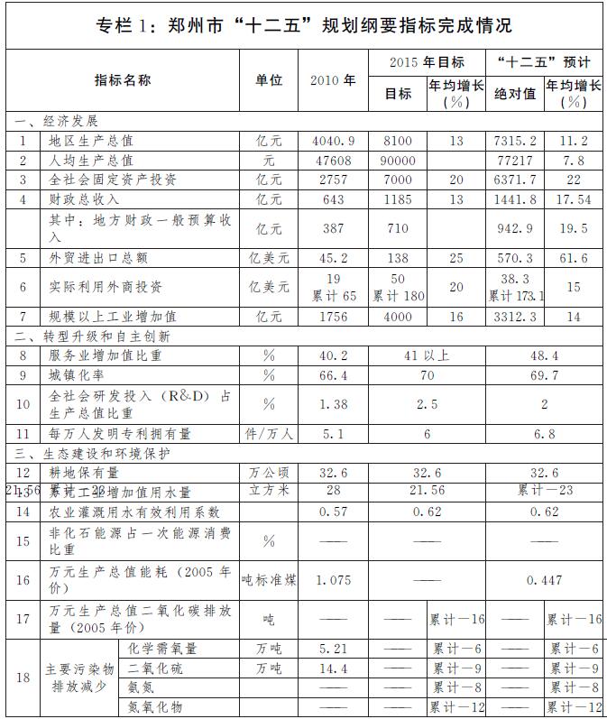 “十二五”时期是郑州发展史上极不平凡的五年。面对极为错综复杂的发展形势,全市上下认真贯彻党的十八大和十八届三中、四中、五中全会精神,在省委、省政府的正确领导下,落实四个全面战略布局,围绕“三大一中”战略定位,坚持以郑州航空港经济综合实验区建设为统揽,突出“三大主体”工作,深入实施开放创新双驱动战略,一心一意谋发展,凝心聚力促转型,抢抓机遇求突破,完善机制抓落实,全市经济社会实现了持续健康快速发展,较好完成了“十二五”规划主要目标任务。郑州的发展迈上了新台阶,实现了新跨越,站在了新起点。