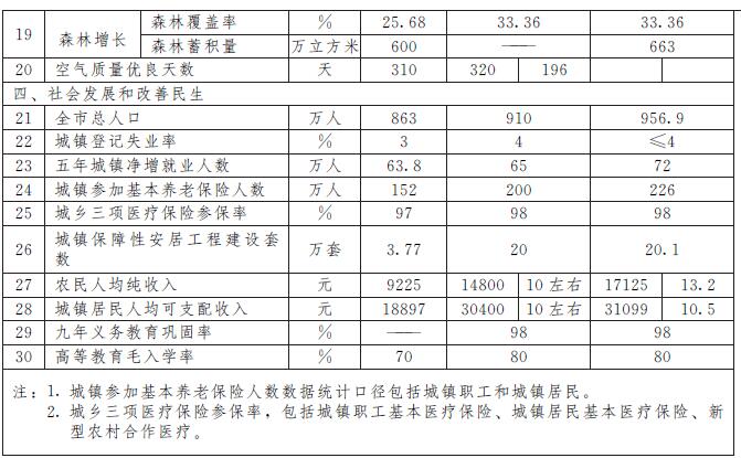 人民生活水平进一步提高:确保全市全面消除贫困,实— 16 —现更加充分就业,力争居民收入水平与经济发展同步提升。城市基本公共服务体系更加完善,学有优教、病有良医、老有舒养、住有安居、出有畅行、游有美景,提升群众获得感、幸福感和城市归属感。