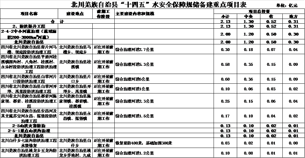 北川羌族自治县“十四五”水安全保障规划项目总投资约50.63亿元,“十四五”期间计划完成投资约20.75亿元,其中防洪减灾2.03亿元、民生水利工程14.77亿元、水资源开发利用工程3.43亿元、水土保持项目0.37亿元、行业能力建设0.15亿元。(2021年计划投资4.52亿元;2022年计划投资6.79亿元;2023年计划投资5.79亿元;2024年计划投资2.76亿元;2025年计划投资0.89亿元)。