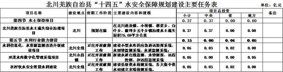 附表1:北川羌族自治县“十四五”水安全保障规划建设主要任务表