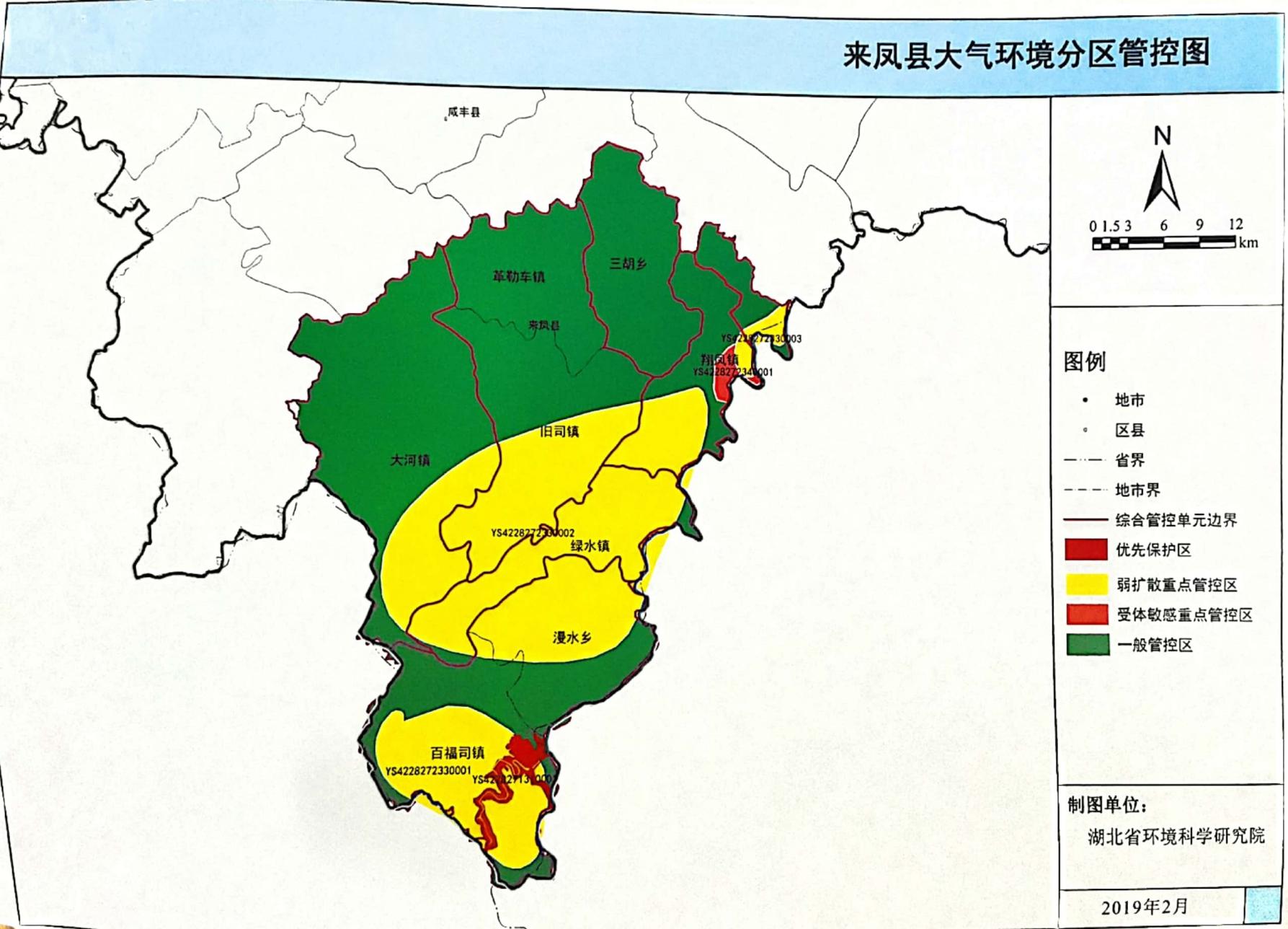 不得在大气环境弱扩散区,新建大气污染严盘的企业及居民点、学校、医院等敏感点。 | / | / | 大气 | 大气环境弱扩散重点管控区 YS4228272330003 来凤县弱扩散区Ⅲ 20.40% 大气环境受体敏感重点管控区 YS4228272340001 来风县居民区 1.16% | 2017年来凤县PM2.5超标,单元内有弱扩散区 | 《湖北省环境保护“十三五”规划》、《建设项目主要污染物排放总量指标审核及管理暂行办法》 | ||||||||