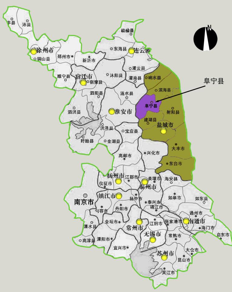阜宁县隶属江苏省盐城市,背倚苏北平原,面临苏中水网,南与建湖县毗邻,北与滨海县接壤,东与射阳县相连,西与淮安市涟水县隔废黄河相望,西南与淮安市楚州区交界。县域位于江苏省中部偏东,地处江淮之间,里下河腹部,介于东经119°27′49″~119°58′22″,北纬33°26′52″~33°59′22″之间,南北长52.5km,东西宽48km,总面积1439km2,列盐城市9个县(市、区)第6位,其中:陆地面积1087 km2,水域及滩地面积352 km2。阜宁县辖13个镇,4个街道及两个社区,总耕地面积883.20 km2,2020年末户籍总人口110.34万。