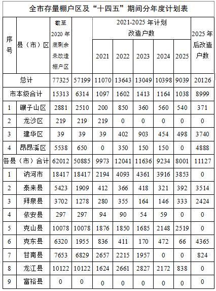 全市计划改造棚户区5.7万户、完成总量的74%。其中:市本级(南四区)计划改造0.63万户,完成市本级(南四区)总量的41%;各县(市)计划改造5.09万户,完成县(市)总量的82%。