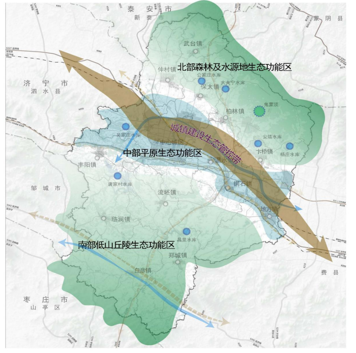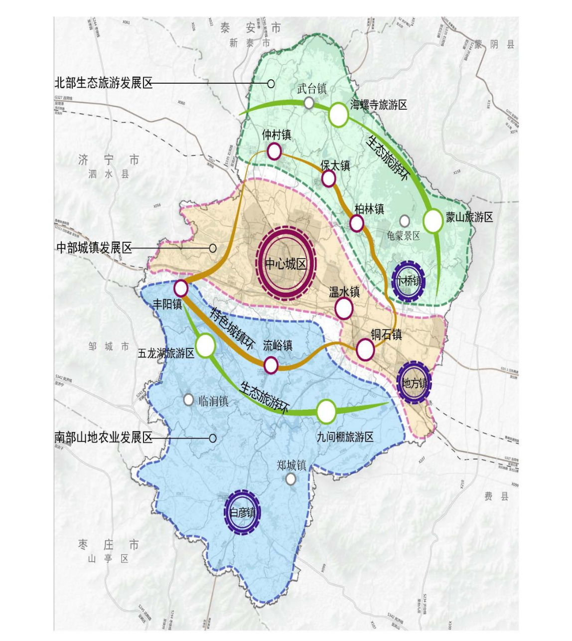 “双环三区”:“双环”指围绕中心城区的“特色城镇环”和串联各大景区的“生态旅游环”。“特色城镇环”,通过国、省道串联中心城区外围的温水镇、铜石镇、保太镇、仲村镇,各镇根据自身资源条件和产业特色进行差异化发展。“生态旅游环”,以蒙山旅游区、九间棚旅游区、海螺寺旅游区、五龙湖旅游区等主要景区为旅游主体,以自然、人文景观为旅游要素,构建柏林镇、地方镇、郑城镇、流峪镇、丰阳镇串联的县域生态旅游环。“三区”分别指以平邑街道、铜石镇和地方镇为代表的“中部城镇发展区”,武台镇、柏林镇为代表的“北部生态旅游发展区”,流峪镇、郑城镇、临涧镇、丰阳镇为代表的“南部山地农业发展区”,三区协同联动,构筑全域空间发展大格局。