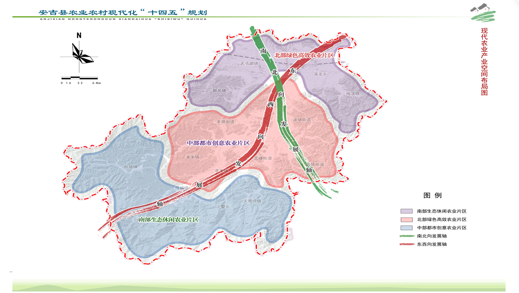 深入推进农业供给侧结构性改革,推动主导产业和特色农产品向优势区域集中,优化“三区两轴”的现代农业产业空间布局,即南部生态休闲农业片区、北部绿色高效农业片区、中部都市创意农业片区和东西向发展轴、南北向发展轴。南部生态休闲农业片区包括天荒坪镇、山川乡、上墅乡、报福镇、章村镇、杭垓镇等西南部山区,要注重竹产业转型升级,大力发展竹林林下经济,构建生态笋竹、高山果蔬(药)、绿色畜牧等生态农业体系,做大做强“生态笋竹种植-笋竹加工-竹木家具-竹海观光”产业链,并积极开发休闲农业和森林康养产业,努力打造生态休闲农业发展示范区。北部绿色高效农业片区包括天子湖镇、梅溪镇、溪龙乡、鄣吴镇等地区,要以笔架山农高区建设为核心,以安吉白茶、绿色渔业、功能粮食等为重点,做大做强农(林)产品精深加工业,深化“生态种植-精深加工-品牌经营-茶旅融合”的安吉白茶全产业链建设,打造现代高效农业发展引领区。中部都市创意农业片区主要包括县中心城区、孝丰镇等地区,要引导城郊乡村重点发展都市农业、休闲农业、创意农业,打造城乡融合发展的都市创意农业样板区。注重交通廊道的带动作用,构建现代农业对外开放主通道,高效串联各发展片区,形成以申嘉湖高速、省道S306为主的东西向发展轴,以杭长高速、国道G235为主的南北向发展轴。
