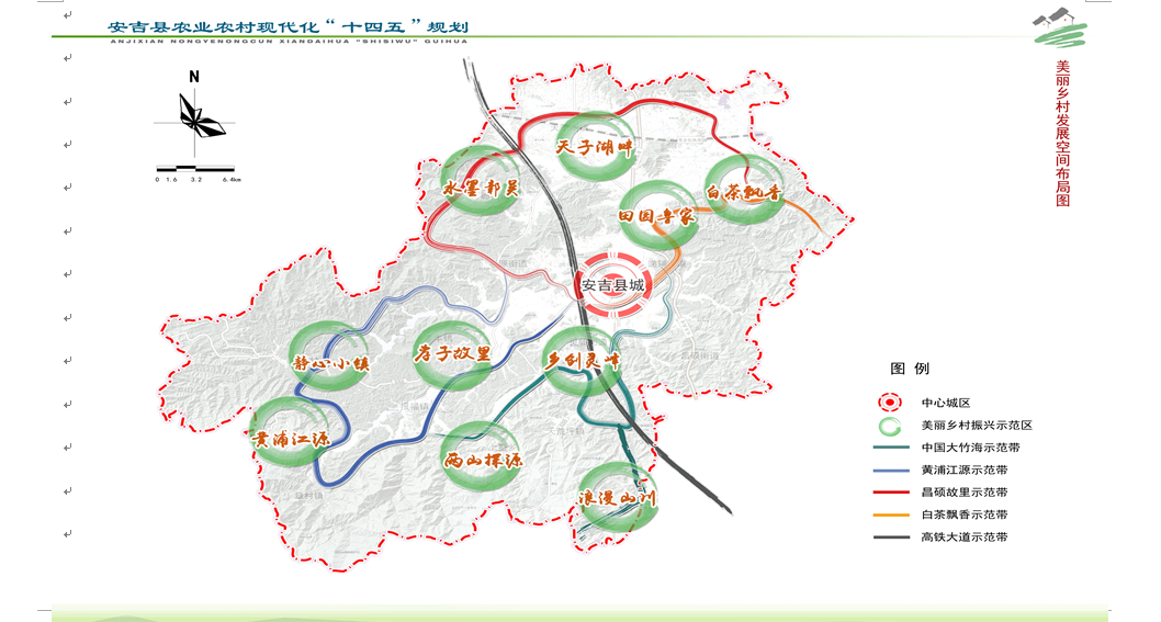 根据安吉的自然资源、人文禀赋、产业状况,以及187个美丽乡村的现实基础和发展潜力,结合安吉县城乡空间发展布局,构建“五带十区多点”的新时代美丽乡村发展空间新格局。打造“黄浦江源”“中国大竹海”“白茶飘香”“昌硕故里”“高铁大道”等五条美丽乡村振兴示范带,串点成线、串珠成链,充分展示现有的新时代美丽乡村精品示范村、经营示范村、治理示范村创建成果。打造“两山探源”“浪漫山川”“白茶飘香”“孝子故里”“田园鲁家”“天子湖畔”“黄浦江源” “乡创灵峰”“水墨鄣吴”“静心小镇”等十大美丽乡村振兴示范区,在全面发展的同时突出各个示范区的特点和主题,彰显点上精致、业态丰富、乡村智慧、治理有效,形成产业高质高效、乡村宜居宜业、农民富裕富足,区块带动力强的示范区。打造一批在全省具有标杆意义的高标准未来乡村。