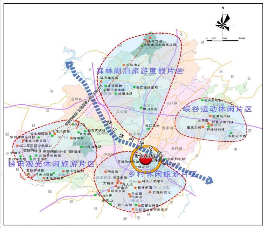 中央《建议》明确提出,加快发展健康、养老、文化、旅游等服务业,构建医养、康养相结合的服务体系;省委《建议》明确提出,推动文化和旅游融合发展,推进健康湖南建设。立足新化丰富的旅游资源和深厚的人文底蕴,以“蚩尤故里•神韵梅山”为目标统领,着力构建“一心·一带·两翼·四片区”的文旅发展新格局,即以县城(上梅古镇)为中心,资江生态廊道为纽带,紫鹊界梯田农耕文化康养旅游区、大熊山蚩尤文化生态旅游区为两翼,西部片区—梯田观光休闲旅游区、北部片区—森林湖泊旅游度假区、东部片区—峡谷运动休闲区、南部片区—乡村休闲旅游区“四片区”,打造大梅山文化旅游圈。打造优质良好的全域旅游质量和形象,加快提升新化全行业、全区域、全民众的旅游服务意识和服务水平,实现新化旅游由观光旅游向休闲度假旅游的转变,将新化整体打造成中国大梅山国际康养度假文旅目的地。