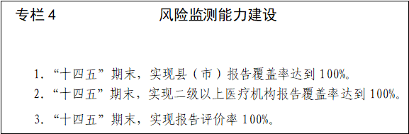 (五)提升风险监测覆盖面。推进县(市)药物警戒监测评价机构建设,加强“两品一械”不良反应(事件)监测哨点建设,形成以主动监测、风险监测、专业评价为主体的评价体系,力争“十四五”末,实现县(市)报告覆盖率达到100%,二级以上医疗机构报告覆盖率达到100%,报告评价率100%。