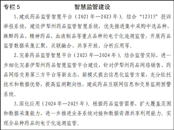 (二)完善智慧监管。建成伊犁州药品智慧监管及追溯平台。通过药品(疫苗)电子追溯监管、非现场监管等重点应用不断推动药品传统监管方式向信息化监管和智慧监管转变,提升监管效能,以信息化来引领实现伊犁州直药品安全监管现代化。