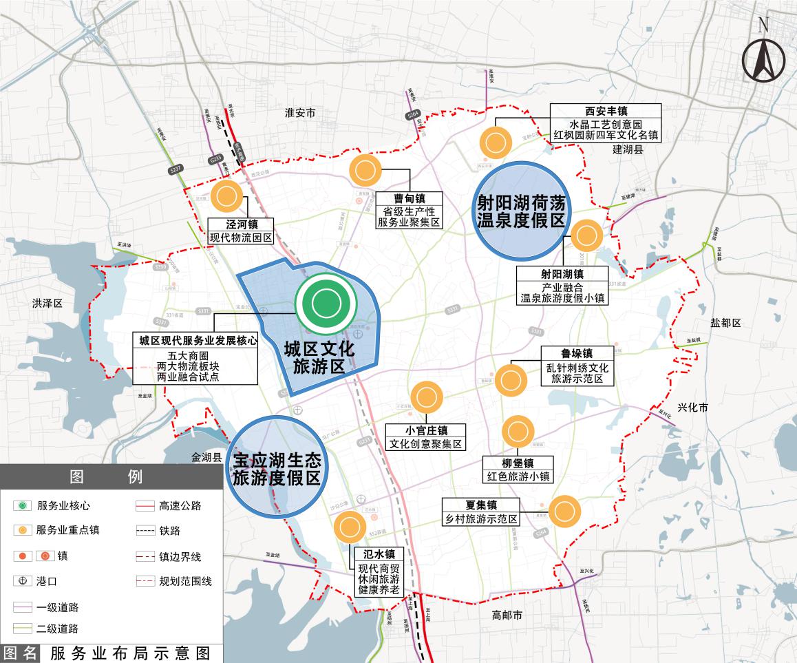 ——“多点联动”。即氾水、曹甸、射阳湖、夏集、柳堡、鲁垛、小官庄、泾河、西安丰等服务业特色产业重点镇。氾水镇主要发展现代商贸、休闲旅游、健康养老等产业。曹甸镇重点打造教玩具为特色的省级生产性服务业集聚区板块。射阳湖镇重点加快一二三产业融合示范园、温泉旅游度假小镇建设。夏集镇建设以桃花源、景坤园为重点的乡村旅游示范区。柳堡镇建设以“二妹子国防园”为载体的红色旅游小镇。鲁垛镇打造以乱针绣产业为特色的文化旅游示范区。小官庄镇打造以圣诞礼品产业为主导的文化创意集聚区。泾河镇建设以韵达江苏省智慧电商区域总部为重点的区域综合性智慧物流基地。西安丰镇打造水晶工艺创意园和红枫园新四军文化名镇。