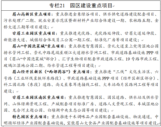 支持眉山高新区和甘眉工业园区争创国家级园区。做强眉山高新区,以创建国家级高新技术开发区为目标,对标国内领先的国家级高新区,努力建设特色产业全球领先、创新能力区域一流、开放协同全省示范的现代化科技园区,力争2025年营业收入突破1000亿元。做大甘眉工业园区,以创建国家级经济技术开发区为目标,推进“新区”引领带动、“老区”强化支撑、“新城”功能完善,力争2025年营业收入突破1000亿元。打造特色产业园区。加快推进千禾调味品产业园建设,以千禾味业为核心,引进生产加工、旅游及上下游配套企业集聚发展,打造产业特色鲜明的高品质园区。加快建设眉州东坡·世界川菜园、宝能眉山大食品产业园、中明环保循环经济产业园等专业产业园区。