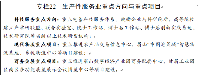 推动三大生产性服务业向专业化和价值链高端延伸。创新发展科技服务业。充分发挥东坡泡菜产业技术研究院、泡菜质检中心等科技服务平台的示范引领作用,重点发展技术研发、产品检验检测与认证、科技测试、技术转让、质量技术监督等科技服务,鼓励建设面向产业的各类科技公共服务平台。积极发展现代物流业。利用两大国际机场、高铁、高速公路等便捷的交通网络,大力发展现代物流业。加强仓储物流建设,打造以产业园区为核心、重点集镇为支点,城乡联动、共建共享的现代物流体系。支持企业利用互联网技术加快构建物流信息公共服务平台。大力发展商务会展。继续高水平举办中国泡菜食品国际博览会、东坡庙会等本土知名会节活动,引进专业化、市场化团队运营好眉山会展中心。用好成都市打造“国际会展之都”的辐射和溢出效应,积极承接和争取全国性知名节会在东坡区举办,构建融展览、会议、节事、商贸活动为一体的大会展生态圈。积极承接成渝地区知名展会,打造成渝地区知名会展中心。
