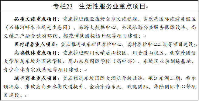 推动六大生活性服务业向高品质和多样化升级。推进全域旅游发展。以争创天府旅游名县、省级全域旅游示范区、国家文明旅游示范区为抓手,进一步提升旅游基础设施及公共服务配套设施。持续推进“研学游”“会展游”“康养+”“旅游+”“文旅+”融合创新,打造一批文化特色鲜明的品牌旅游线路,建设东坡文旅经济发展核心区。抓好《少年苏东坡传奇》城市IP的全渠道推广、实体产业对接、IP授权共享、文创人才培育等工作,多角度立体式塑造独具东坡文化基因的城市符号。稳步发展医疗康养。挖掘“东坡养生文化”内涵,以眉山经开区新区(“西部药谷”)、岷东新区为核心,推动健康产业集聚发展;探索“1+N”城市养老服务模式,加强社区配套设施建设,重点发展养老、医疗保健和病患陪护等服务业态。加快发展高端教体。以岷东新区为核心,加快推进四川大学眉山校区等项目建设,吸引更多高等院校落户东坡。积极发展体育赛事,持续举办东坡马拉松等重大赛事活动,促进竞技体育可持续发展;大力推动健身休闲、技能培训、场馆服务等体育产业发展。探索“协会+比赛”举办高水平体育专项赛事,打造城市新名片。建立成眉体育产业联盟,建设一批国家级专业场地,推动体育项目合作和竞技人才交流培养。协同申办国际国内高水准体育赛事。转型发展城市商业。优化中心城区商圈布局,完善城市核心商务功能,加快城市高端酒店配套建设,积极引进连锁经营总部和采购中心,努力培育扩大消费市场,打造眉州文化村华灯集、东坡商业水街等主题鲜明、服务高端、管理有序的特色商业街。突出发展特色餐饮。全力提升“食在四川、味在东坡”品牌影响力,突出“中国川厨之乡”美誉,依托眉州东坡·世界川菜园等平台,建设“川味”产业集群核心区,做大做强以眉州东坡、马旺子等为代表的餐饮企业,打造川菜名城。加快发展品牌家政。实施家政产业“倍增”计划,培育具有区域引领和示范效应的家政企业,把“苏小妹”打造成为立足川渝、辐射全国的知名家政服务品牌。