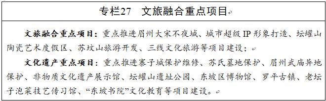 加强文物保护利用,积极申报国家级、省级文物保护单位。加强三苏祠、大旺山白塔、罗平古镇、报恩寺、蟆颐山重瞳观、苏坟山等古建筑及文物保护与修复,启动坛罐山遗址公园和博物馆建设。加大对东坡民俗、民间艺术、传统工艺、老字号、名特产等非物质文化遗产的保护、传承和利用力度,组织专业力量进行包装营销,让东坡文化“活”起来、“走”出去。开展乡村非物质文化遗产资源调查,建设非遗数据库;以老坛子泡菜传统制作技艺、巧巧核桃糖传统制作技艺传习基地为示范,推动泡菜、传统医药、泥塑、木雕、火绘、剪纸等传习发展。探索非遗与企业文化融合,打造东坡特色研学线路。
