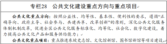 完善公共文化设施。加快形成布局合理、覆盖城乡、惠及全民的公共文化设施网络,推进公共文化服务“补短板”行动。高质量完成第三轮东坡区志编撰工作,建成东坡史志馆。进一步完善提升区、镇、村三级公共文化阵地,支持东坡书院等文化阵地建设,弘扬东坡文化。推进区图书馆达到部颁一级标准,区文化馆达到部颁三级以上标准。镇(街道)文化站、村(社区)文化室设置率达到100%,设施建设、设备配置、人员配备、管理服务等达到国家相关标准。统筹建设集宣传文化、党员教育、科技普及、普法教育、体育健身等多功能于一体的基层综合文化服务中心,配套建设群众文化活动广场。完善文化馆图书馆总分馆制建设,推进区级总馆、镇级分馆、村级服务点三级联动。健全政府向社会力量购买公共文化服务机制,鼓励和支持社会力量通过兴办实体、资助项目、赞助活动、提供设施、捐赠产品等方式提供公共文化服务。