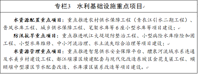 依托长征渠调水工程,加快晋凤水库建设,优化水资源配置。续建青衣江引水工程,推进东风支渠、蟆颐堰等中型灌区续建配套与节水改造项目,实施“万口当家塘”等小型水源工程。加强城乡供水管网设施建设,改造一批陈旧落后的城乡供水设施,推进城西片区、北部新城等区域供水管网及配套设施建设。推进农村供水保障与安全饮水巩固提升工程,持续提升农村饮水保障能力。到2025年,基本实现城乡集中供水全覆盖,饮水水质达标率100%。