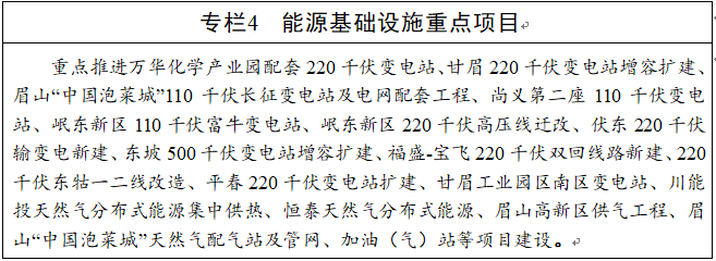 优化电网规划及结构,加快智能电网建设,推进输电、变电、配电、用电、调度等环节智能化建设,提升电网智能化水平,构建稳定可靠的东坡电网。加强对岷东新区、崇礼新城、北部新城、眉山高新区、甘眉工业园区等重点区域用电保障,加大配网建设和提升改造力度,推进万华化学产业园配套220千伏变电站、眉山“中国泡菜城”110千伏长征变电站等新建项目和东坡500千伏变电站、眉山甘眉220千伏变电站、岷东新区110千伏富牛变电站等增容扩建重点工程。实施城市老旧小区和农村电网升级改造工程,提高城乡电网供电的可靠性和稳定性。