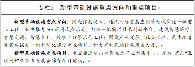 突出顶层设计,加强统筹协调,强化5G、人工智能、物联网、大数据、工业互联网等新型信息技术在各领域的推广应用,开展智慧交通示范、智慧能源联网、智慧水利提档、数字市政升级等融合应用工程。以启迪眉山科技城等项目为重点,扩大5G场景应用,强化5G在贸易服务、线上教育、智慧医疗、智慧交通、智慧医保、智慧农业等应用。