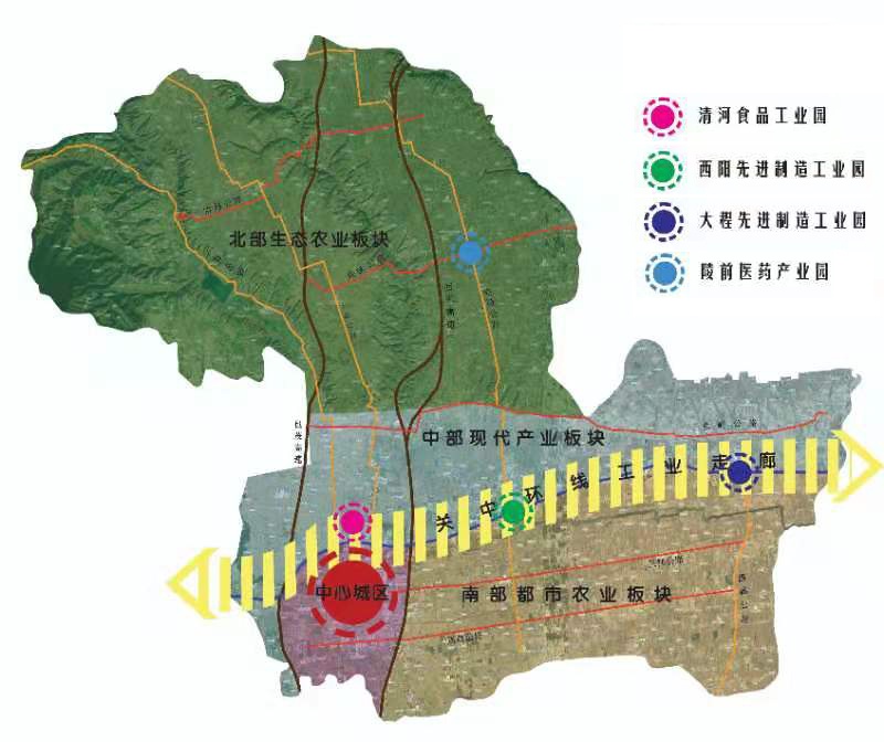 “一廊”即关中环线工业走廊,东起大程,西至城关,东西长约20公里,以绿色食品、先进制造、新型建材为重点,建设特色工业园区,打造现代产业集群。